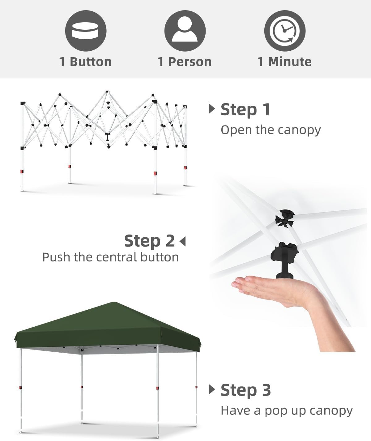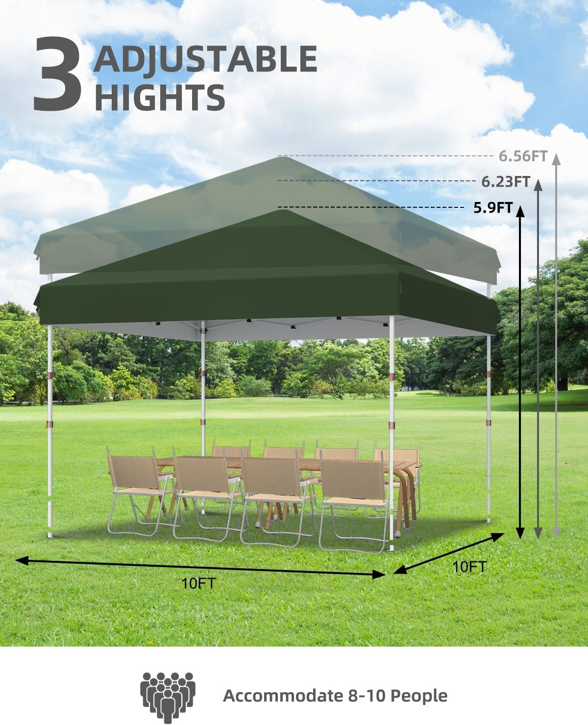 The 10×10 pop-up canopy features a one-button setup for easy installation by one person, adjustable height, and includes a portable roller bag, weight bags, stakes, and guy ropes. Made from durable 210D Oxford fabric with rust-resistant metal trusses, it blocks 98% of UV rays. Ideal for various outdoor activities like camping, picnics, and sports, this canopy is easy to store and carry. It comes with a comprehensive packing list and excellent after-sales service for any concerns.