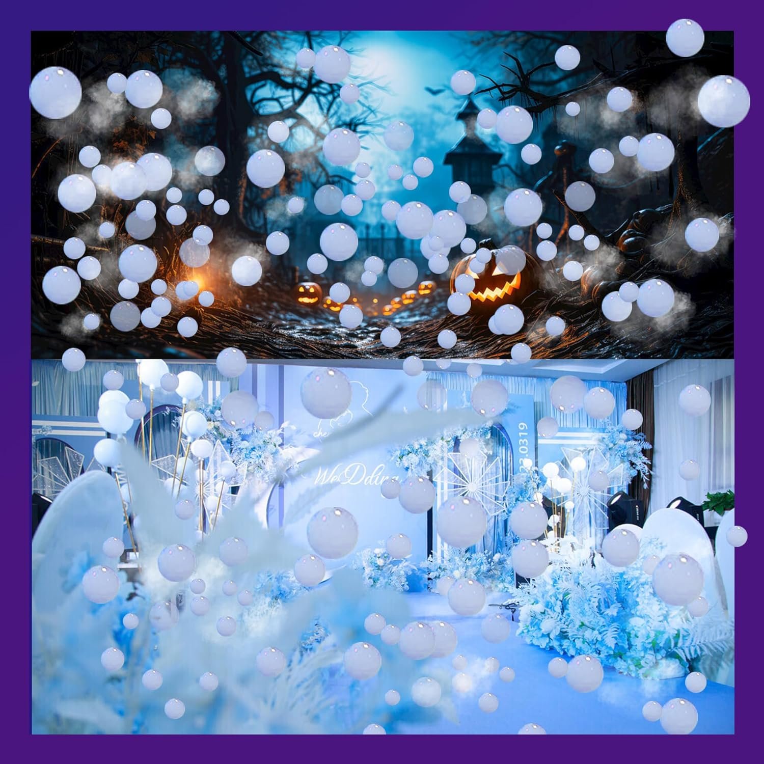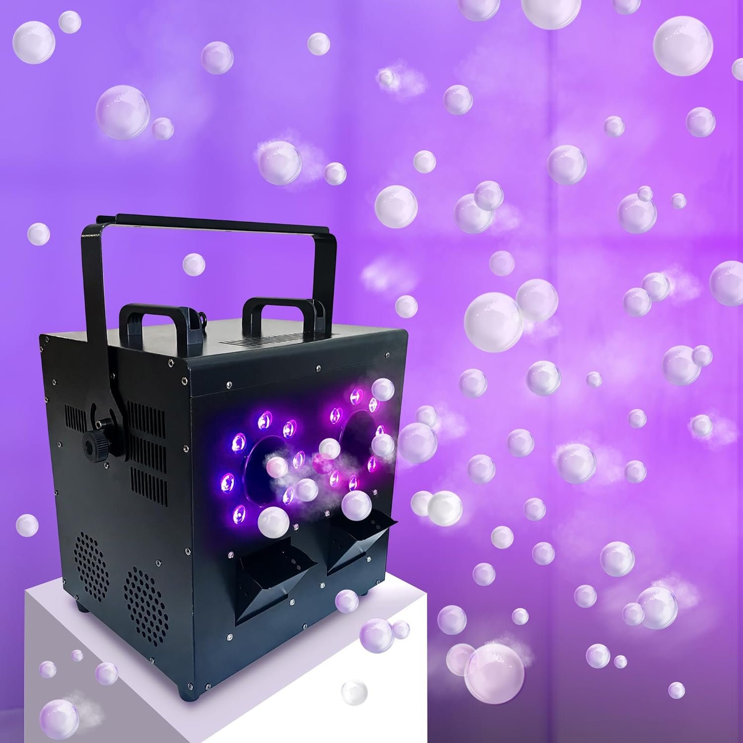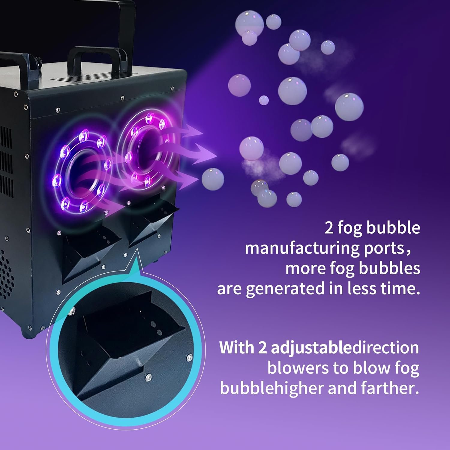The multi-functional fog bubble machine features 16 LED RGB lights that change colors with music, enhancing party atmospheres for events like Halloween and birthdays. It has a powerful 1500W motor with two fog bubble ports, producing bubbles up to 4-5 meters. The machine offers three modes (fog only, fog bubble, bubble only) and includes remote control and DMX connection for larger events. It has 5L tanks for bubble solution and fog juice, providing 2 and 4 hours of usage, respectively. Ensure to use quality solutions and preheat for 4-5 minutes before operation.