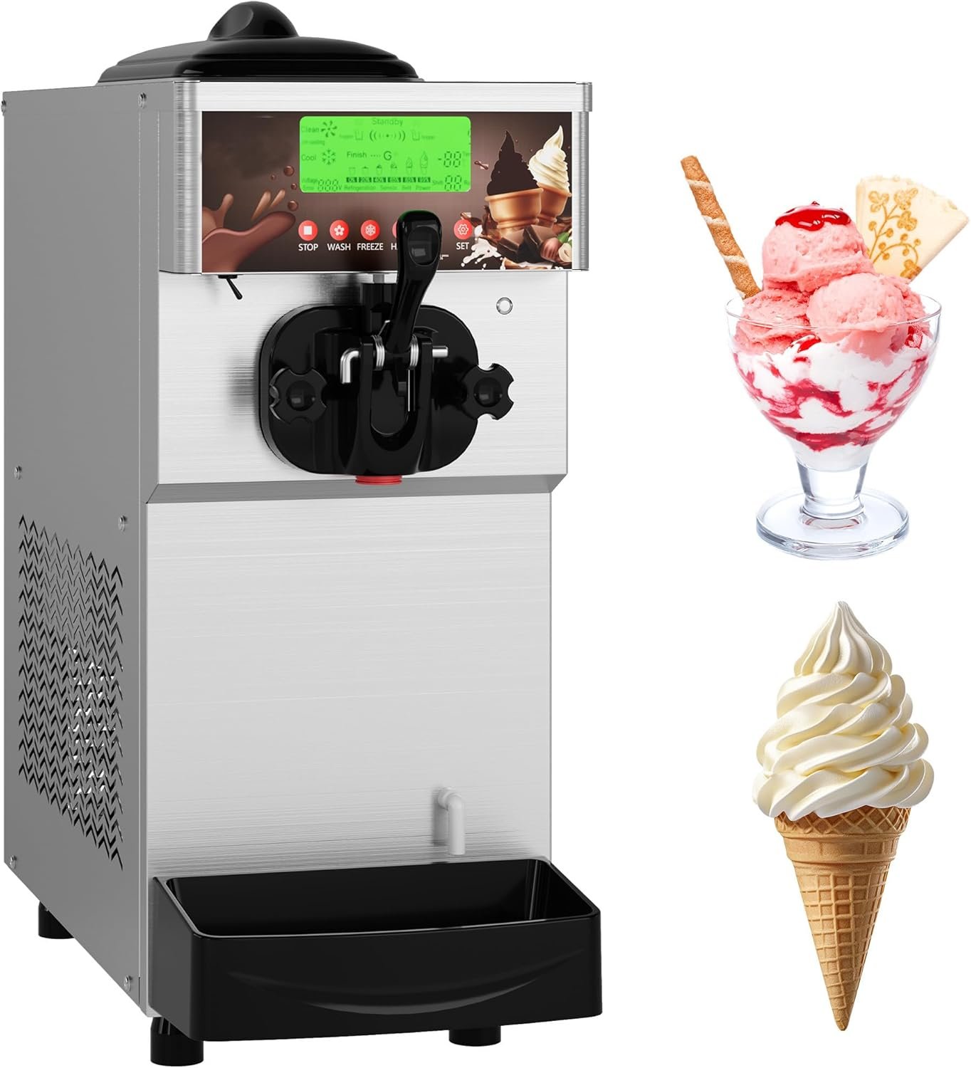 This commercial soft serve ice cream machine boasts a compact design and high output, producing 5.3–7.4 gallons of ice cream per hour from a 1.59-gallon stainless steel hopper. It offers quick batch production, enhanced texture through dual overrun technology, and an intelligent control panel for easy adjustments. The machine’s automatic cleaning function ensures hassle-free maintenance. Ideal for home snack shops, cafés, ice cream trucks, and restaurants, it is perfect for both dessert enthusiasts and business owners seeking efficiency and quality.
