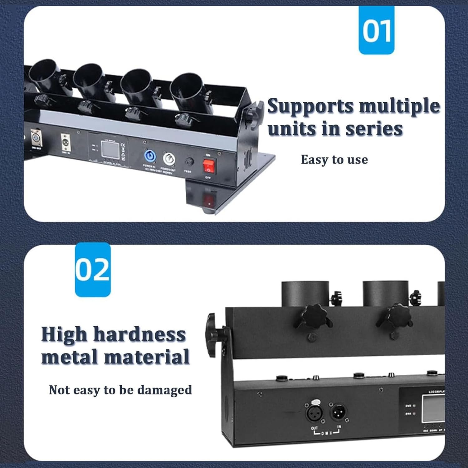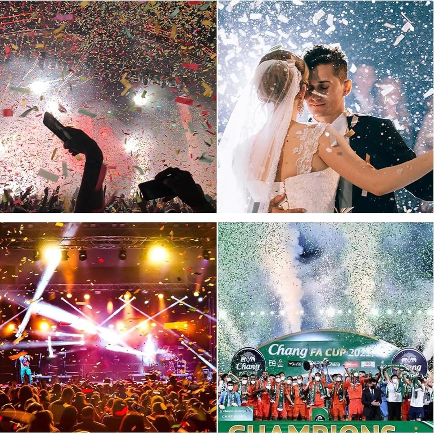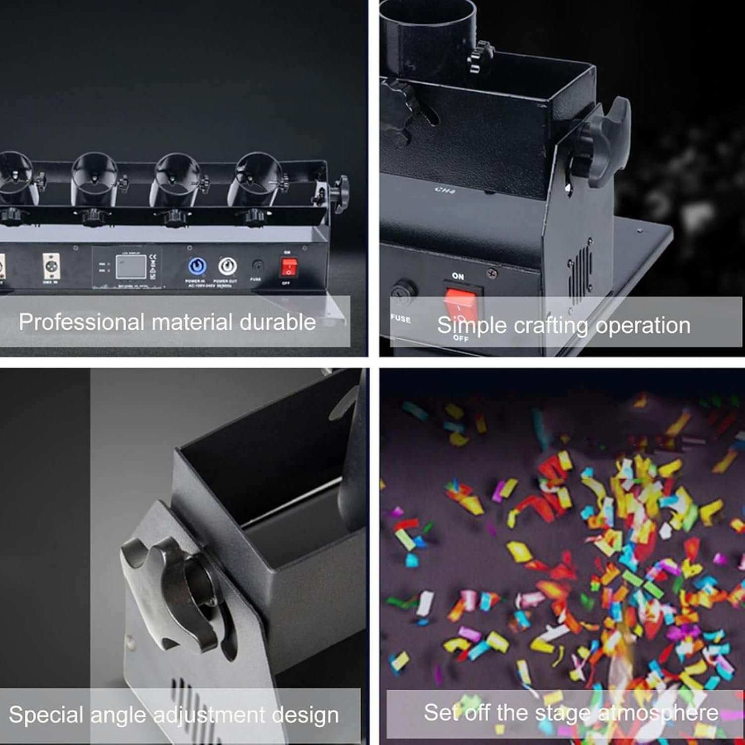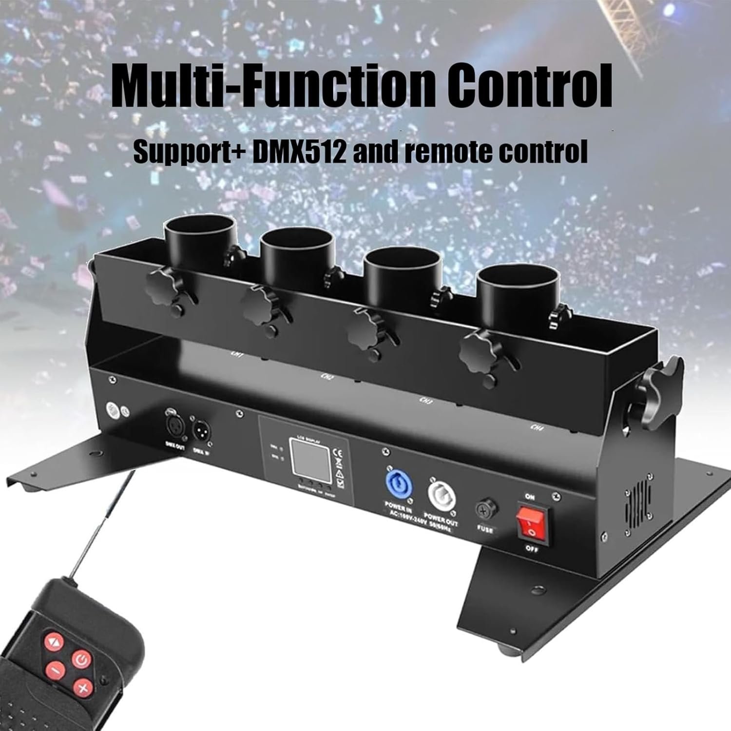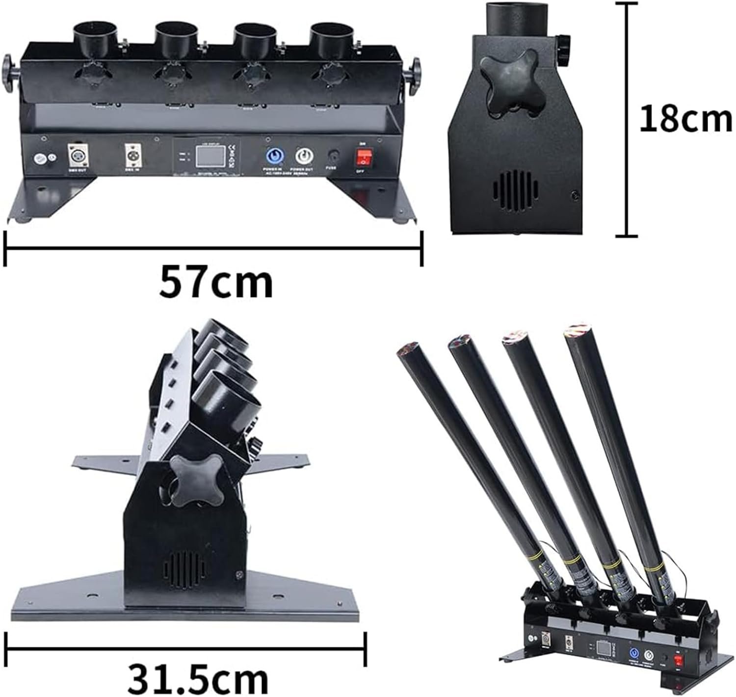 The confetti launcher series includes single, two, and four-shot options, tailored for various events. Features include customizable angles, simple operation, and immediate use. It sprays confetti up to 12 meters high, operates at 150W, and uses DMX control. The package includes a machine, power connector, and remote controller, ideal for stages, bars, and weddings. Designed for durability and ease of use, it offers user-friendly controls and an adjustable angle for precise confetti direction. Note that confetti cannons must be sourced locally due to shipping restrictions.
