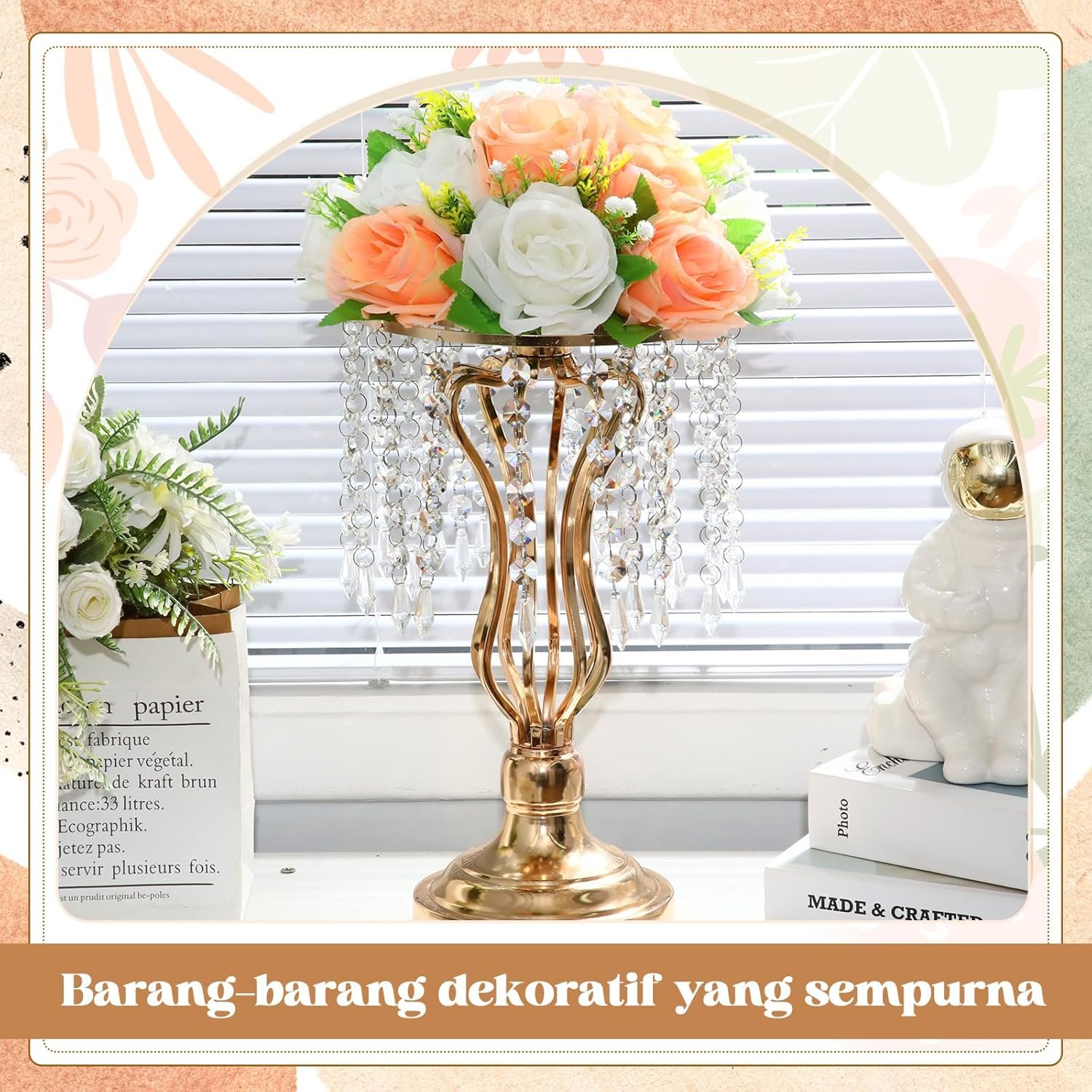 The wedding flower stand set includes 16 attractive gold metal vases, each 12.6 inches tall, designed to hold flower balls and candles. Crafted from durable metal and acrylic, these stands feature crystal pendants and are suitable for various decorations at weddings, parties, and homes. They are rust-resistant and can easily be repositioned. The package emphasizes safety, noting small parts, and advises caution around children. Ideal for gifting at events, these vases enhance any setting with their elegant appearance and versatility.