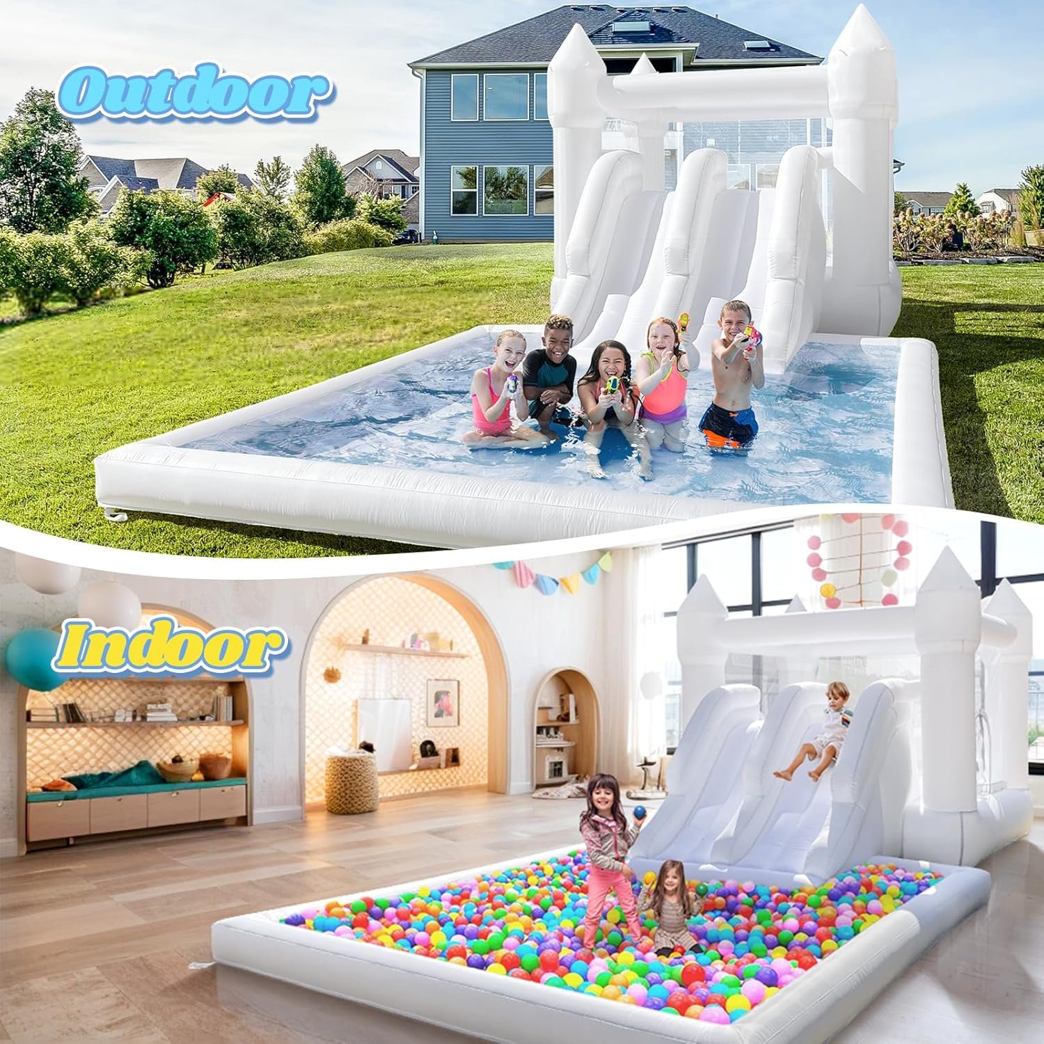 19ft Large Water Slide Bounce House, Oxford Water Slide with Double Slide and Ball Pool/Pit, White Bounce House with Air Blower for Kids Summer Outdoor Fun