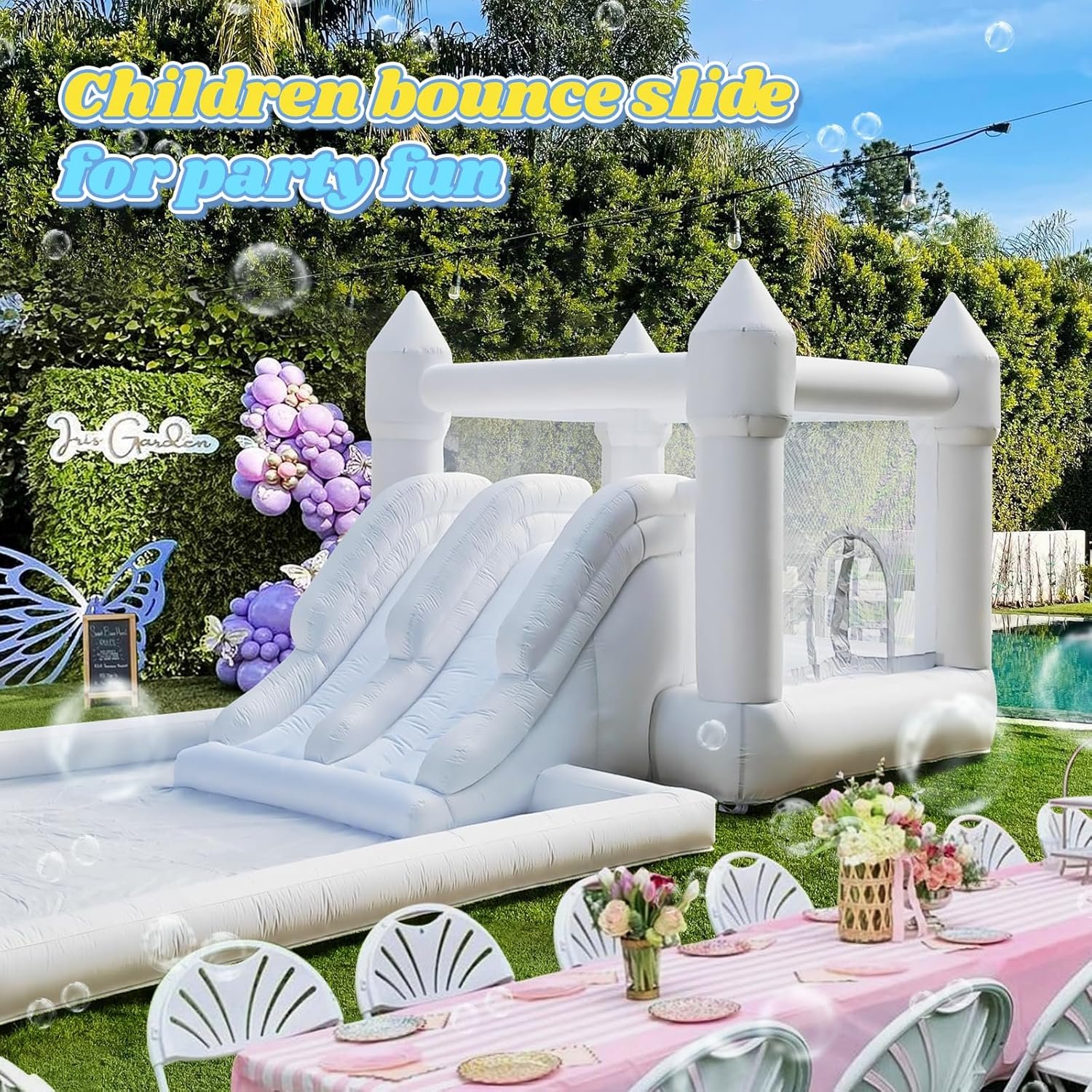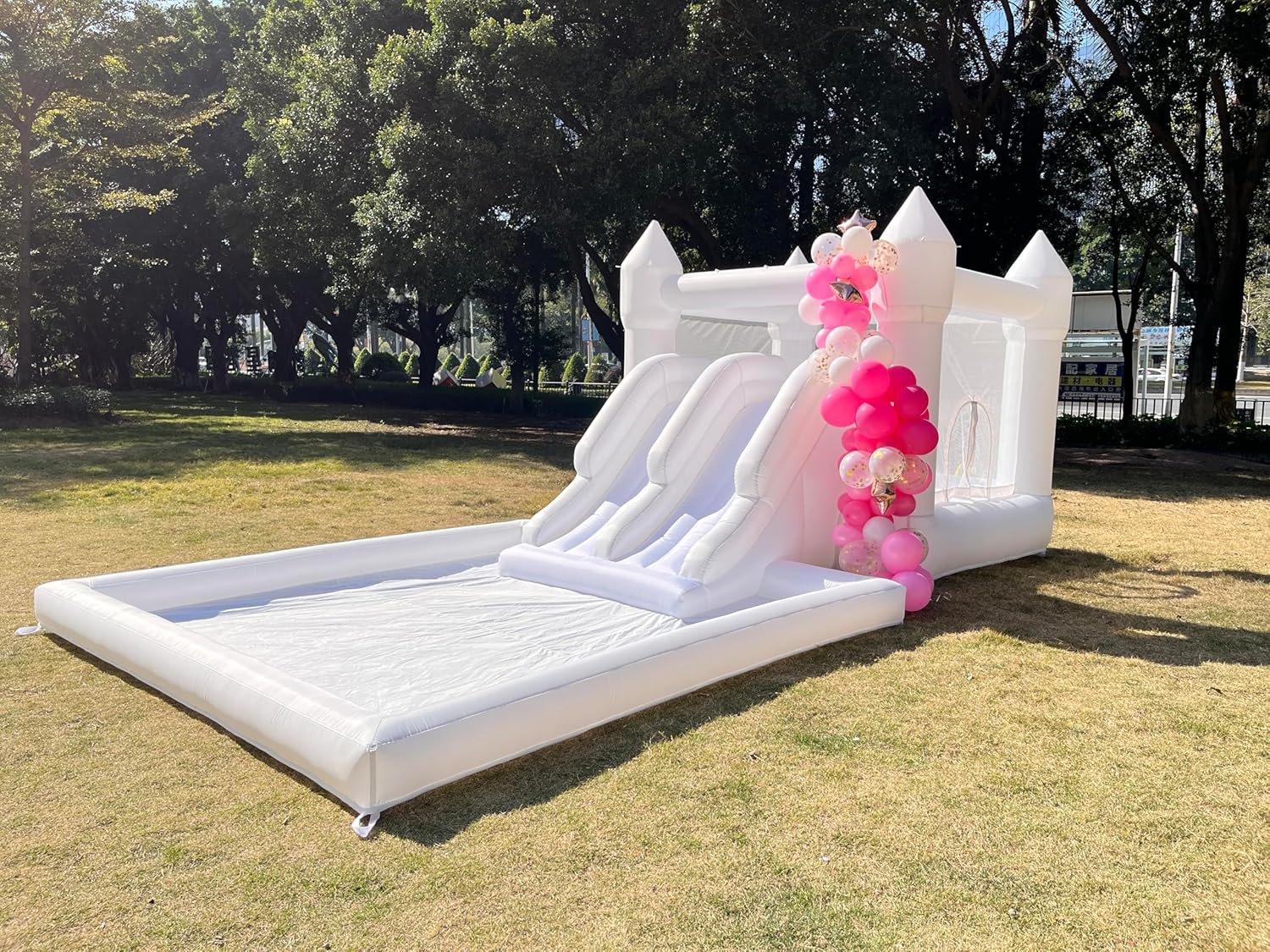 The bounce house is made from safe, durable oxford materials with a thick, puncture-resistant 480D fabric. It features double slides and a ball pit for endless fun while ensuring safety with a 3-side protection mesh. Perfect for kids aged 3-10!
