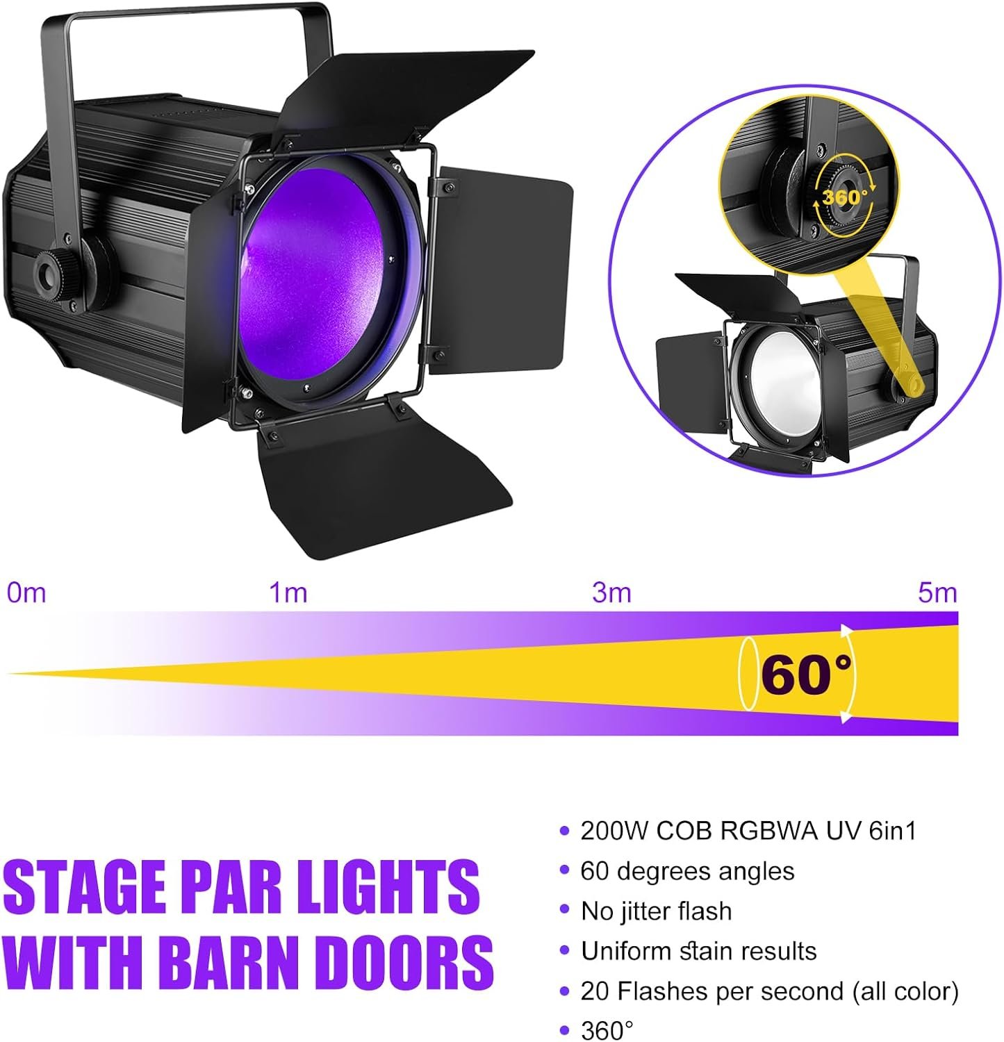 This professional LED stage spotlight boasts a durable plastic shell, a lifespan of up to 60,000 hours, and effective heat dissipation from a built-in cooling fan. It features adjustable barn doors to control light spill and is suitable for a variety of settings, including parties, concerts, and decor. The compact design allows for easy installation with dual mounting brackets. Additionally, the spotlight includes a quality cooling system to prevent overheating, and customer support is readily available for assistance.