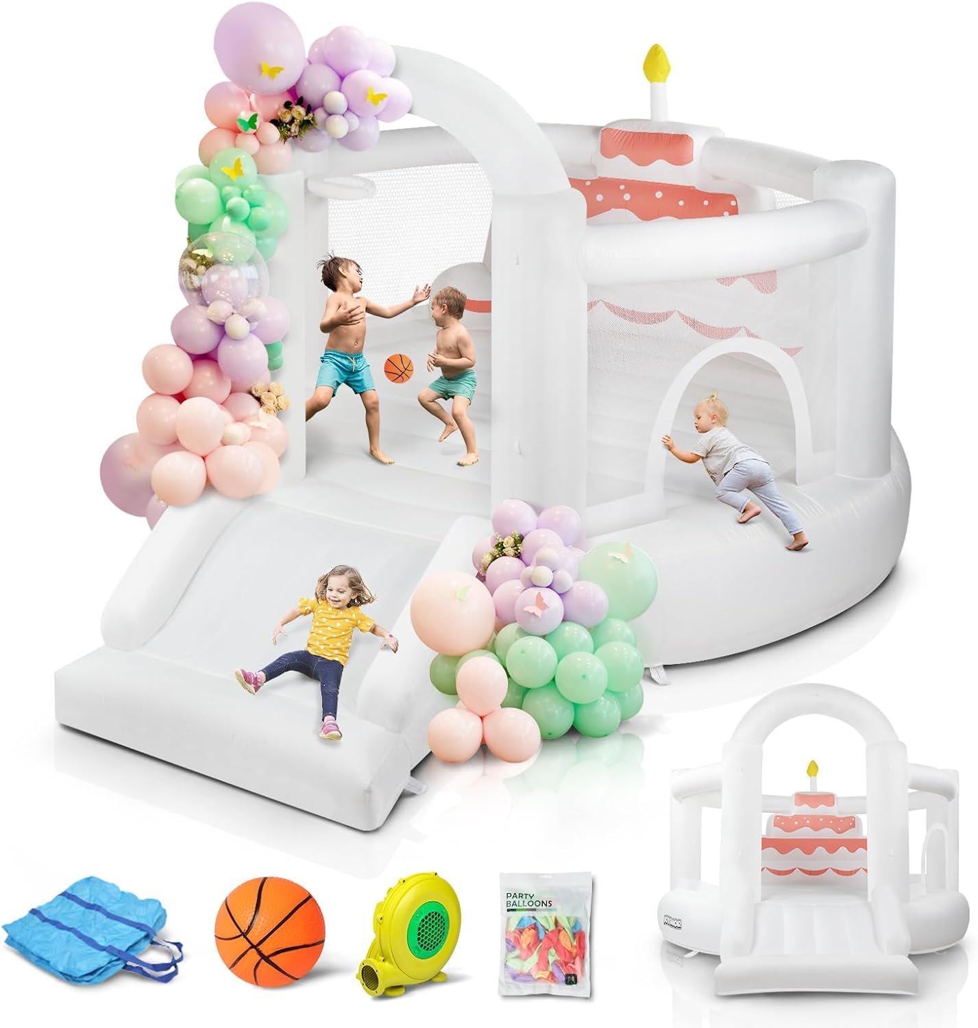The JOYMOR Indoor Climbing Series features a toddler indoor climbing set, foam soft play set, and a new inflatable bounce house for 2025. The bounce house, designed for ages 8-12, boasts a cake-like appearance, integrating a basketball hoop and wide slide for varied play. It accommodates 3-5 children (max weight 450 lbs) and is made of durable 840D oxford fabric. The package includes a powerful air blower, balloons, a carrying bag, and stakes. Ideal for indoor or outdoor use, it’s perfect for birthday parties and family outings.
