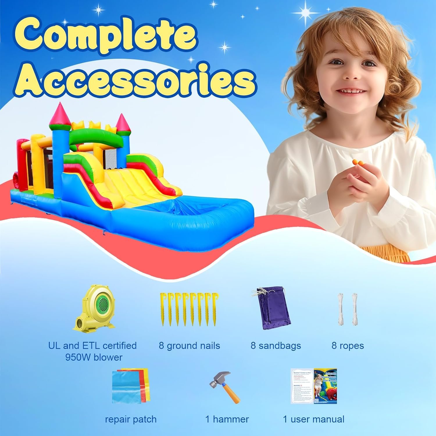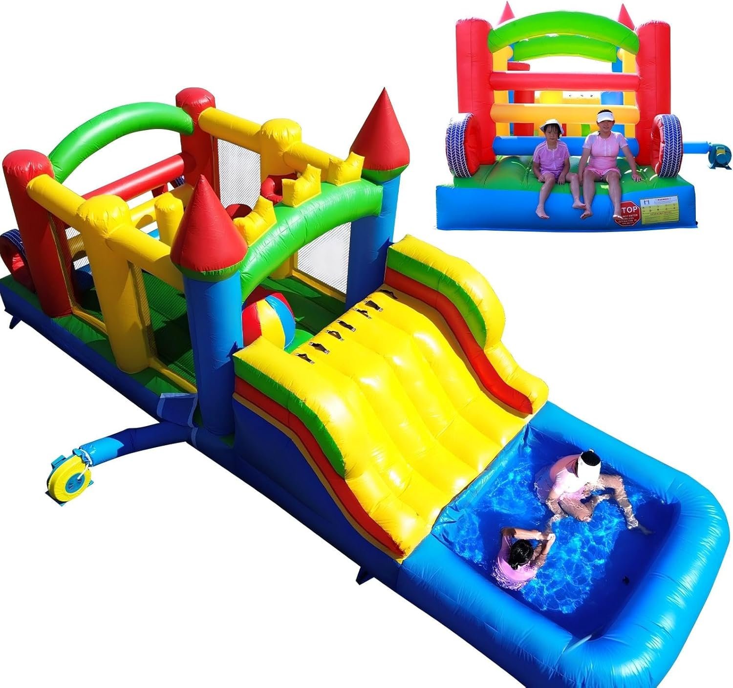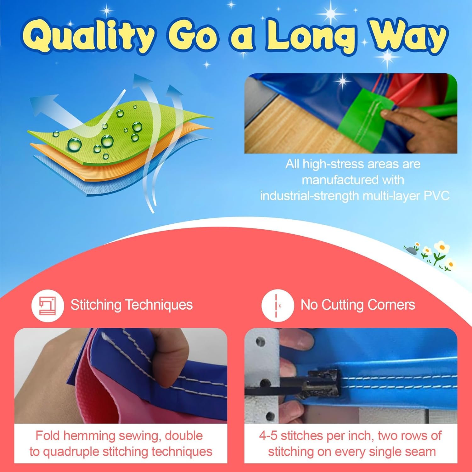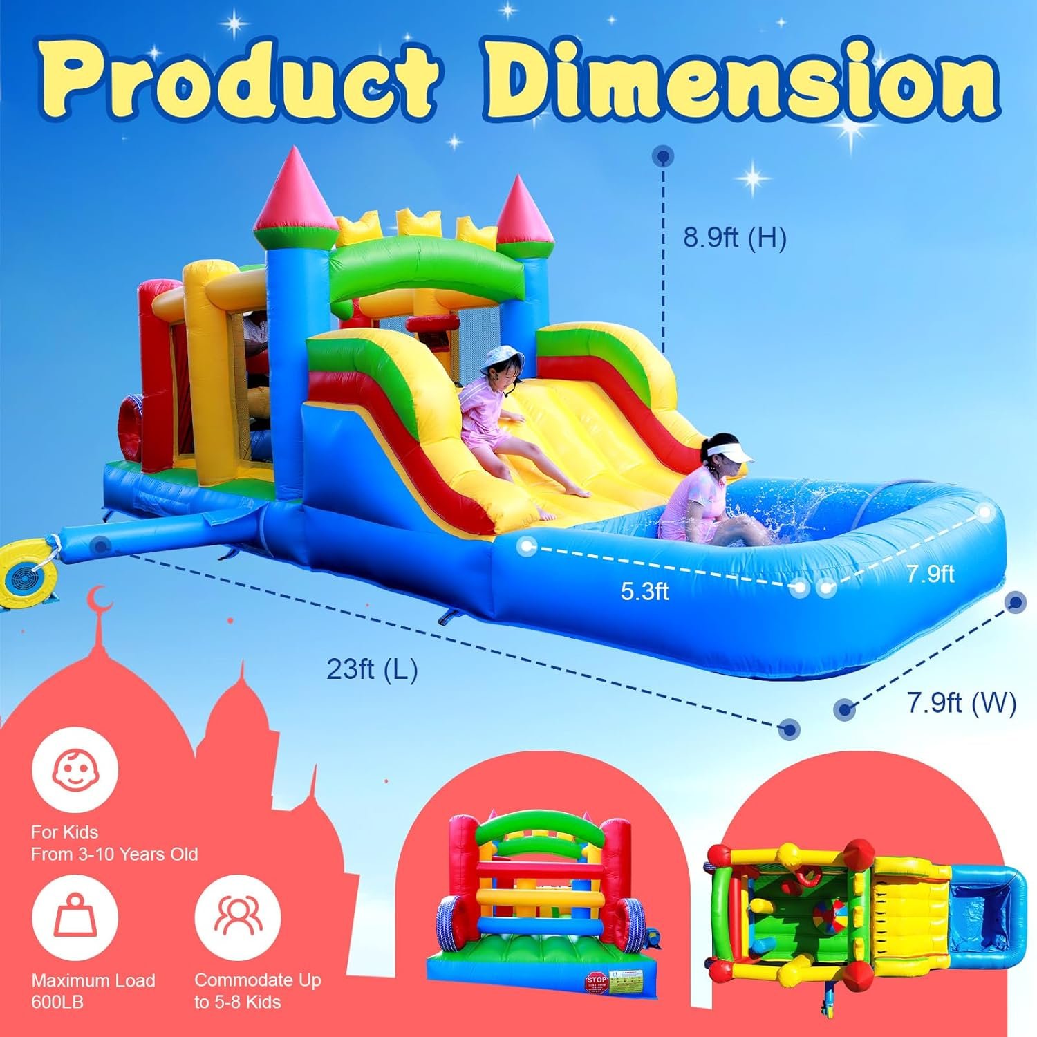 The video highlights the commercial inflatable bounce house, demonstrating its setup, unpacking, and product comparisons. Built from durable 0.45mm PVC, it meets CE and ASTM safety standards and lasts 3-5 years. The construction features double to quadruple stitching for added strength and reinforced edges using hot-welding technology to minimize water seepage. It measures 23’x7.9’x8.9′, accommodating 4-5 kids (max 450 lbs). The package includes the bounce house, a blower, anchor stakes, and a repair kit. Proper drying before storage is essential, and double-layer reinforcement ensures the package’s condition during delivery.