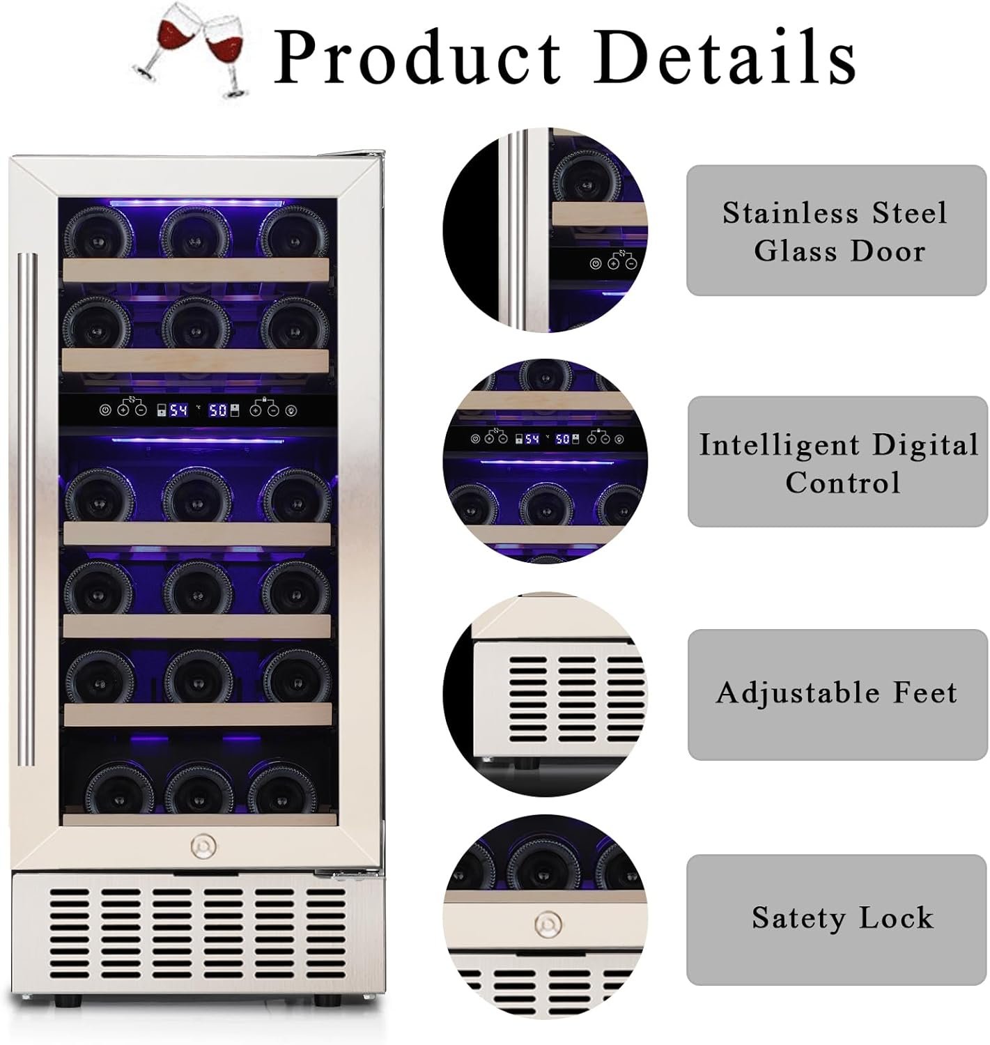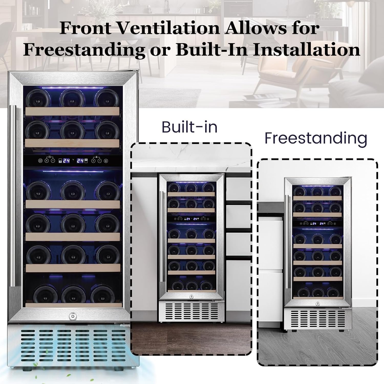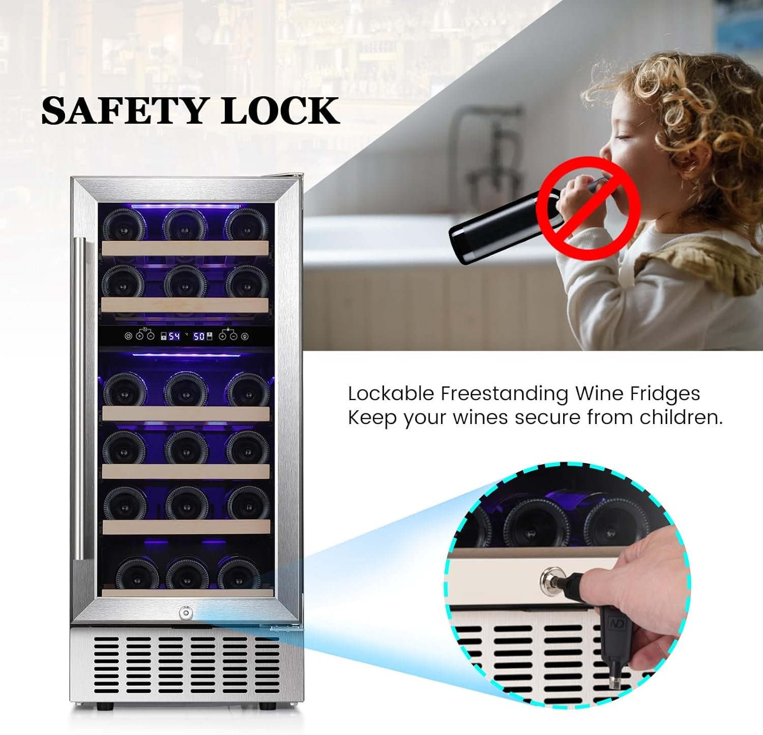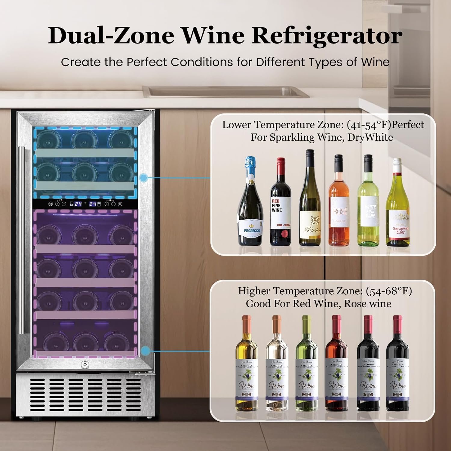 This 28-bottle wine refrigerator features dual temperature zones (41℉-54℉ and 54℉-68℉) for optimal wine storage and serving. Equipped with a high-performance compressor, it ensures consistent cooling and ideal humidity, while the glass door provides airtight sealing to protect against vibrations and cork drying. The unit can be freestanding or built-in, making it versatile for various spaces. Additionally, a safety lock keeps your collection secure from children. With a stylish stainless steel design, this wine cooler complements any decor, enhancing your wine tasting experience.