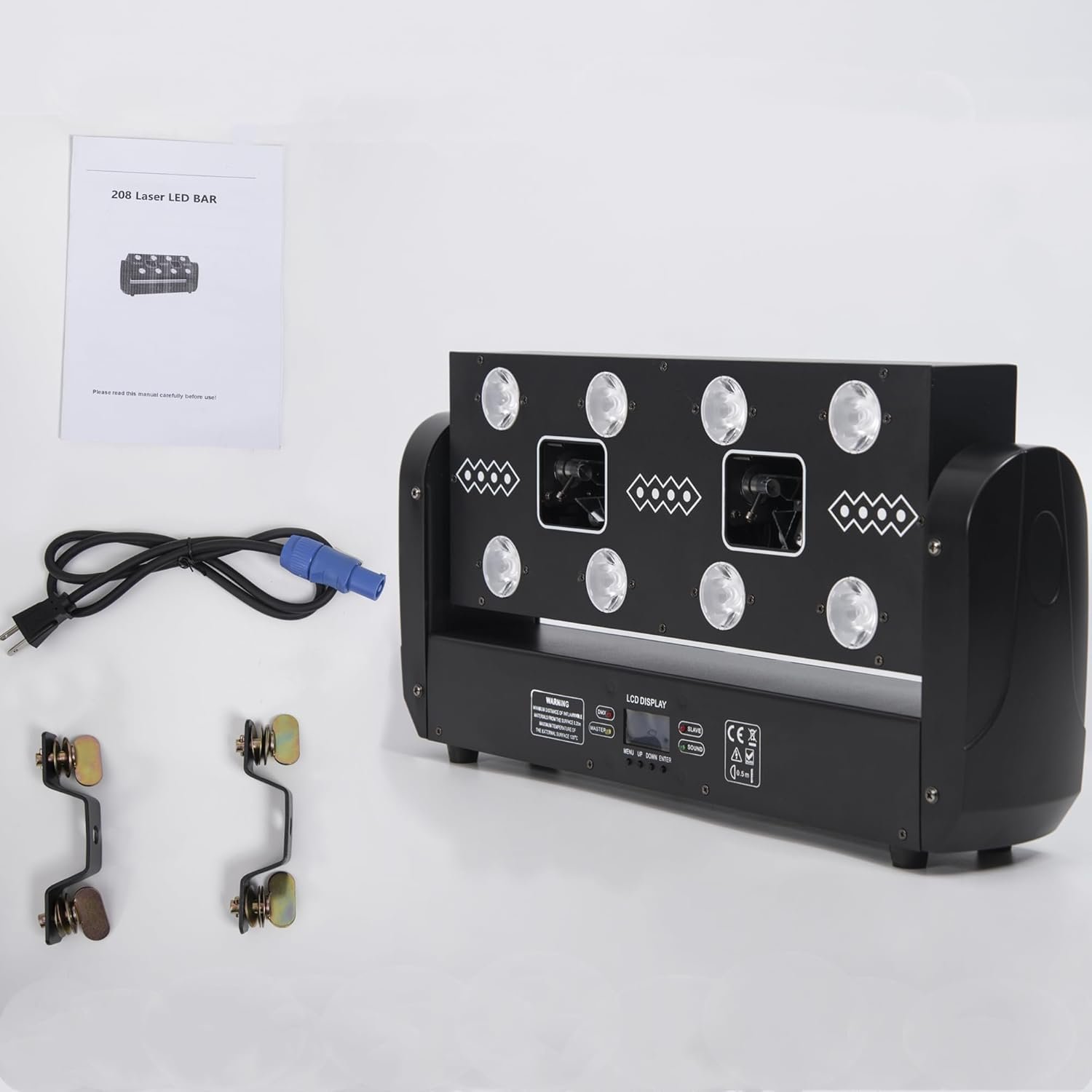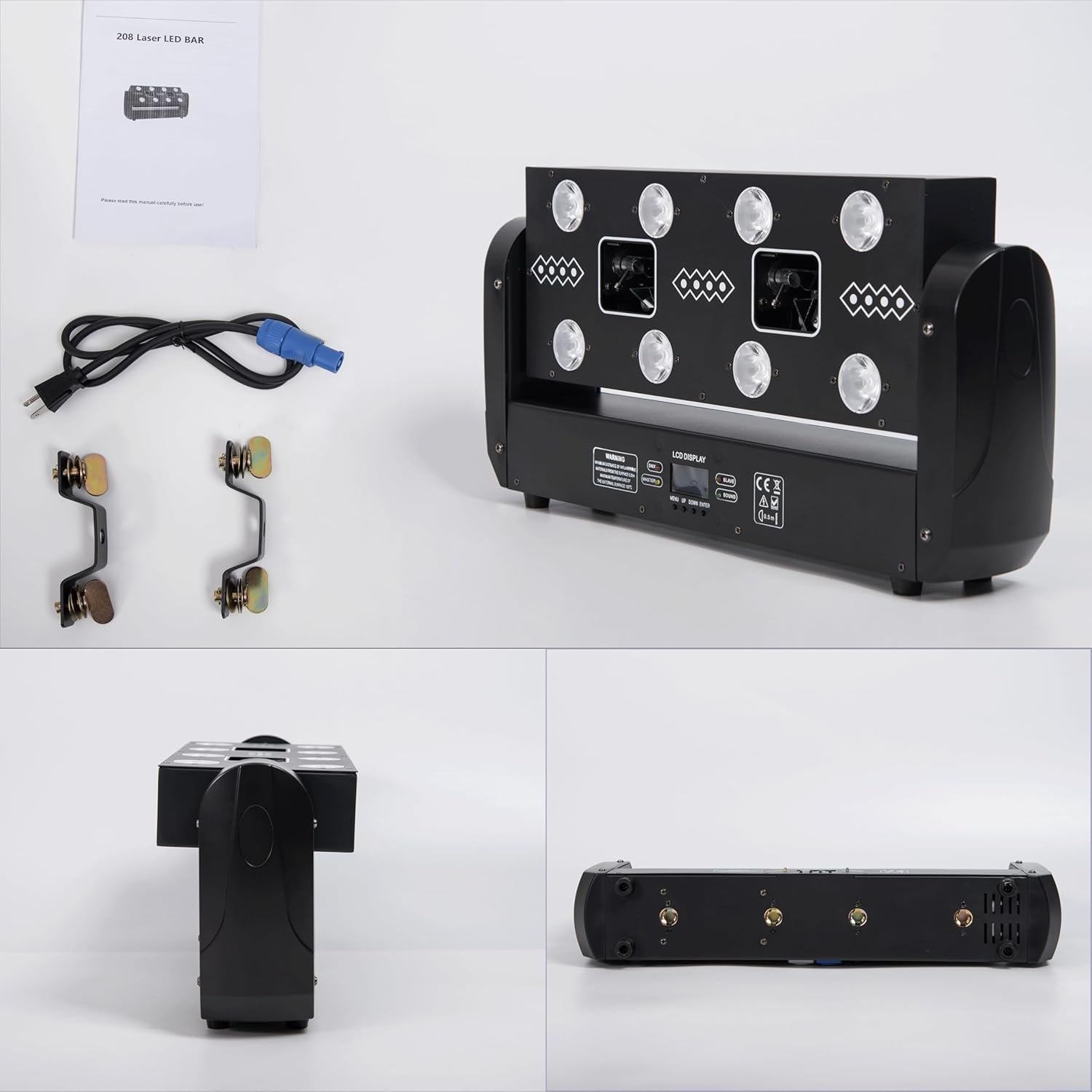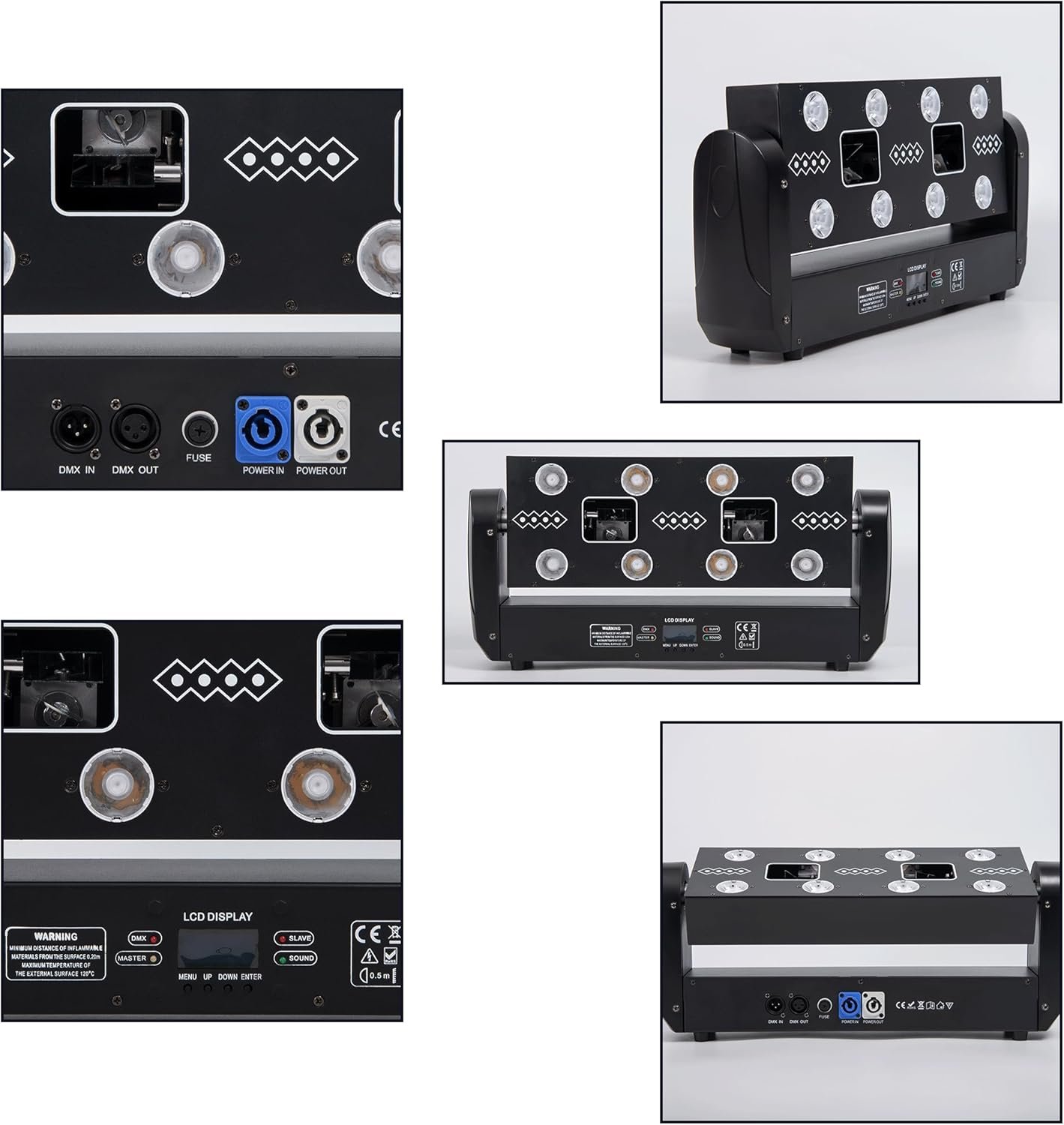 The product is an RGBW full-color beam stage light designed for various occasions like parties, weddings, and stage performances. It features 8 orange beams, high-quality brightness, and clear patterns. Control options include DMX512, master/slave modes, and sound activation, allowing for dynamic lighting effects that sync with music. The light is portable, easy to install, and requires smoke for optimal visual effects. It has received positive customer reviews, averaging 4.6 out of 5 stars across multiple ratings, with prices ranging from $178.99 to $342.99.