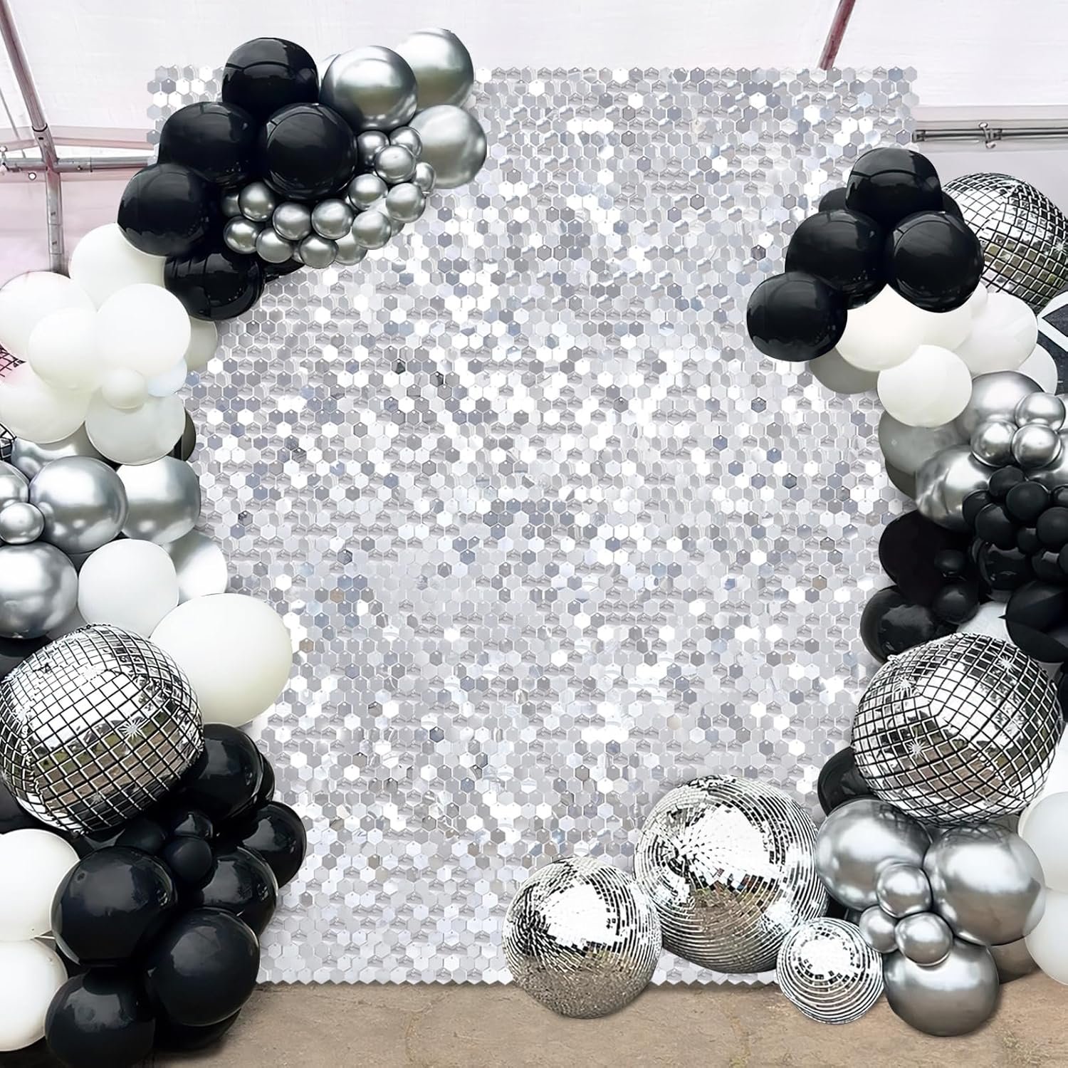 The Hexagon Shimmer Wall Backdrop Panels are versatile decorative panels in iridescent silver, silver, and gold, suitable for various events like engagements, graduations, and parties. Each set includes 36 pre-assembled 12×12″ sequin panels, hooks, cable ties, spare sequins, and installation instructions. The panels are easy to install and store, featuring a durable polymer material that maintains vibrant colors. Ideal for both indoor and outdoor use, these backdrops enhance any occasion, including weddings, birthdays, and festivals, offering a customizable design fit for diverse spaces.
