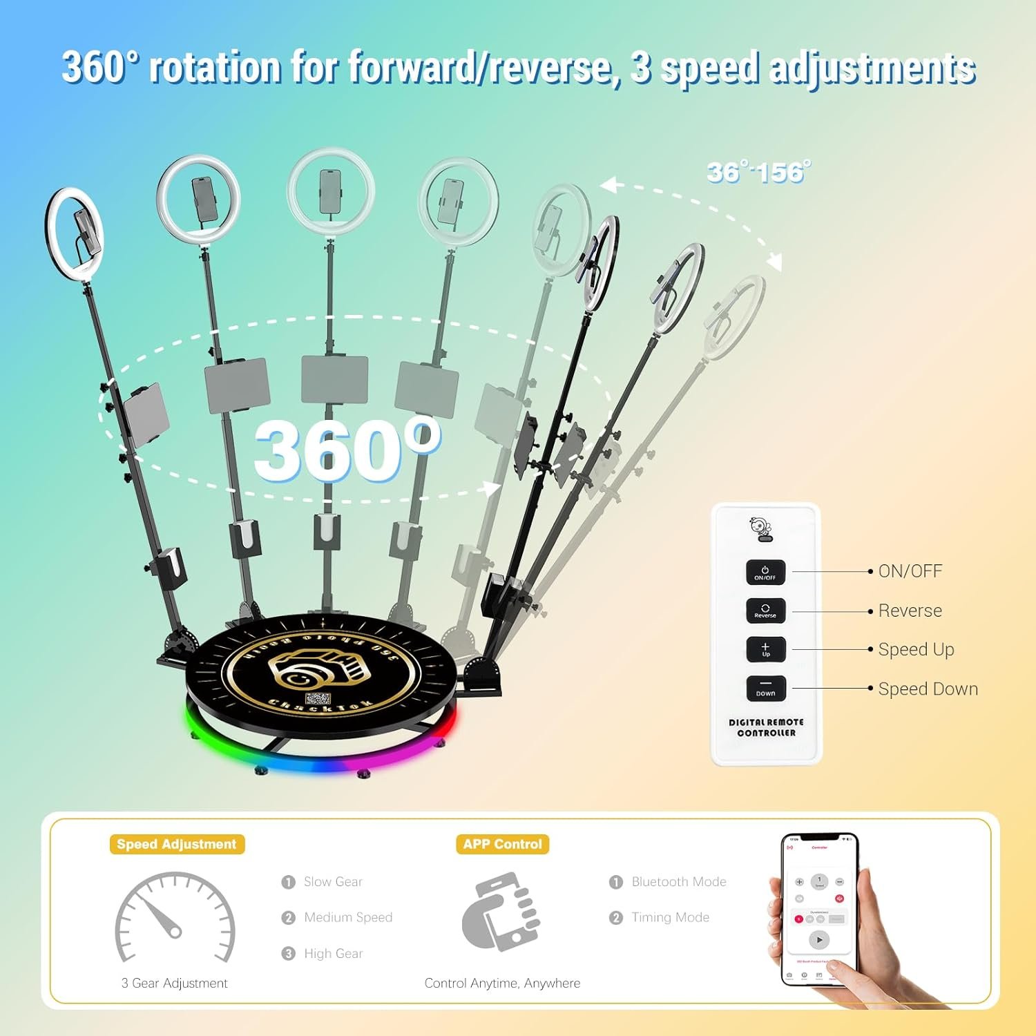 The 360 Photo Booth Machine features a rotating selfie ring light with adjustable brightness and color modes, perfect for enhancing events like weddings and parties. It creates 360-degree panoramic videos and photos, easily shareable on social media using the ChackTok app, which allows for music integration and various video editing effects. With multiple device support and adjustable features, it offers quick assembly and operation without noise. The booth includes three selfie brackets and comes with a three-year warranty, making it ideal for family gatherings, large events, and exhibitions.