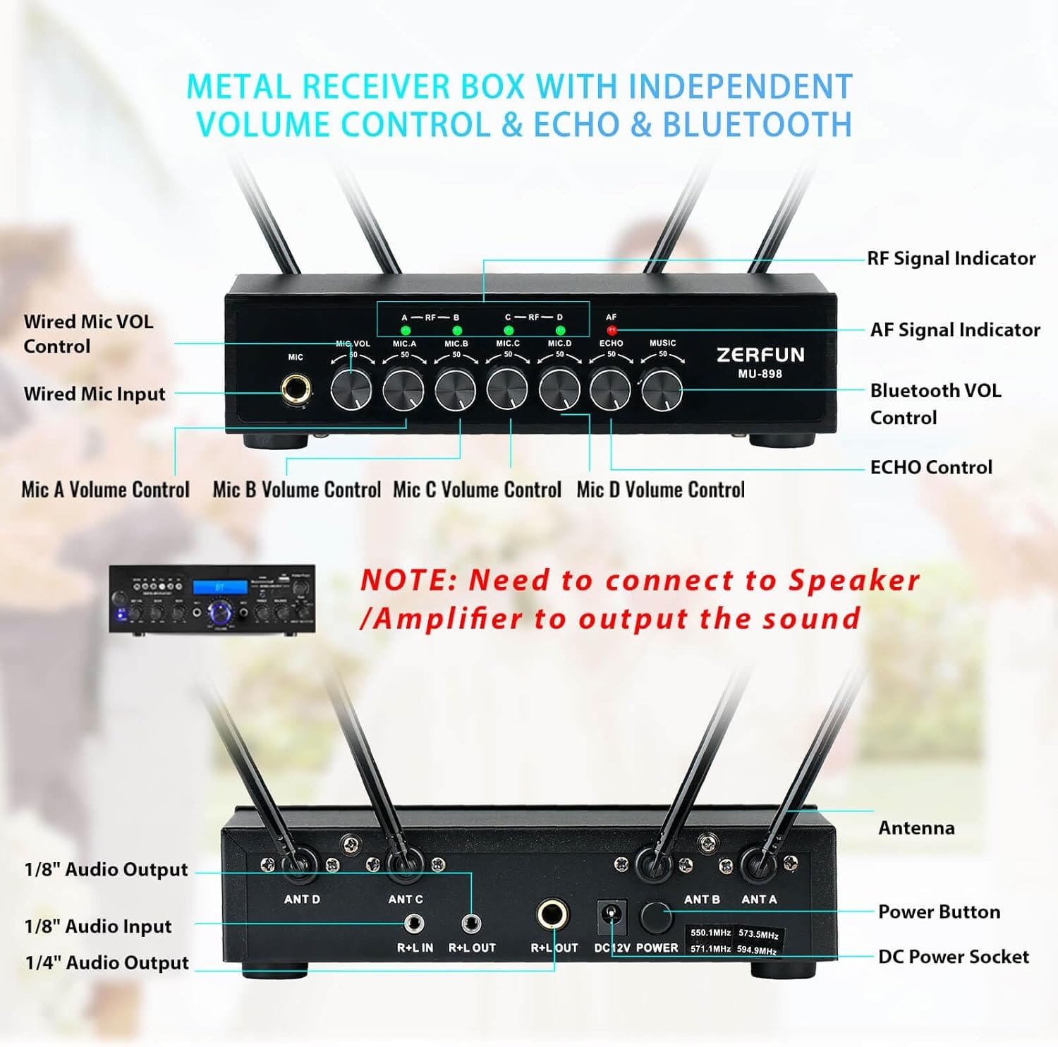The ZERFUN UHF Rechargeable Wireless Microphone System features four handheld metal cardioid microphones, ideal for various settings like karaoke, meetings, and events. Each microphone offers unidirectional sound pickup, minimizing background noise. The system includes a metal receiver with independent volume control, echo function, and Bluetooth capability. It supports a working range of up to 200 feet and operates on UHF frequencies (500-599 MHz). The rechargeable batteries provide 10-12 hours of use per charge. The package includes various cables, a power adapter, and is backed by a 12-month warranty and 24-hour customer support.
