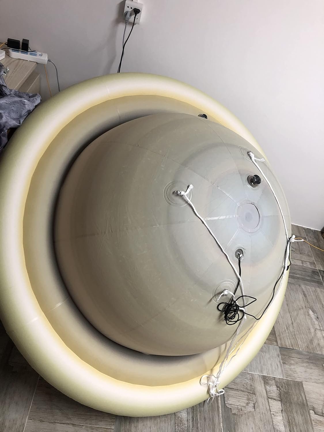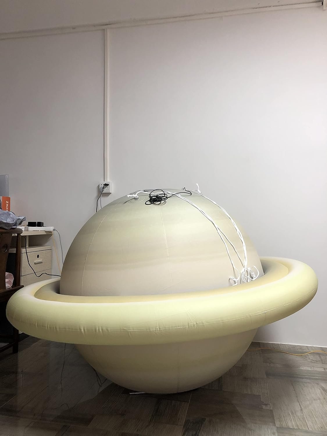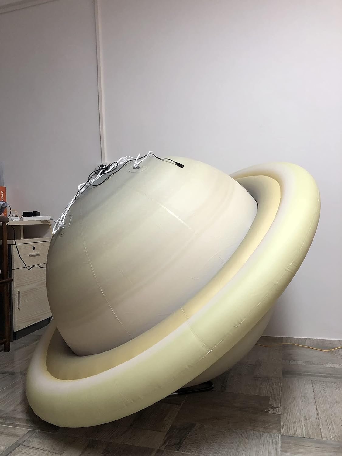 This product features a durable 0.25mm thick PVC planet model available in two sizes: 1m (40 inches) and 1.52m (60 inches) in diameter. It can be hung from the ceiling or placed on the ground. The model includes RGB colorful lights controllable by a remote and is ideal for use in planetarium settings, educational environments, large parties, and sporting events. The package contains one planet, an air pump, ropes, RGB lights, a black case, and a remote controller.