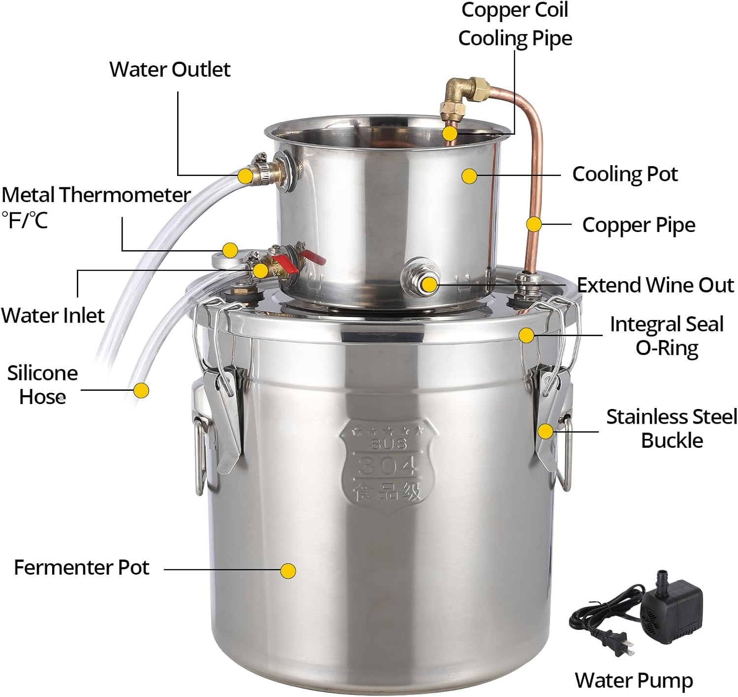 The Takywep Alcohol Still is a stainless steel brewing kit designed for DIY whiskey and brandy. It features a high-quality copper tube and integrated circulating pump for rapid cooling, ensuring efficient distillation. The kit includes a dual display thermometer for precise temperature control in Celsius and Fahrenheit. Made from food-grade materials, it has a secure design for safe fermentation. Versatile and compatible with various heating methods, it can also be used to make essential oils and distilled water. The complete set is suitable for both beginners and experts in home brewing.