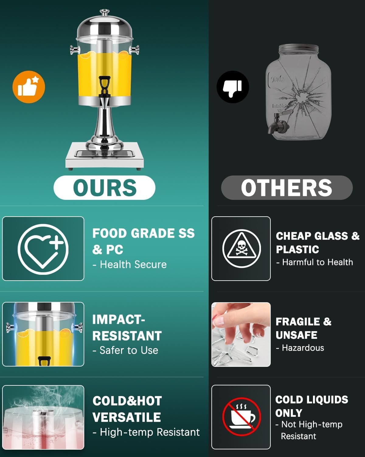 Introducing our 2 Gallon Drink Dispenser, perfect for parties and events! Crafted from premium 18/8 stainless steel and food-grade plastic, it features an easy-to-clean drip tray to eliminate messes. With a hot & cold dual-use design and a built-in ice core, your beverages stay at the perfect temperature!