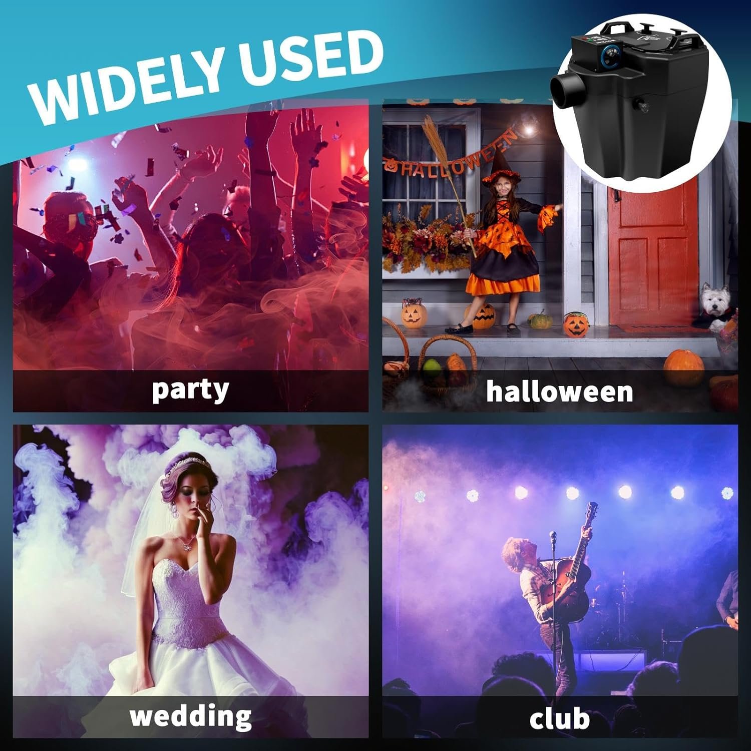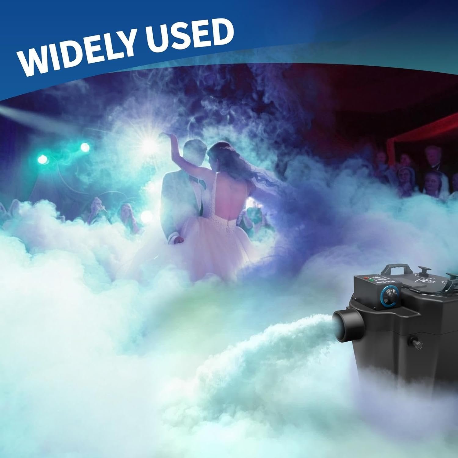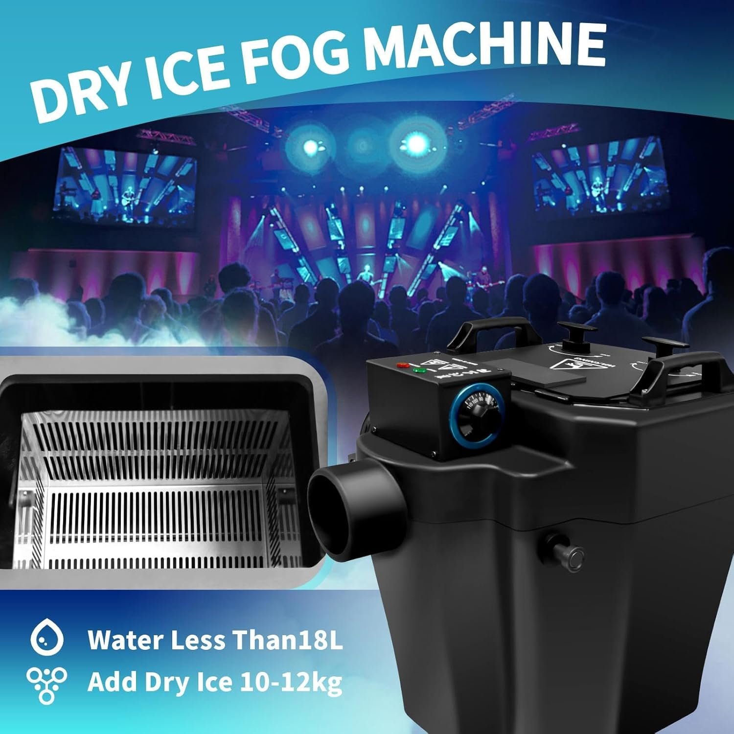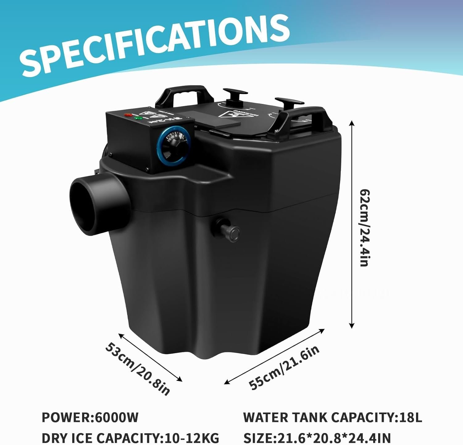 Introducing a robust 6000W fog machine designed for captivating low-lying smoke effects. It accommodates 10-12kg of dry ice and 18-19 liters of water for extended use, while an intelligent safety system ensures reliable operation. Perfect for events, parties, and performances!