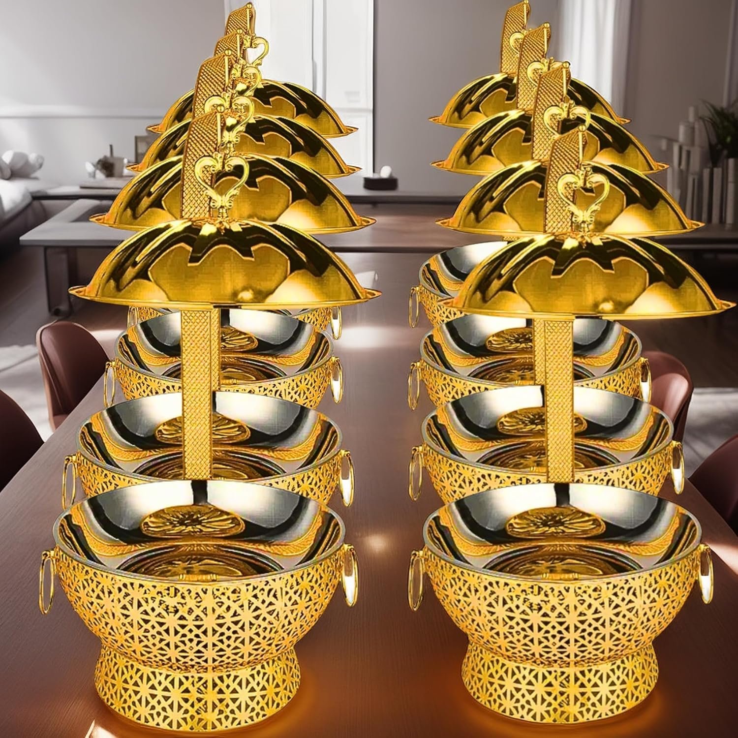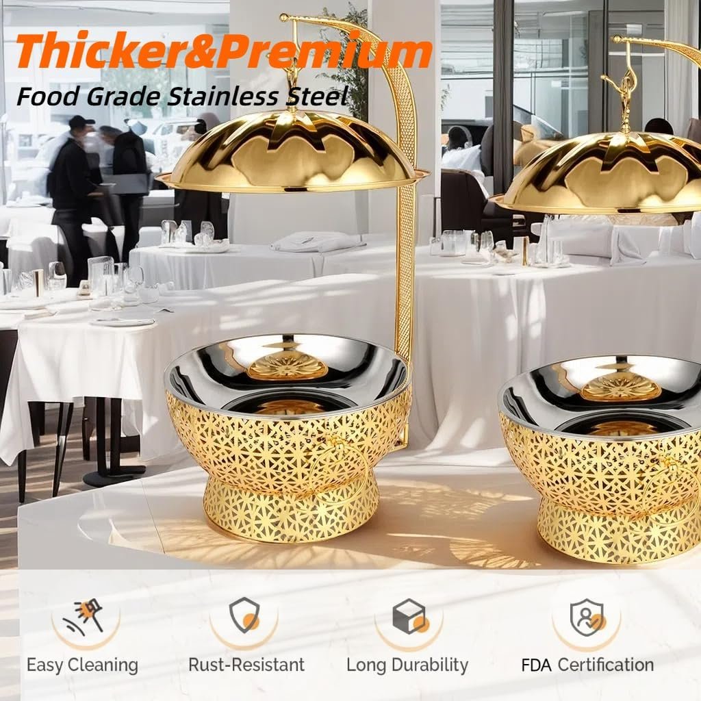 This product is an 8-pack set of luxurious gold chafing dishes, each with an 8QT capacity, ideal for large gatherings and professional catering. Key features include a stylish lid that retains heat, a hook rack for organization, and a hollow design for sophistication. They require solid alcohol fuel (not included) for heating and must be used with water in the tray. Made from durable, food-grade materials, these rust-resistant dishes are perfect for events like weddings and corporate functions, adding elegance to any buffet display while ensuring optimal food temperature maintenance.