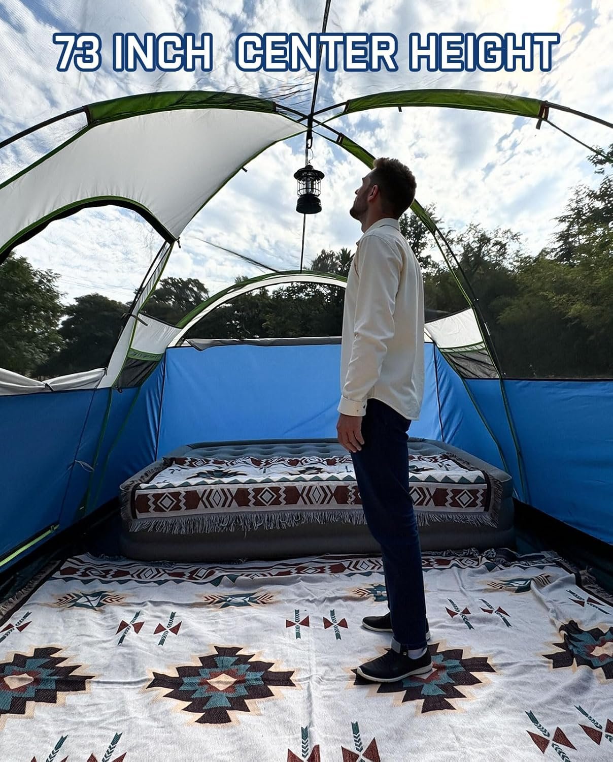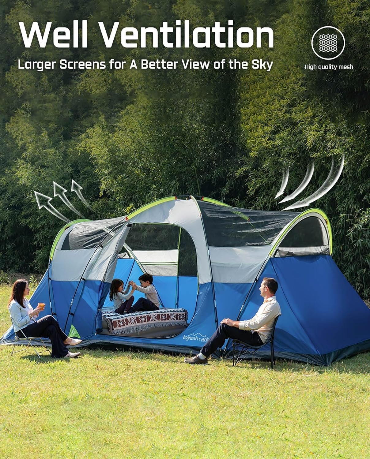 The spacious camping tent measures 14ft x 8ft x 6ft, accommodating up to 8 people with room for 8 sleeping bags or 3 queen air mattresses. It features 2 divided curtains for privacy, excellent ventilation via mesh windows and doors, and a panoramic view. Made from durable, waterproof polyester, it ensures comfort and stability with strong fiberglass poles. Setup is easy, taking about 10 minutes for two people, and it comes with a carry bag for convenient storage. Ideal for family camping, hiking, music festivals, and parties.