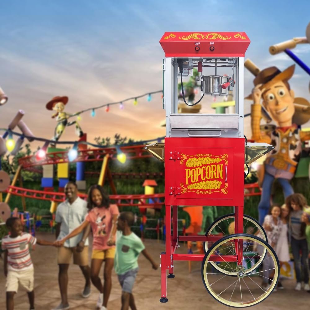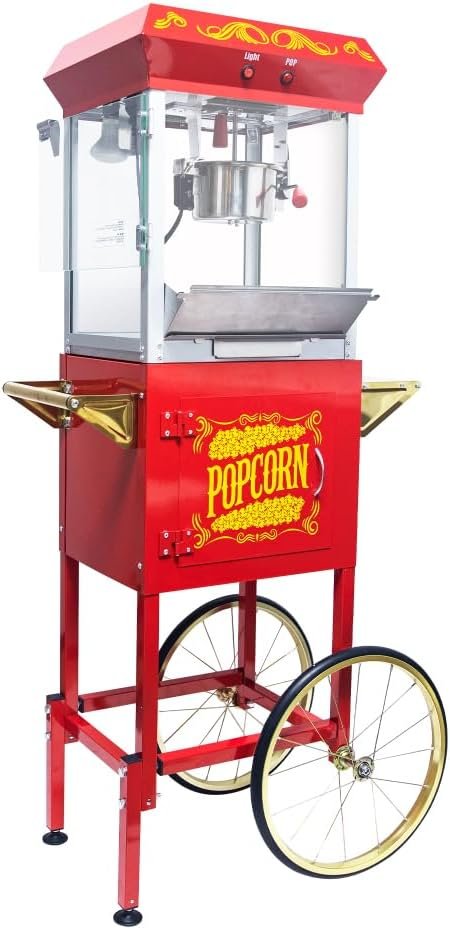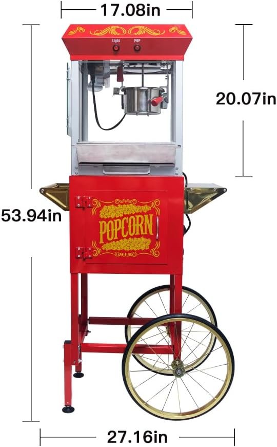 The 650W popcorn maker features an 8oz stainless steel kettle that yields 2 gallons of popcorn per batch. Its design includes a heated deck, a drawer for un-popped kernels, and easy-to-use controls for efficient operation. Mounted on a mobile cart with 16-inch tires, it’s convenient for transportation and features an organized storage cabinet. The machine’s retro design adds a nostalgic charm to any event. Constructed of stainless steel and tempered glass, it measures 26.97″ x 17.72″ x 53.86″. Accessories include plastic serving cups and measuring tools, making it both a practical and stylish kitchen addition.