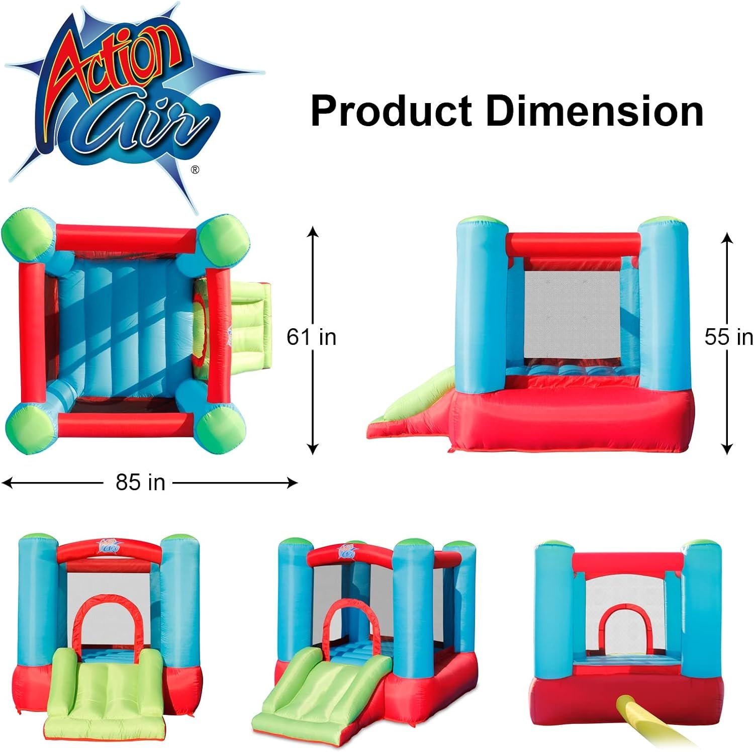 The Action Air Bounce House offers an exciting and safe entertainment option for kids, suitable for both indoor and outdoor use. Made with durable materials and safety features, it can support multiple children (up to 90 lbs total) and sets up in just two minutes. The included air blower is water-resistant and designed for easy handling. Perfect for birthdays and special occasions, it keeps kids entertained for hours while allowing for easy transport and storage with its convenient carrying bag. The package includes everything needed for setup, including repair patches and stakes.