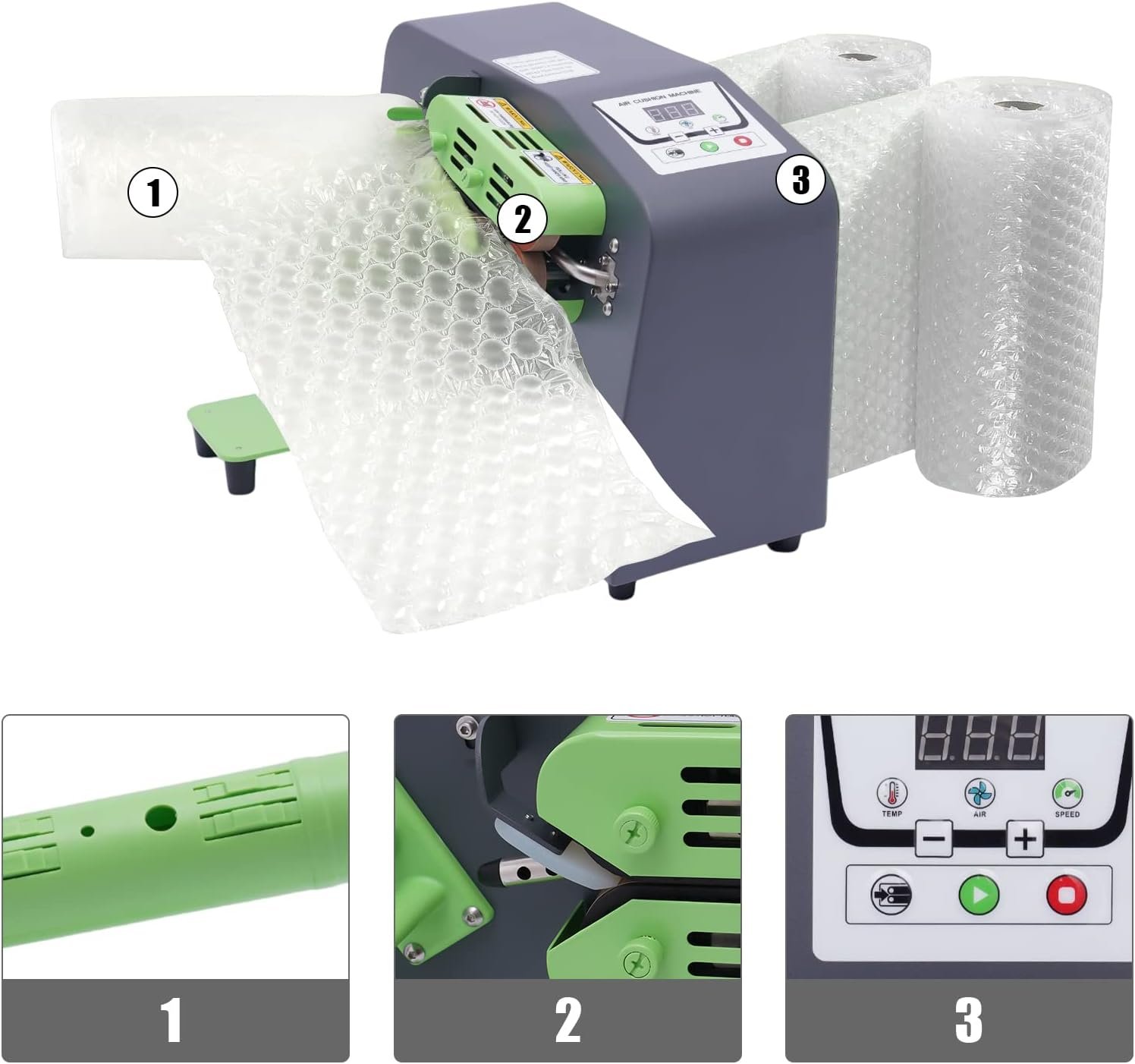 The Air Cushion Films Machine is a compact, efficient inflation device made from stainless steel and ABS. It operates at 200W, preheating in 30 seconds and inflating at 39 feet per minute, ideal for protecting fragile items like valuables and fruits. Features include a user-friendly visualization screen, adjustable speed, air volume, and temperature. It includes a durable discharge shaft for smooth film rotation and enhanced stability with non-slip feet. The machine is designed for various bubble film specifications and saves space compared to traditional packaging materials. Accessories and installation manual are included.