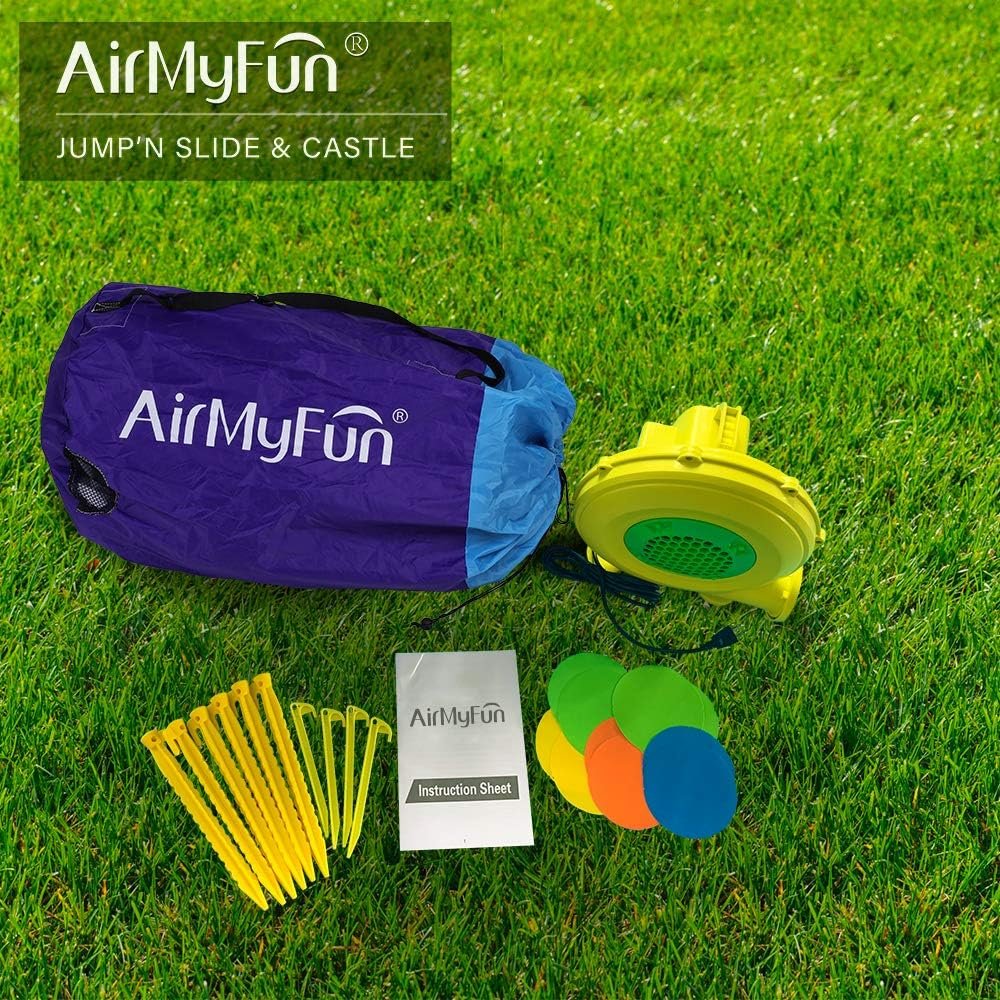 The AirMyFun New Bounce House is designed for children aged 3 to 12, accommodating up to 350 lbs, perfect for 3-4 kids. Features include a large slide and spacious play area for jumping and climbing. It prioritizes safety with a stable design and non-toxic materials, easily cleaned with soap. The package includes a 450W fan, storage bag, bouncer stakes, blower stakes, and repair patches, inflating in under 2 minutes. Crafted from durable Oxford material with advanced stitching, it is wear-resistant and puncture-proof, ensuring long-lasting fun.