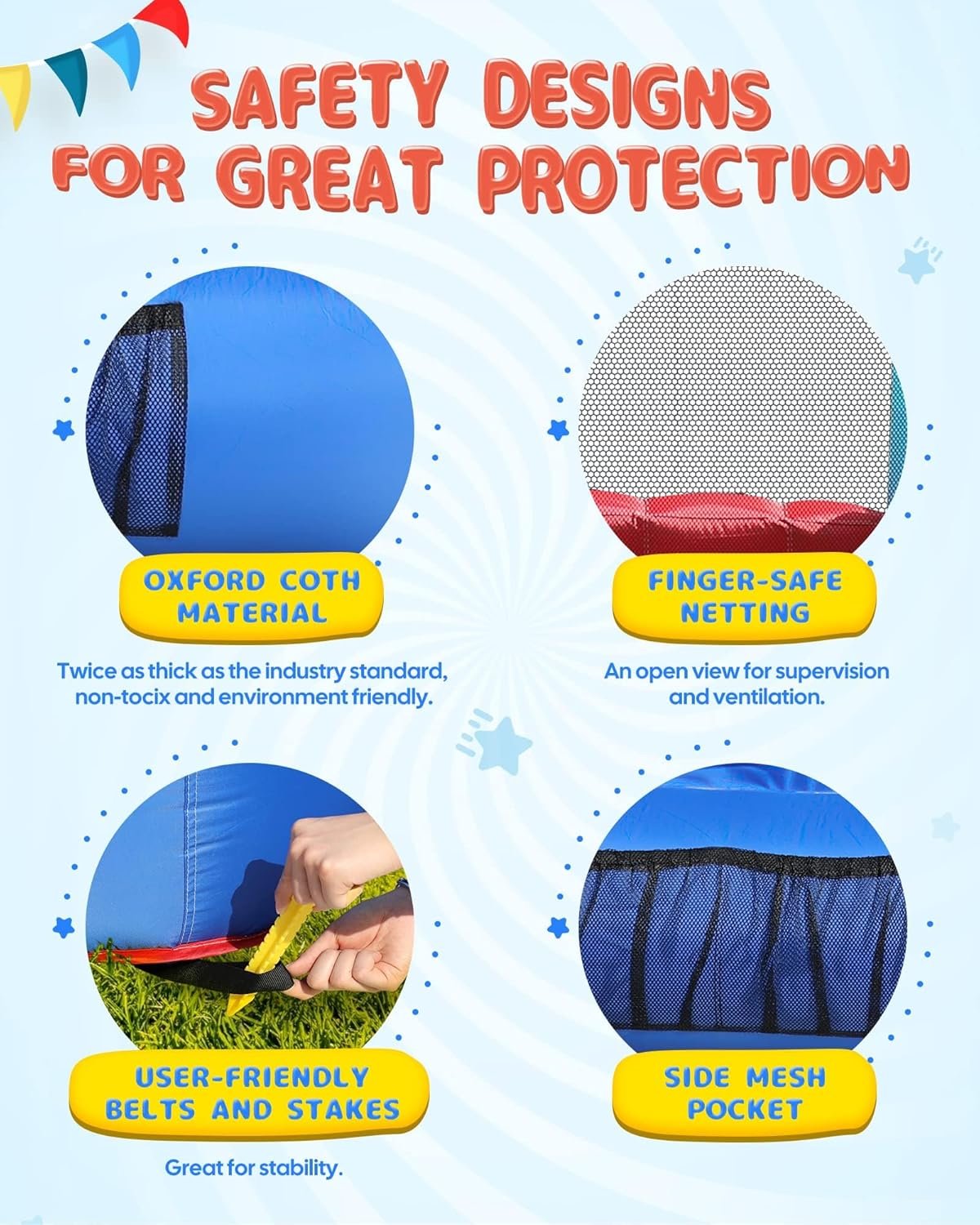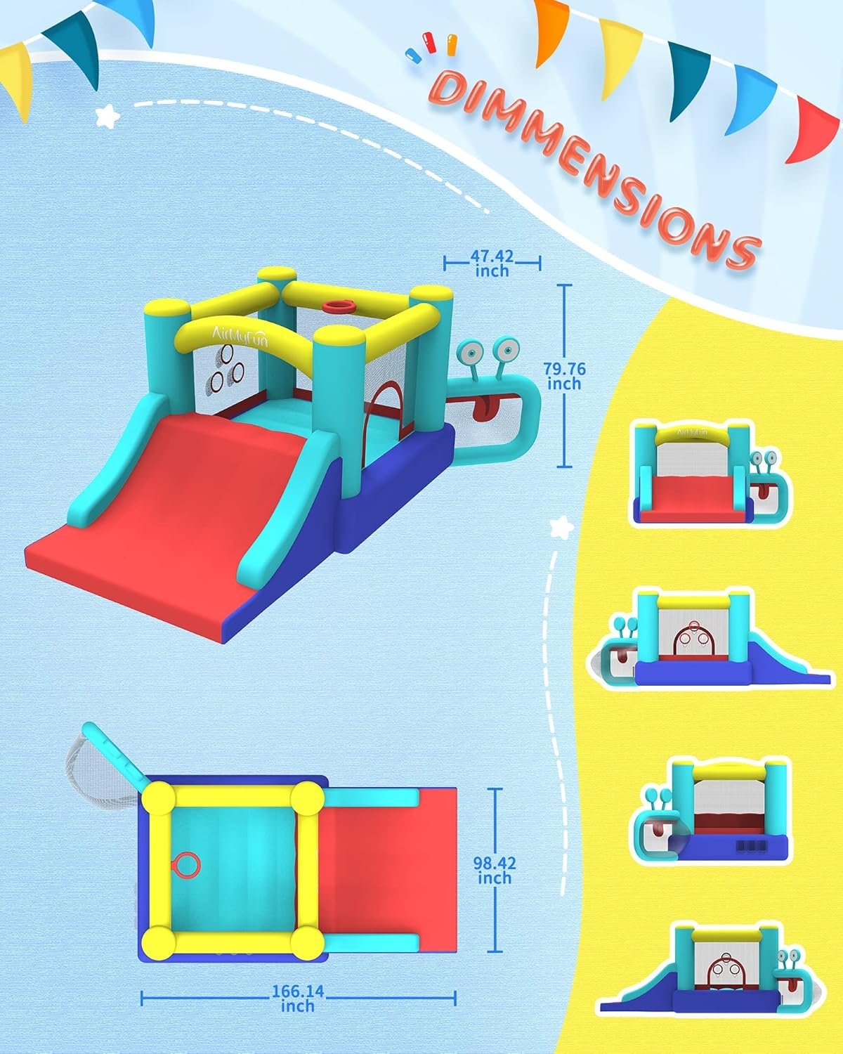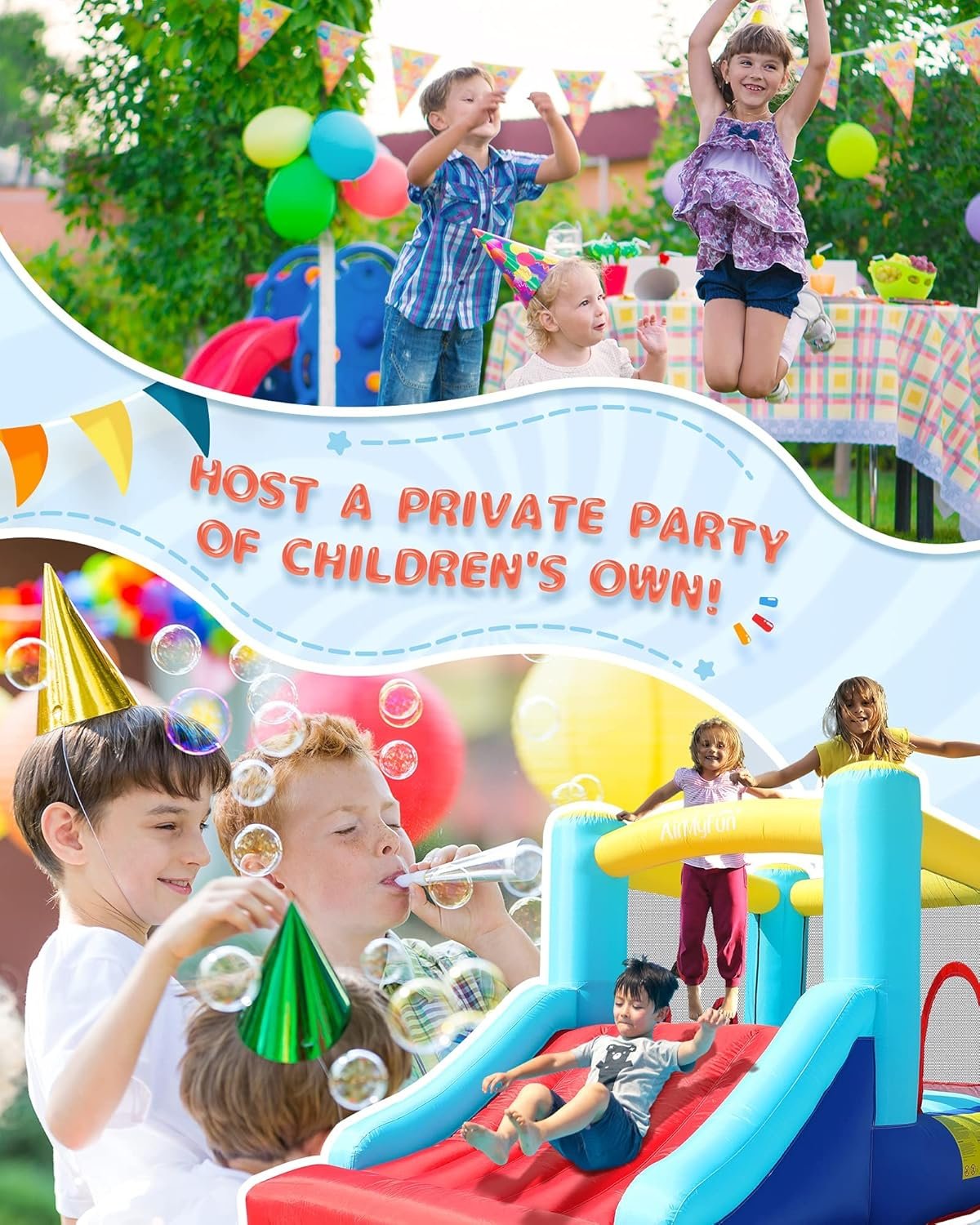 The AirMyFun inflatable bounce house features high-strength materials for durability and safety, compliant with Lead-Free Toys standards. It has a spacious jumping area with mesh walls for protection and visibility, suitable for both indoor and outdoor use. Quick to set up, inflating in under two minutes, this portable bouncer includes double-stitched seams and a variety of play options like sliding and baseball. Designed for multiple children (up to 250 lbs total), it ensures safe, active fun and makes an ideal gift for any occasion.