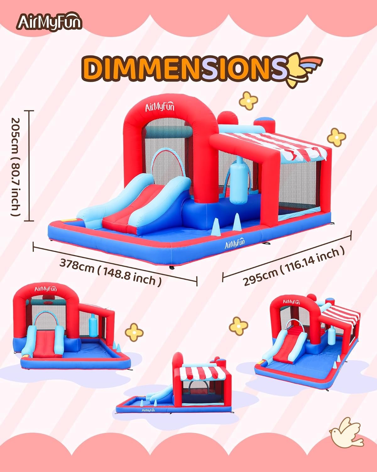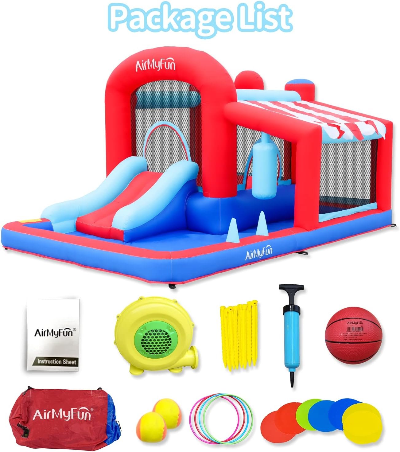 The AirMyFun New Bounce House is a water bounce house ideal for summer fun, recommended for kids aged 3 and up, holding 2-3 children. Measuring 148.8x116x80.5 inches, it features a safety netting and a playful design with a french fries theme. Made from durable, easy-to-clean materials, it ensures comfort and longevity. The bounce house inflates quickly with an air blower and offers reinforced sidewalls for safety. The included accessories consist of a repair kit, bouncer stakes, a 350W air blower, and a carrying bag for convenience.
