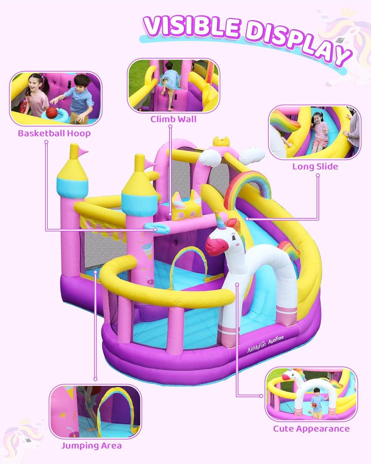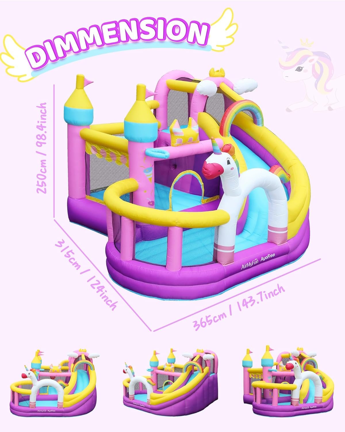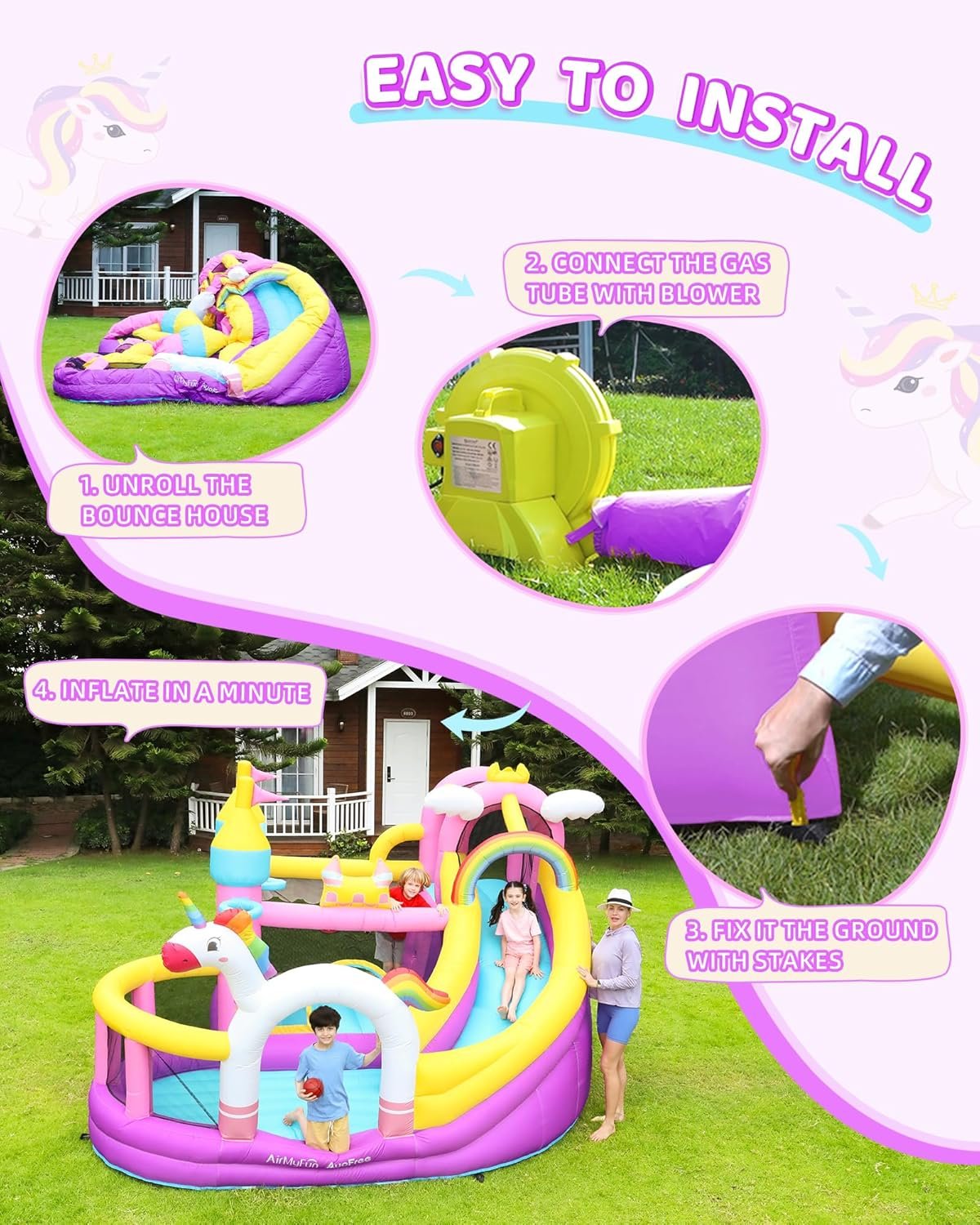The Unicorn Inflatable Bounce House offers hours of fun for kids with a design featuring a double slide, climbing wall, and air cushion ball pit, ensuring safety with its built-in net. Measuring 143.7 x 124 x 98.4 inches, it can accommodate 2-4 children and is suitable for both indoor and outdoor use. Installation is quick, taking under 2 minutes to inflate with continuous blower operation. Ideal for home-based play or parties, it promotes children’s enjoyment while alleviating parental stress. Easy to deflate and store, it serves as a delightful attraction for various occasions.