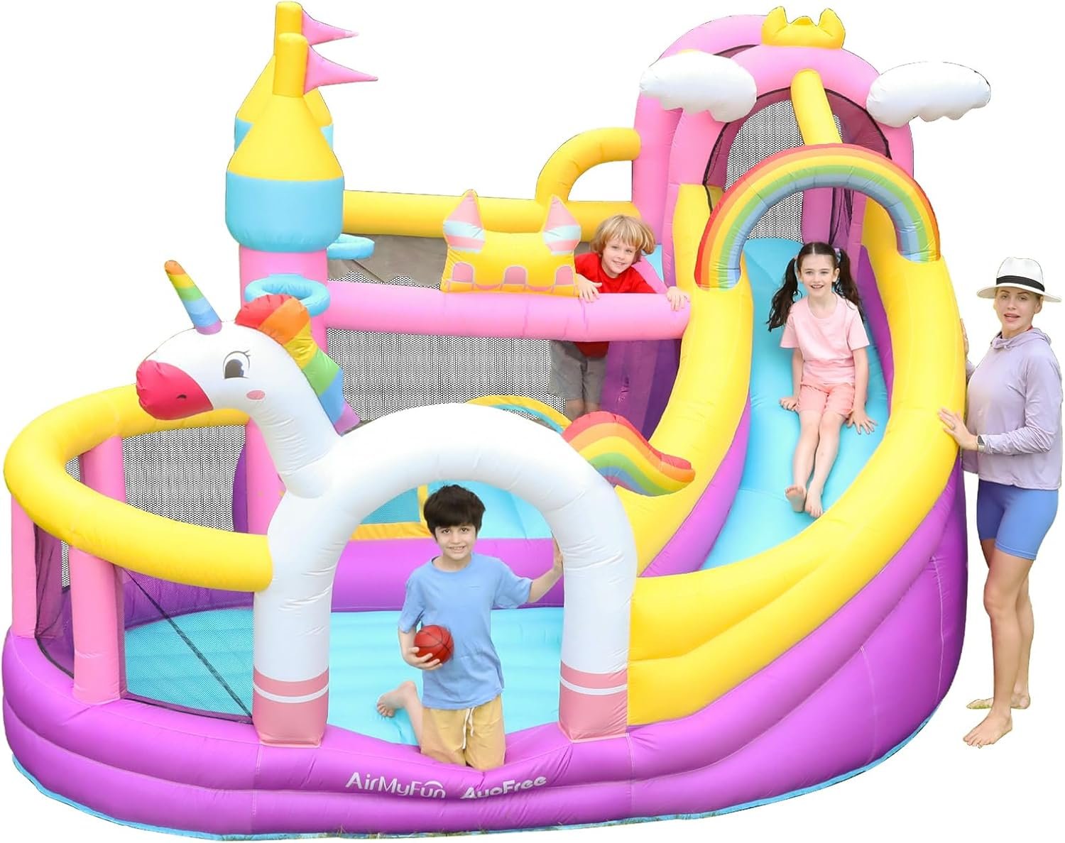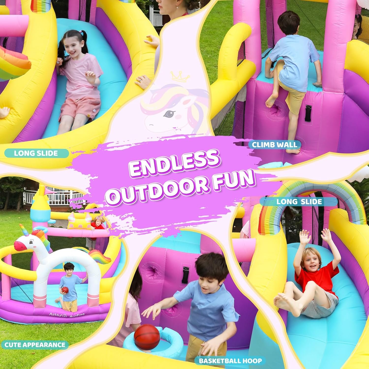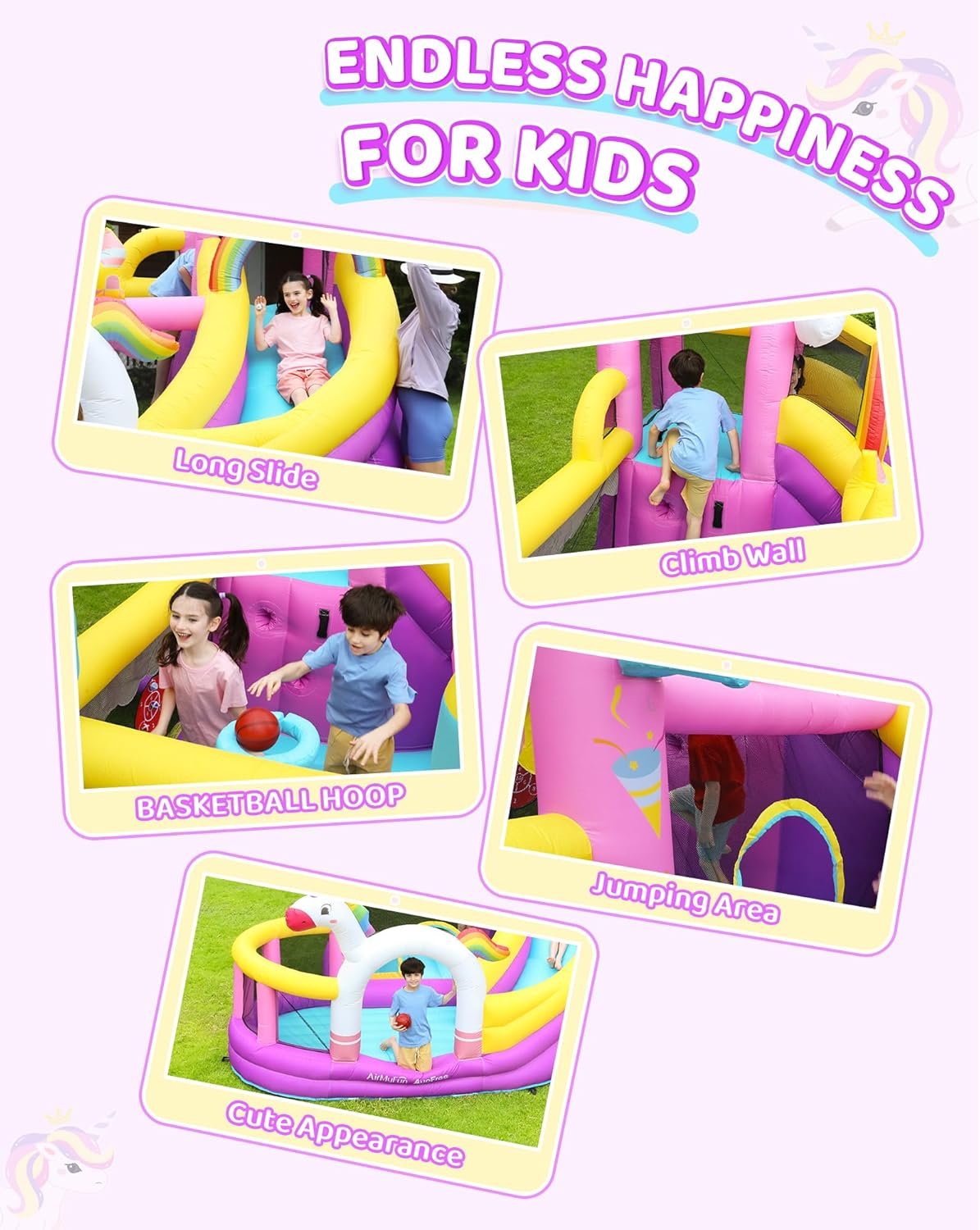 The Unicorn Inflatable Bounce House offers hours of fun for kids with a design featuring a double slide, climbing wall, and air cushion ball pit, ensuring safety with its built-in net. Measuring 143.7 x 124 x 98.4 inches, it can accommodate 2-4 children and is suitable for both indoor and outdoor use. Installation is quick, taking under 2 minutes to inflate with continuous blower operation. Ideal for home-based play or parties, it promotes children’s enjoyment while alleviating parental stress. Easy to deflate and store, it serves as a delightful attraction for various occasions.