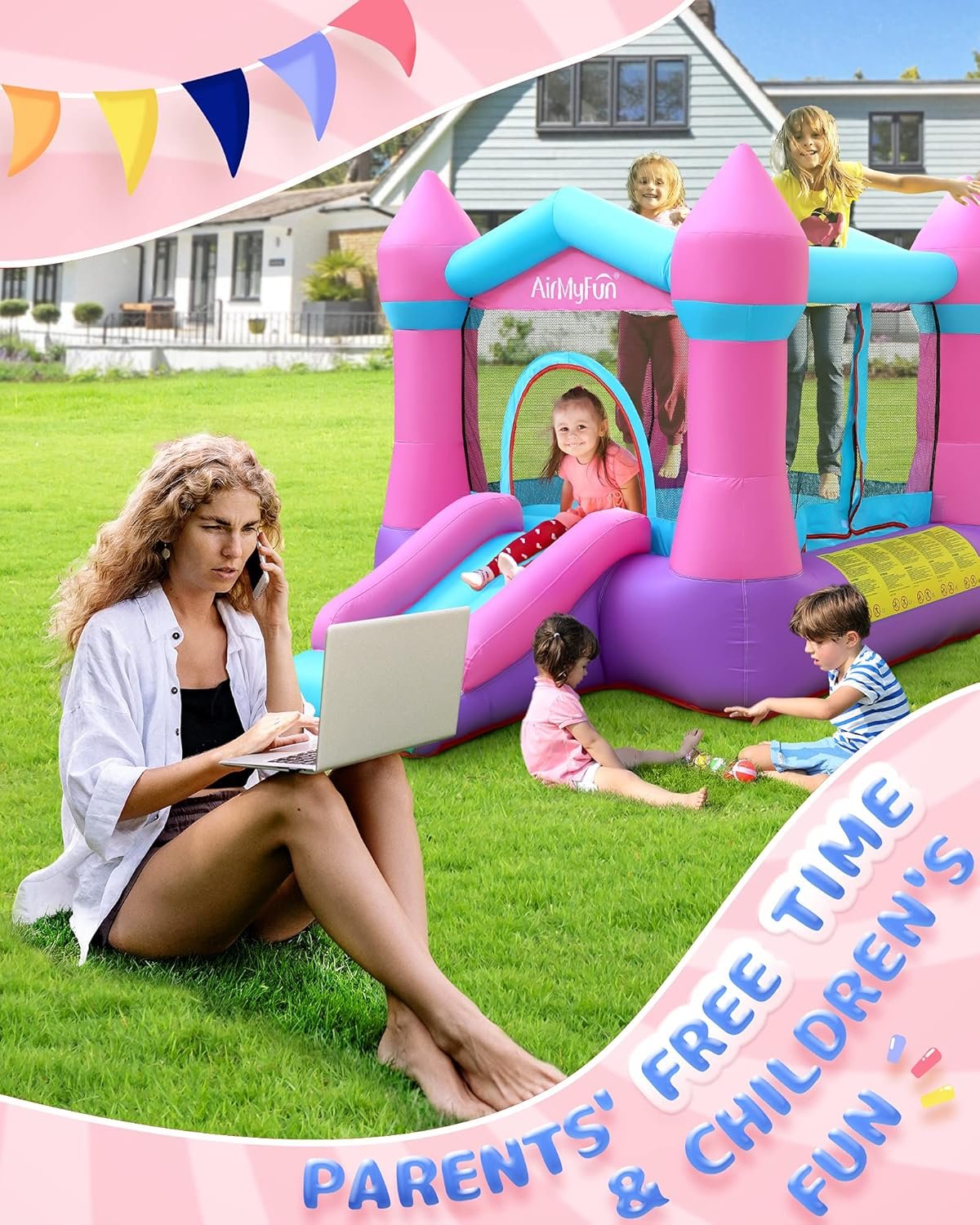 The AirMyFun inflatable bounce house prioritizes safety with non-toxic materials, double-stitched seams, and mesh netting, allowing kids to play freely while parents supervise. Designed for active fun, it accommodates 2-3 children aged 3-8, featuring a large jumping area and slide for endless indoor or outdoor enjoyment. Made from durable materials, it resists punctures for long-lasting use. The bounce house includes a 350W blower for swift setup, along with a repair kit and carrying bag for easy transport. It’s an ideal gift for kids, promoting physical activity and providing hours of entertainment.