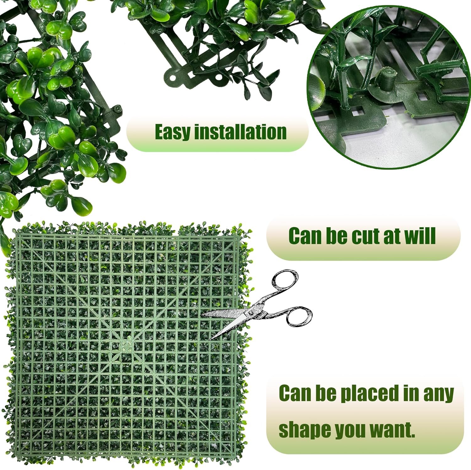 The boxwood roll panels feature a porous base, allowing for interconnection and customization. With 5,600 realistic leaves, each 140 x 40 inches panel covers 39.2 square feet. They are versatile for indoor and outdoor use, ideal for walls, fences, and decorations for events. Made from durable, UV-resistant PE, these panels don’t fade for three years and are safe with flame retardant properties. Easy to install with 50 zipper tapes and interlocking connectors, they can be cut to size. Initially sparse, the leaves can fluff up in sunlight or be adjusted by hand for a fuller look.