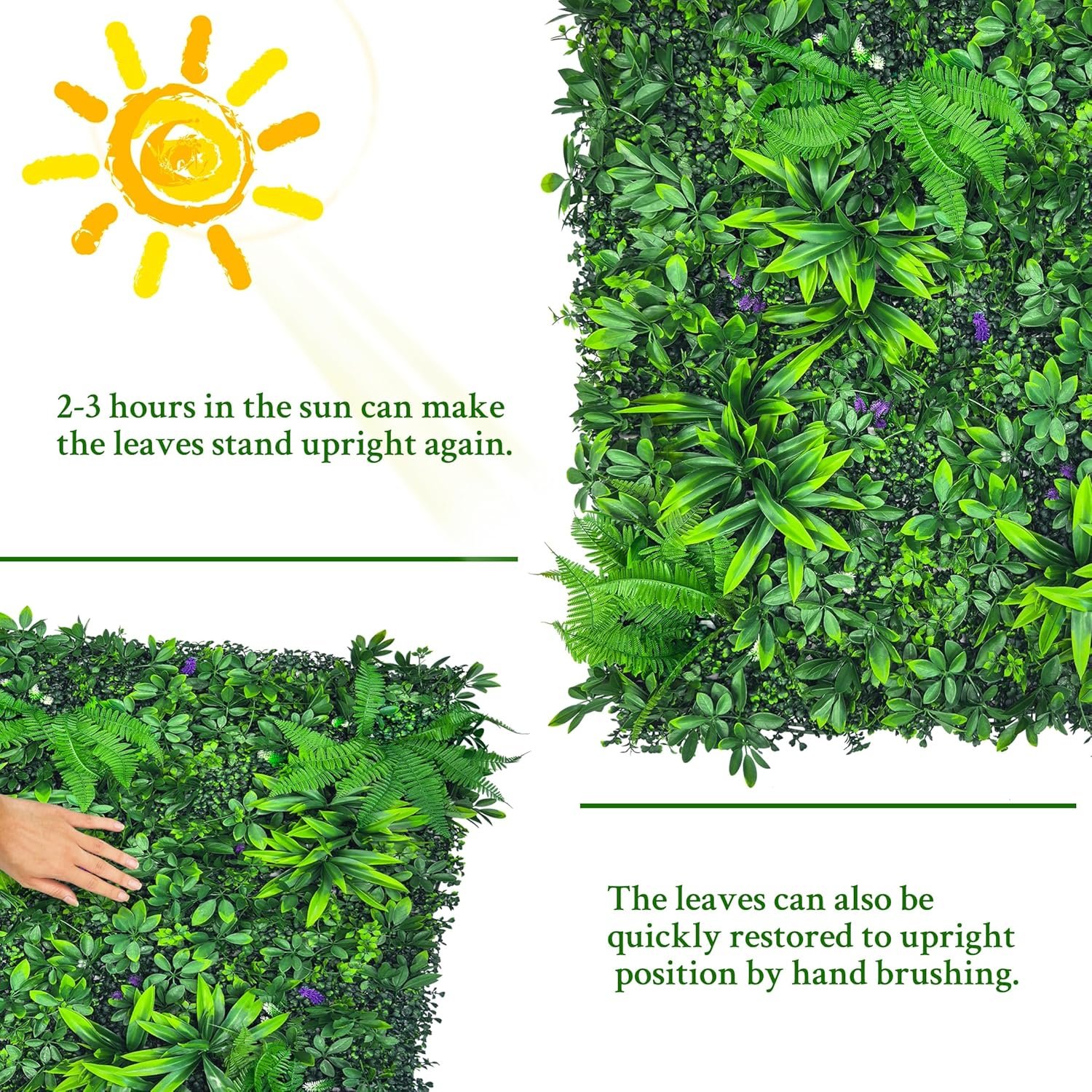 The Artificial Boxwood Hedge Panel is a dense, realistic privacy screen measuring 50×120 inches, covering 42 sqft. Designed for both indoor and outdoor use, it enhances spaces like bathrooms, balconies, and gardens with a 3D effect. Made from lightweight, durable polyethylene, it’s sun-proof and weather-resistant, requiring low maintenance. The panel includes 50 cable ties and can be cut for customization. Initial packaging may cause the leaves to look sparse, but they’ll recover with sunlight or gentle handling. Ideal for events and decor, it’s available in various styles at ODTORY’s flagship store.