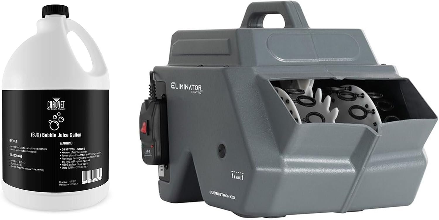 Audiosavings Bundle: (1) Eliminator Lighting ADJ BUBBLETRON EXL Portable High Output Bubble Machine Bundle with (1) Chauvet DJ BJG Gallon Bubble Fluid Juice 4 Hurricane Bubble Haze (2 Items)