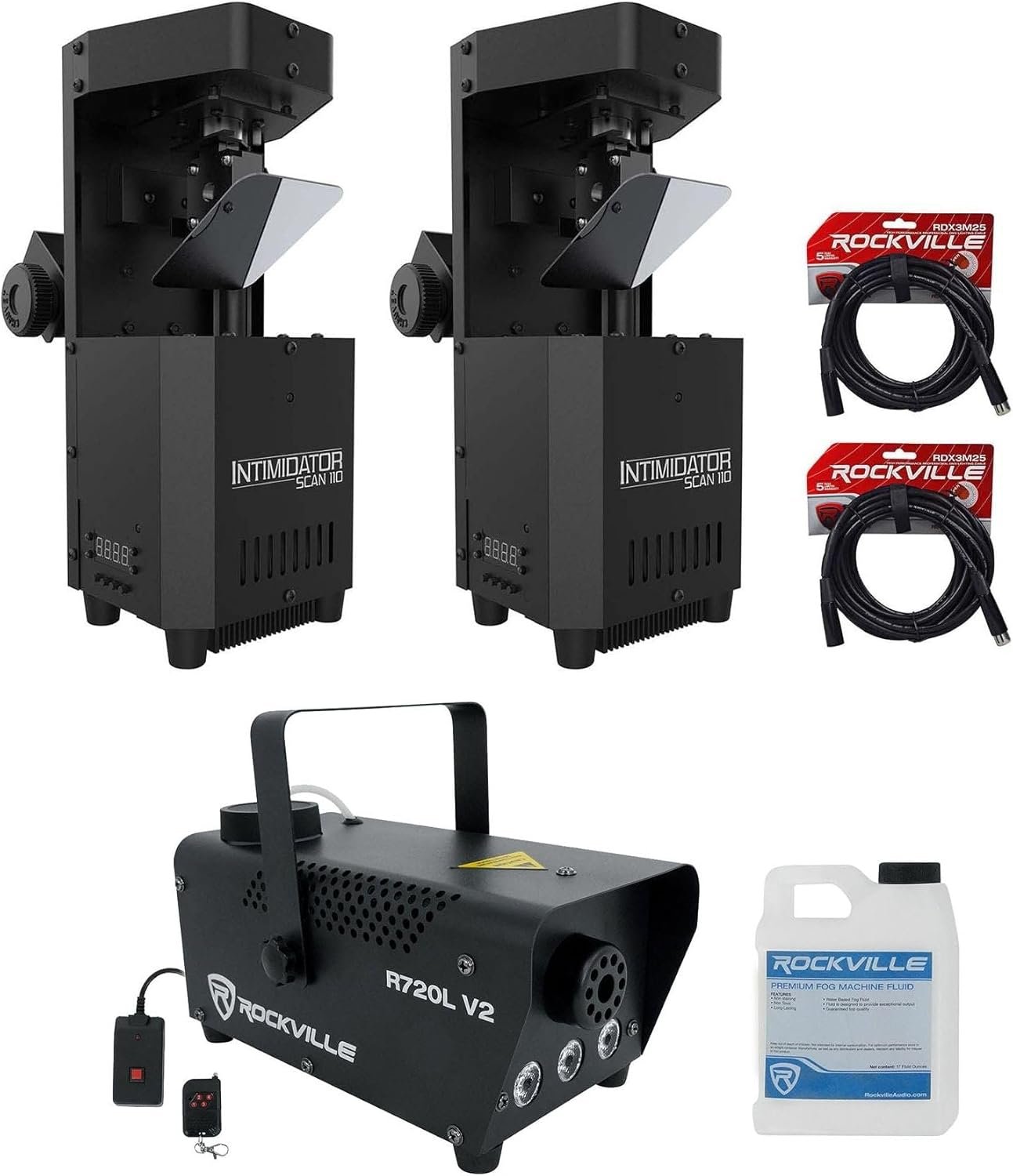 Transform your events with this ultimate lighting package! Featuring (2) Chauvet Intimidator Scan 110 LED scanners, a Rockville R720L fog machine, and (2) 25-ft DMX cables, it guarantees professional-grade performance. Perfect for DJs and parties, it delivers vibrant lighting and immersive fog!