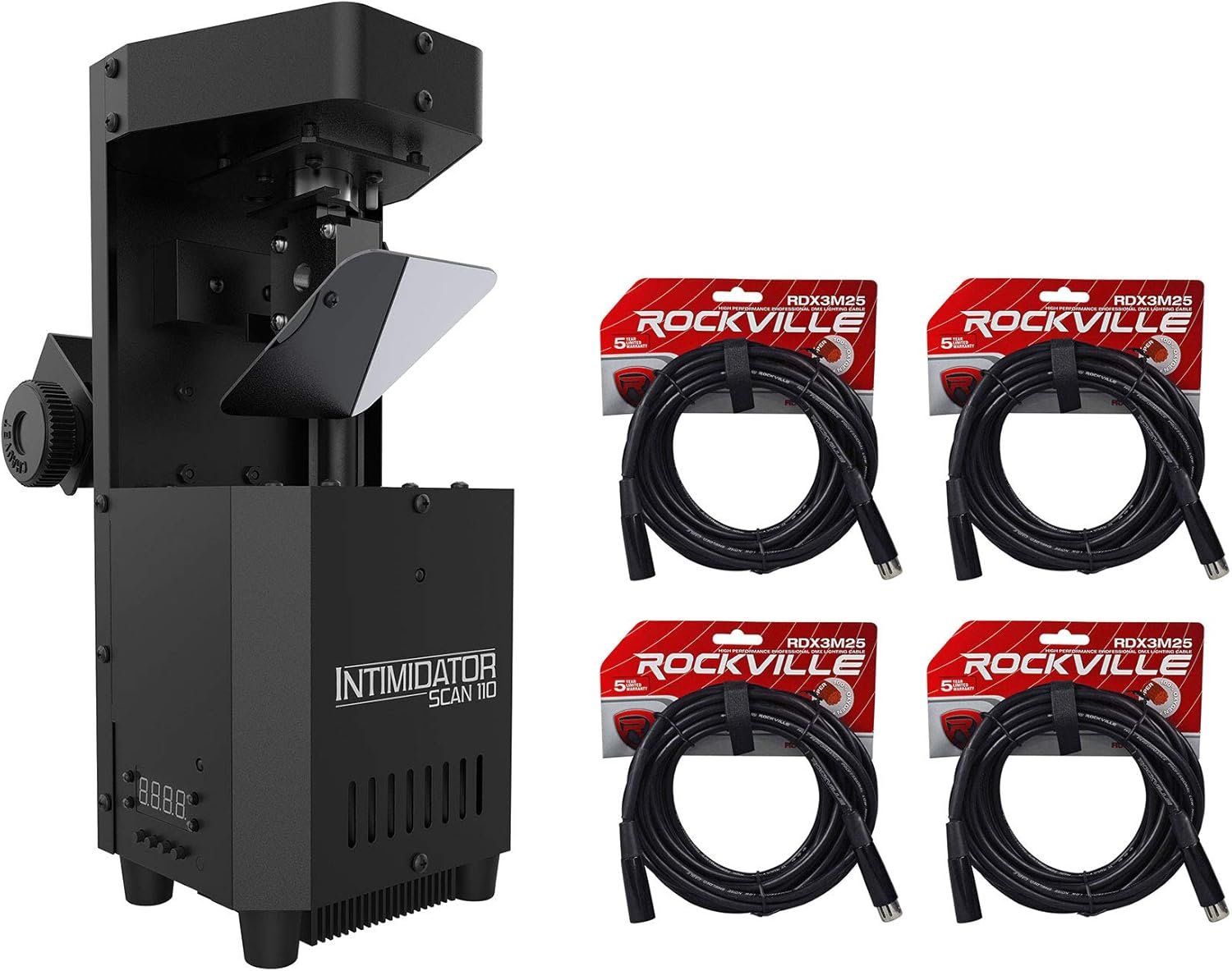 Elevate your event lighting with the Chauvet Intimidator Scan 110 LED Scanner and Rockville RDX3M25 DMX Cable Bundle. The powerful, compact scanner features a 10W LED with 50,000 hours of life, DMX compatibility, and 180-degree pan and 45-degree tilt for full coverage. It includes built-in macros and supports sound activation for easy programming. The bundle also comes with four 25-ft Rockville DMX cables, designed for optimal signal clarity and interference rejection. Perfect for DJs and event planners, this package offers dynamic lighting solutions and hassle-free setup for any occasion.
