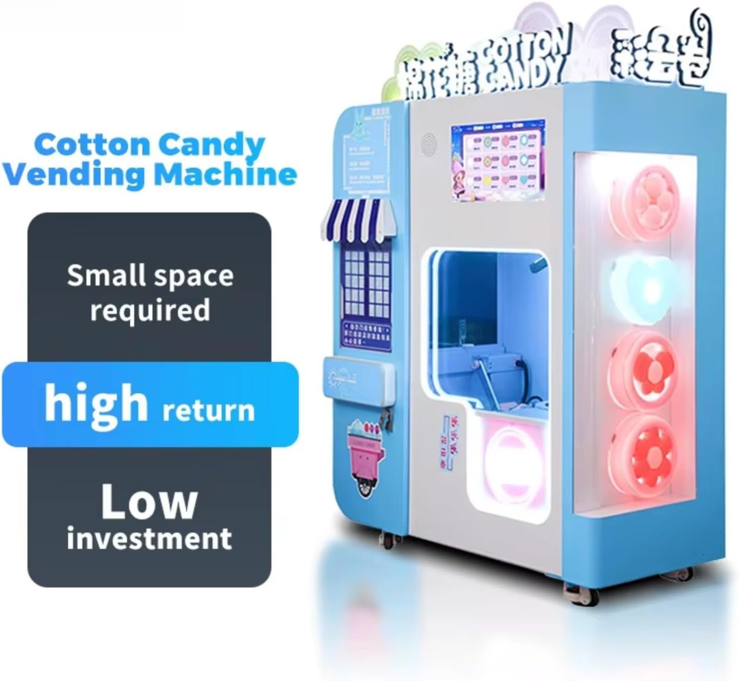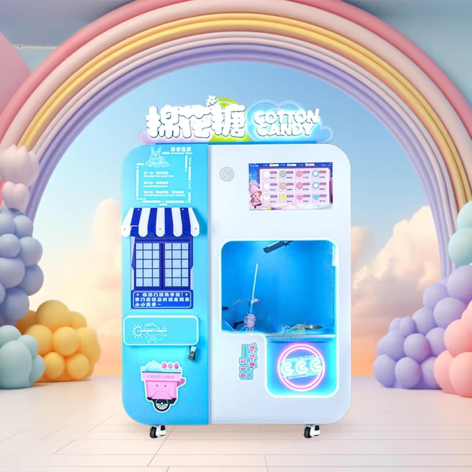 The Caiyunjuan Cotton Candy Vending Machine, from Guangdong, China, is a fully automatic, high-efficiency unit measuring L147W67H195 cm. Weighing 350 kg, it has an 8-12 kg capacity and can produce colorful cotton candy using 30g of sugar per serving. The machine features a user-friendly touchscreen for selecting sugar colors and payment options, including cash, coin, card, and QR code. Designed for high-volume use in shopping malls, amusement parks, and subway stations, it offers customizable specifications. The warranty period is one year. For pricing and details, contact +86 13837123037.
