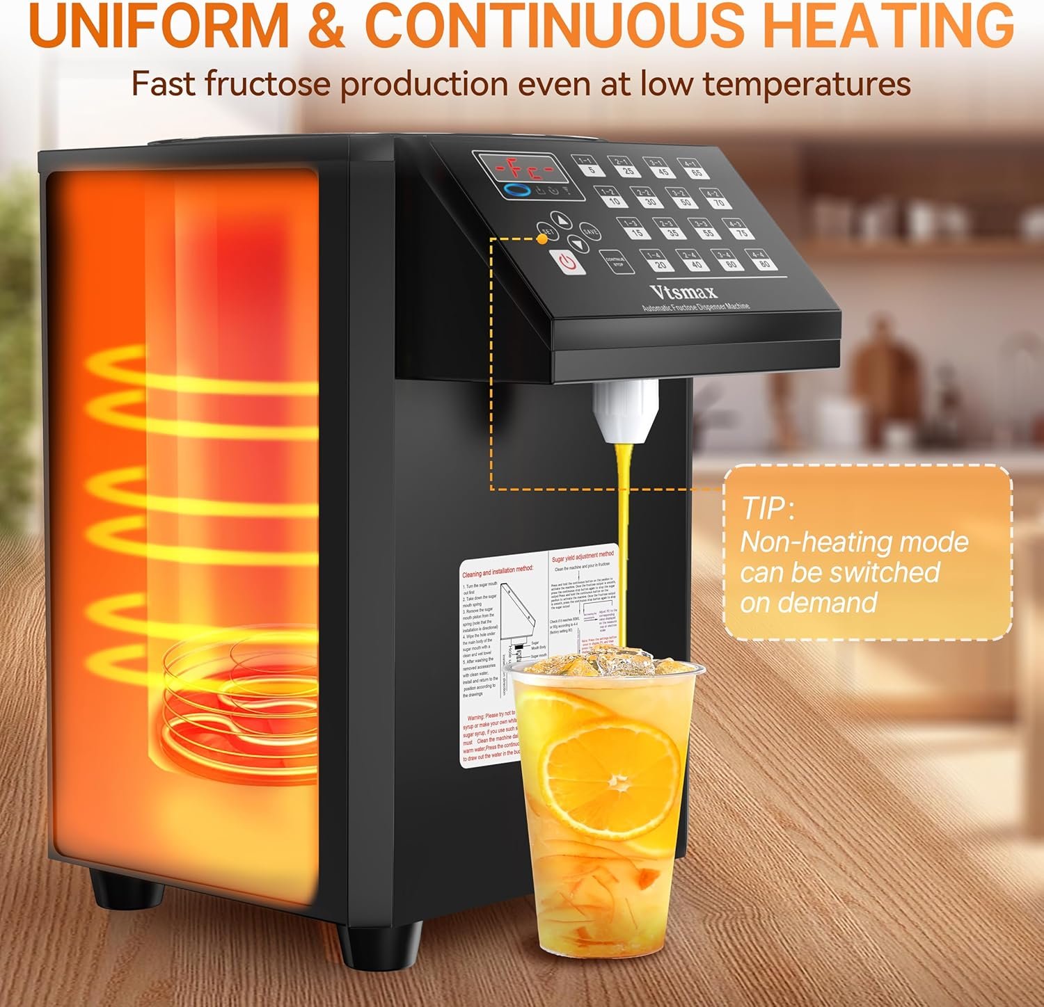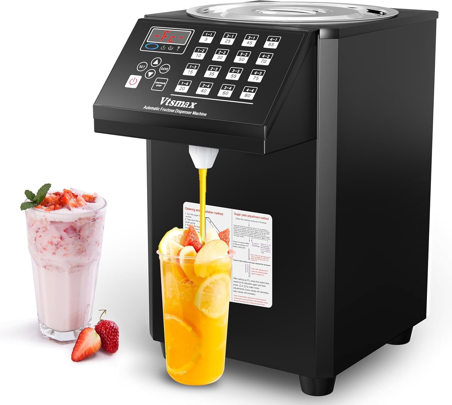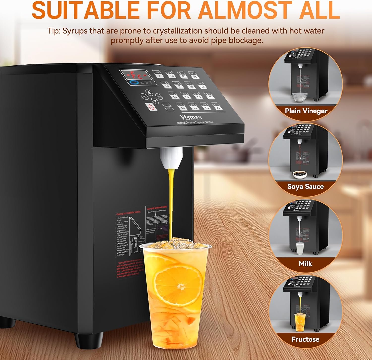 The Vtsmax fructose machine features 16 programmable memory buttons for customizable sugar output and can dispense approximately 400 cups of drinks, ideal for high traffic situations. Made of durable 304 stainless steel, it’s easy to clean and maintain. The machine utilizes constant temperature technology to prevent syrup crystallization, ensuring consistent performance even in cold conditions. Its user-friendly panel includes video instructions, while the self-locking spout prevents drips. Suitable for homes and businesses, it’s perfect for bubble tea shops, cafes, bakeries, and more.