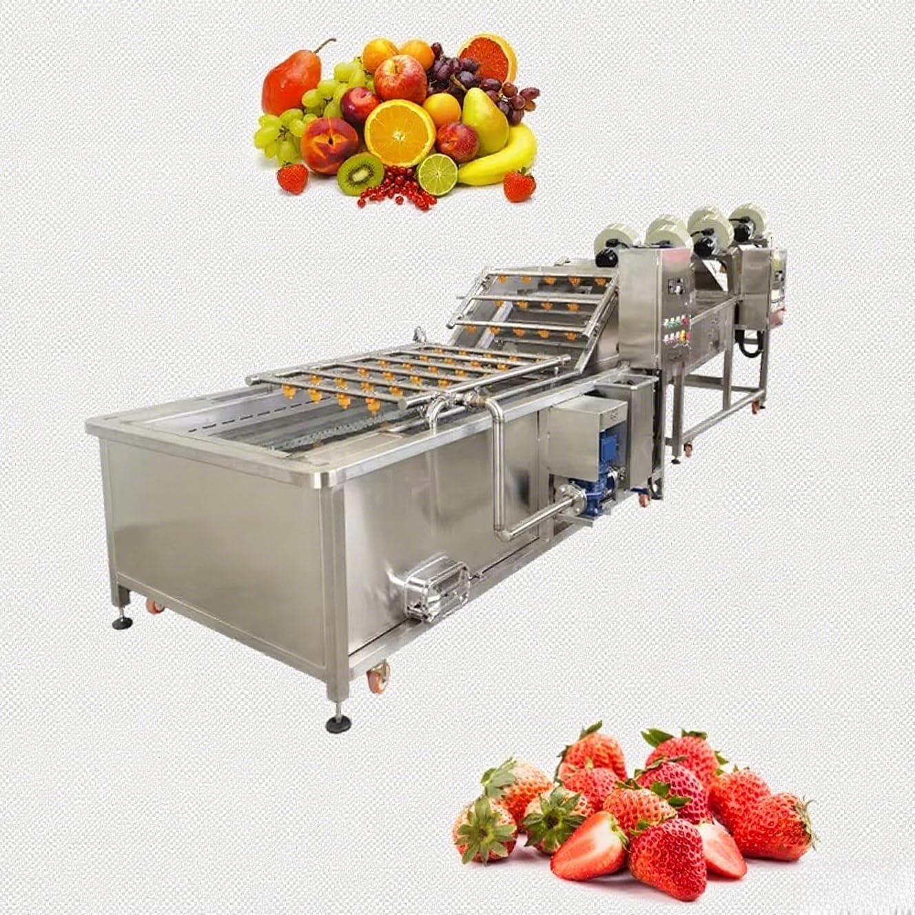 The Vegetables & Fruits Cleaning Machine offers an efficient and user-friendly solution for cleaning various produce, ideal for commercial kitchens, food processing facilities, and farms. Utilizing advanced technology, it employs soaking, rinsing, and gentle brushing techniques, adaptable to different produce types. Constructed from durable, food-grade stainless steel, it features a built-in conveyor for seamless handling of large batches. Its energy-efficient, compact design minimizes labor costs while ensuring hygiene. Customizable options and adjustable parameters enhance its versatility, making it suitable for diverse commercial applications. Easy maintenance and operation are added benefits, streamlining the cleaning process for fresh produce.