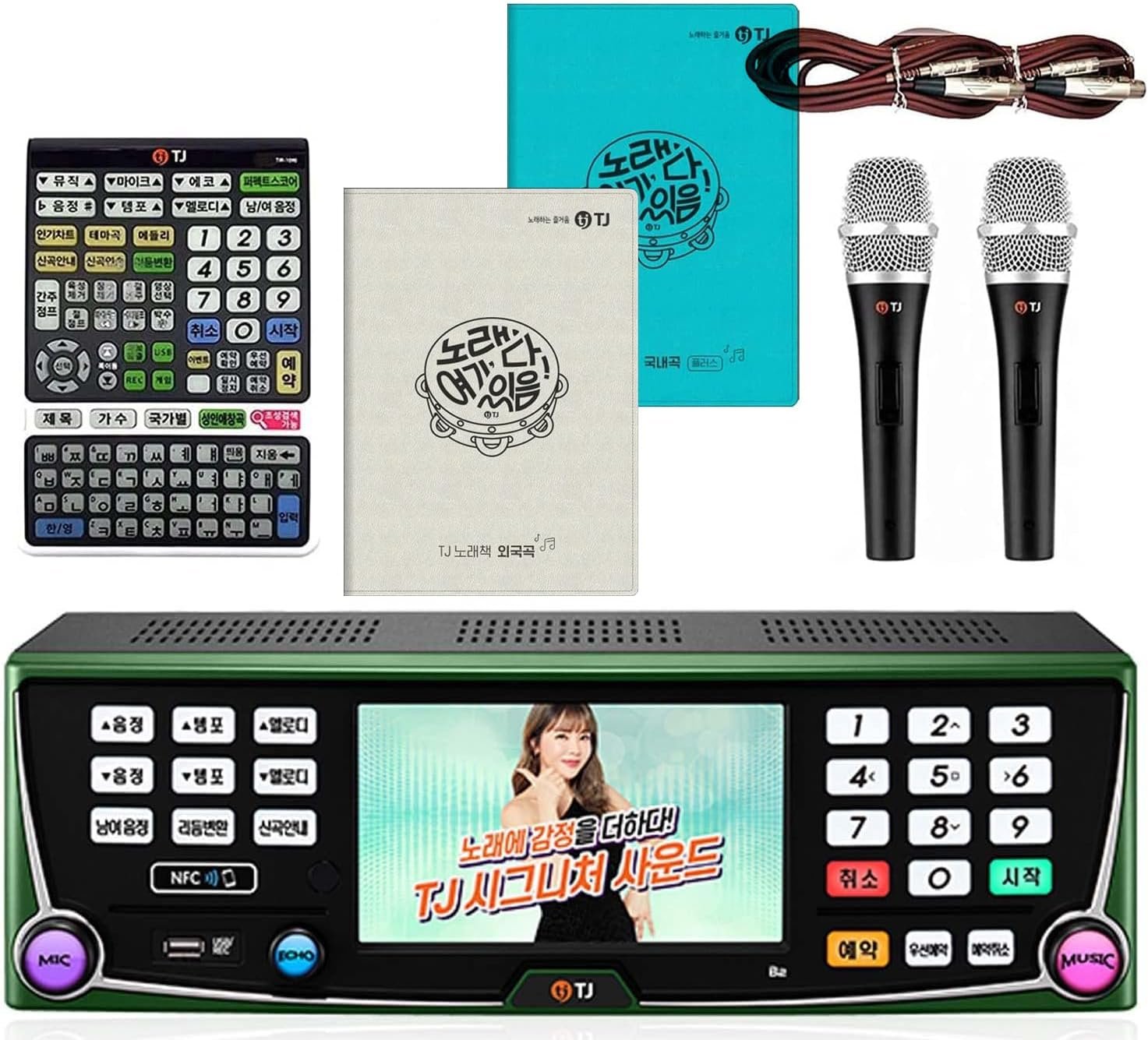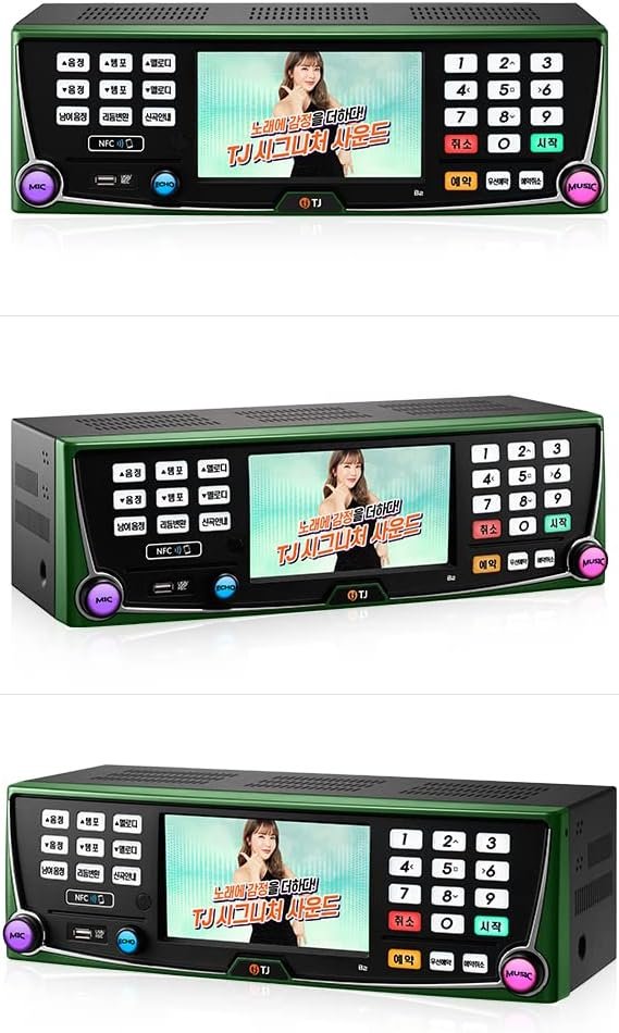 This karaoke device is a Korean version (TJ B2) with all manuals and songs primarily in Korean (90% Korean, 10% foreign). It operates on 110V to 220V and consumes 40W, with a 1TB HDD. Weighing 4.6kg and measuring 420 x 144 x 211.6 mm, it includes a US conversion plug for buyers. Features include a 7-band mic EQ, 15-band music EQ, and Bluetooth connectivity for YouTube songs. Note that it requires a separate amplifier and speakers to function. The package includes the karaoke body, remote control, song books, a microphone, and necessary cables.