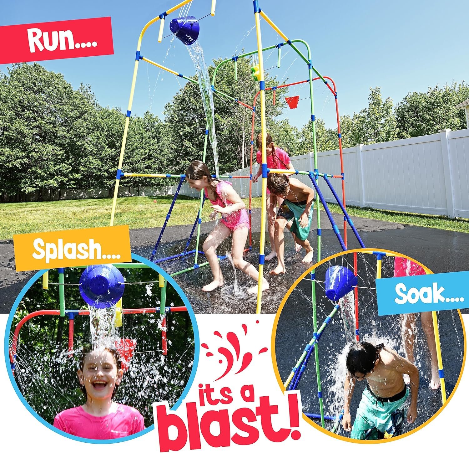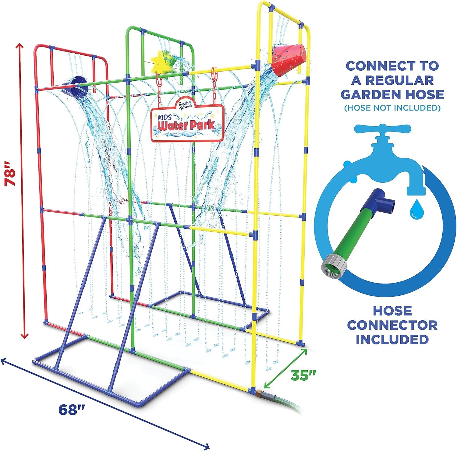 Enjoy splashes and laughter all summer with our backyard water park sprinkler toy! Easy to assemble in 30 minutes, it connects to a standard garden hose. Built to last with sturdy supports, it’s safe for kids and perfect for family fun, measuring 68’L x 35’W x 77.5’H.