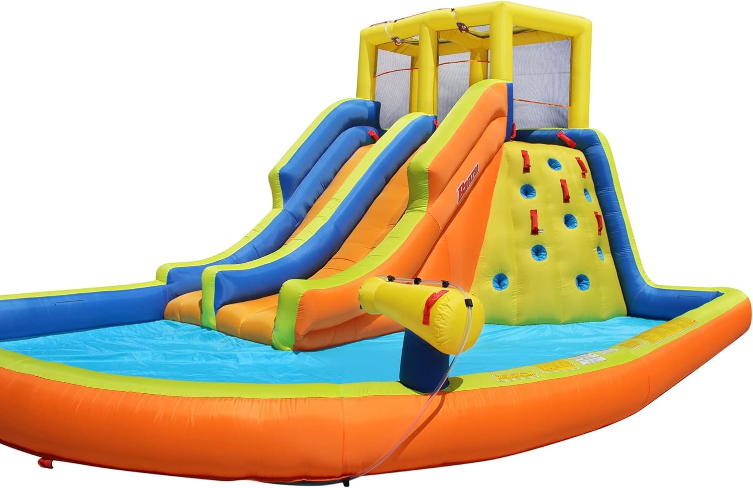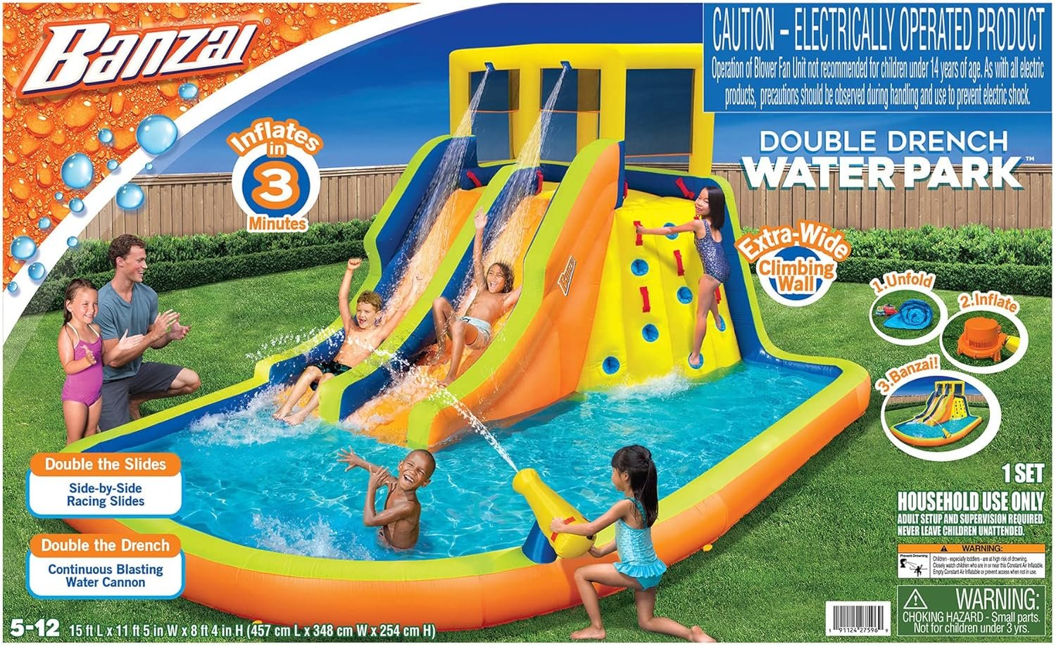 Experience excitement with the Double Drench Water Park, designed for kids aged 5 to 12. Challenge friends on side-by-side racing slides, scale an extra-wide climbing wall, and enjoy a lagoon-style splash pool. Features include a continuous-spraying water cannon and an overhead sprinkler for endless fun. The setup inflates in under 2 minutes with the included blower, and its heavy-duty construction ensures durability. Safety measures include a GFCI blower motor, and the water park includes a storage bag, ground stakes, and a repair kit. With a weight limit of 120 lbs per user, it promises a splashing good time!