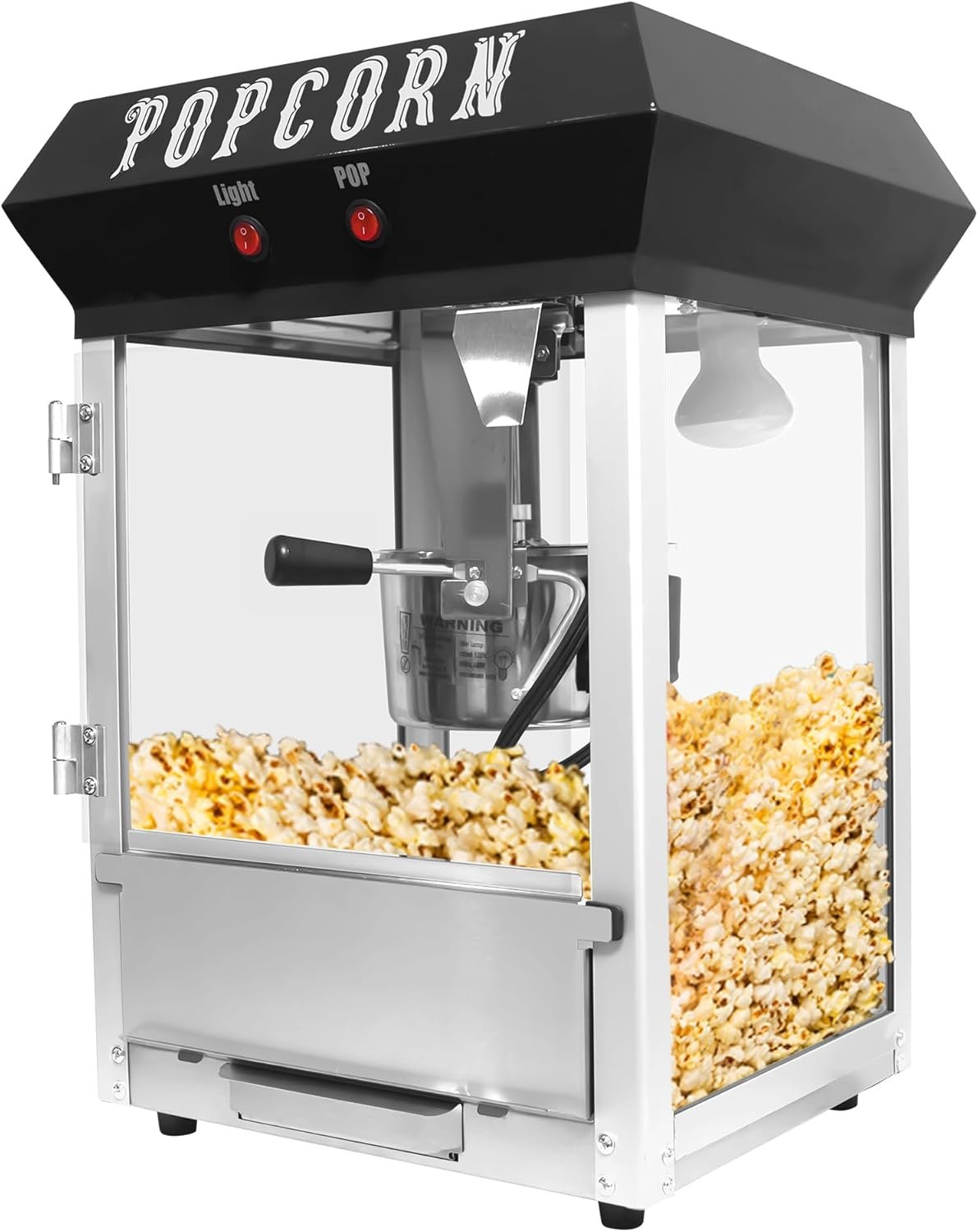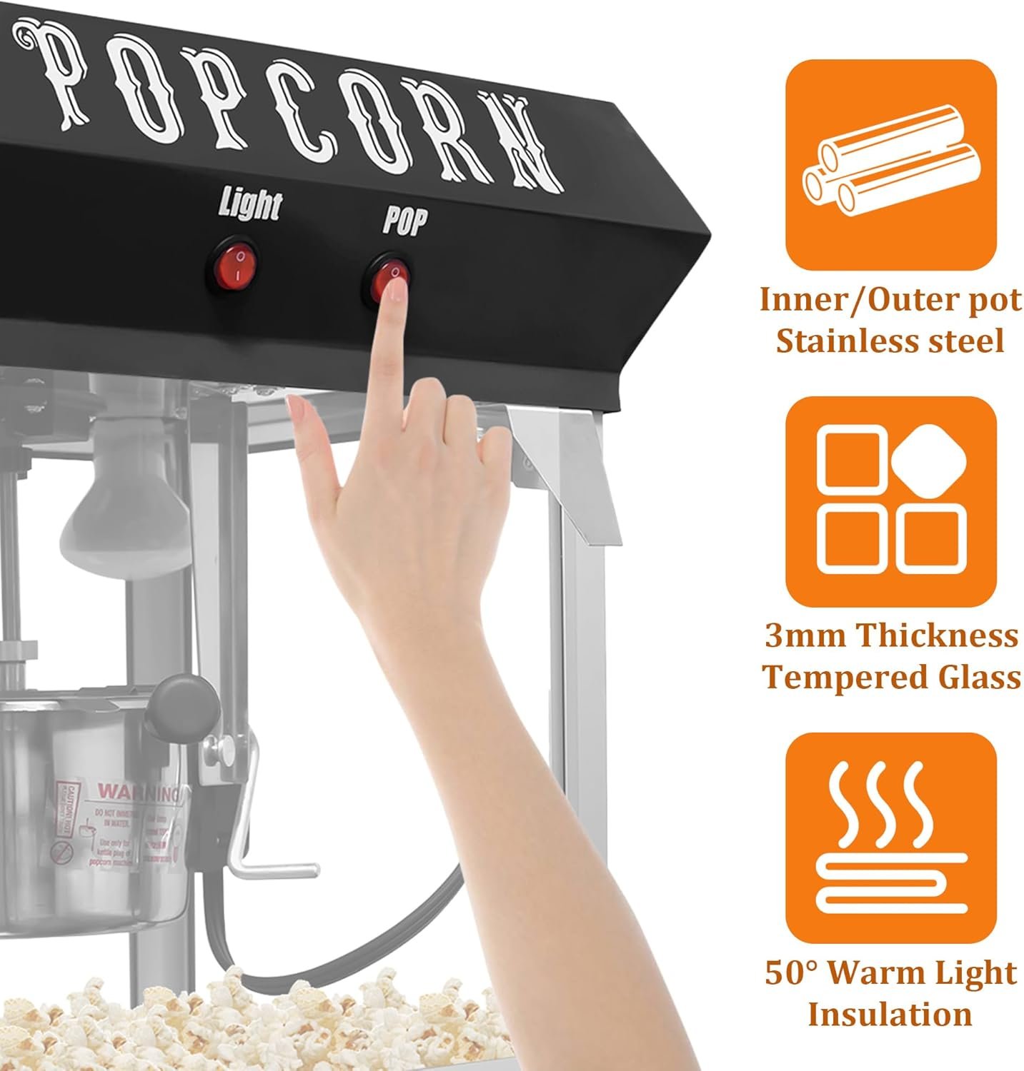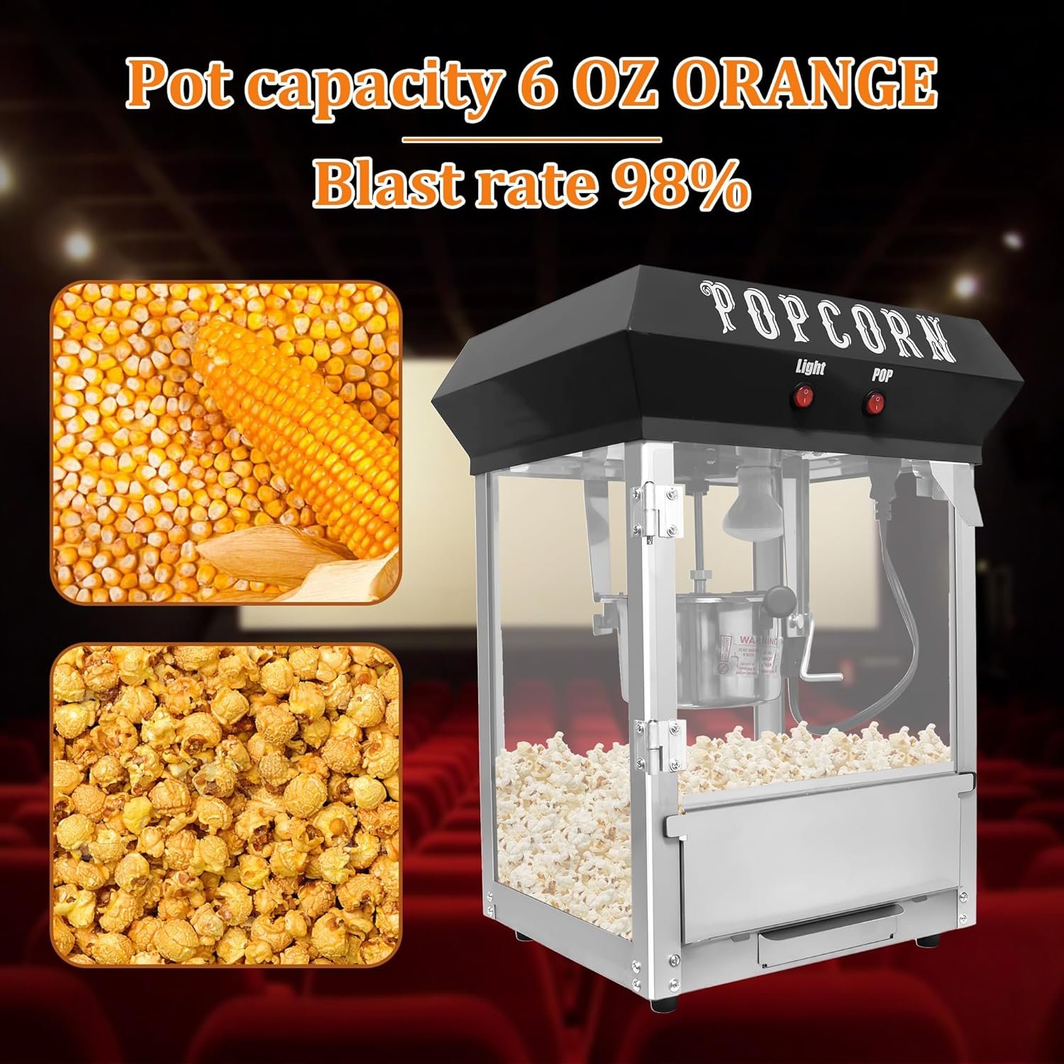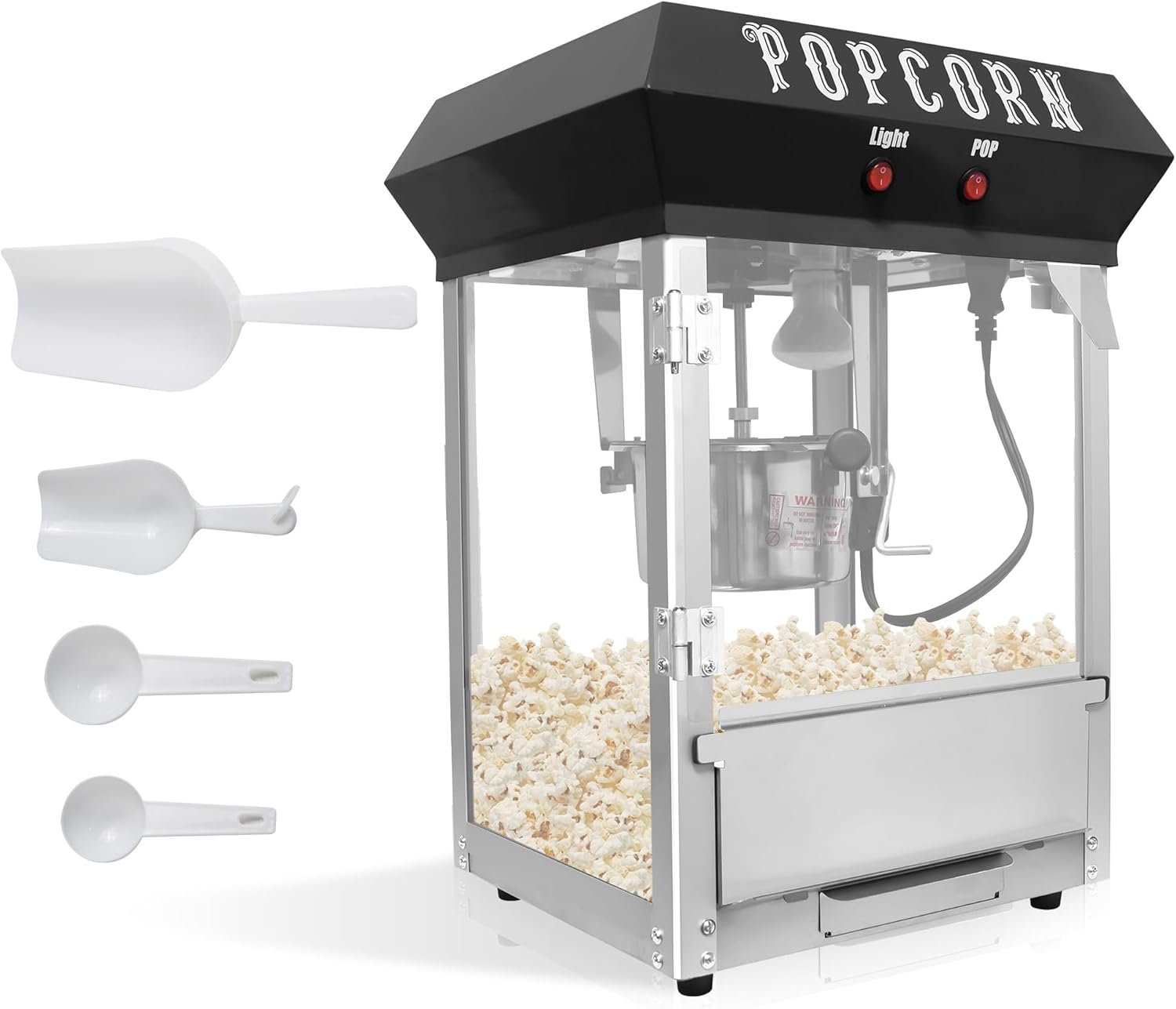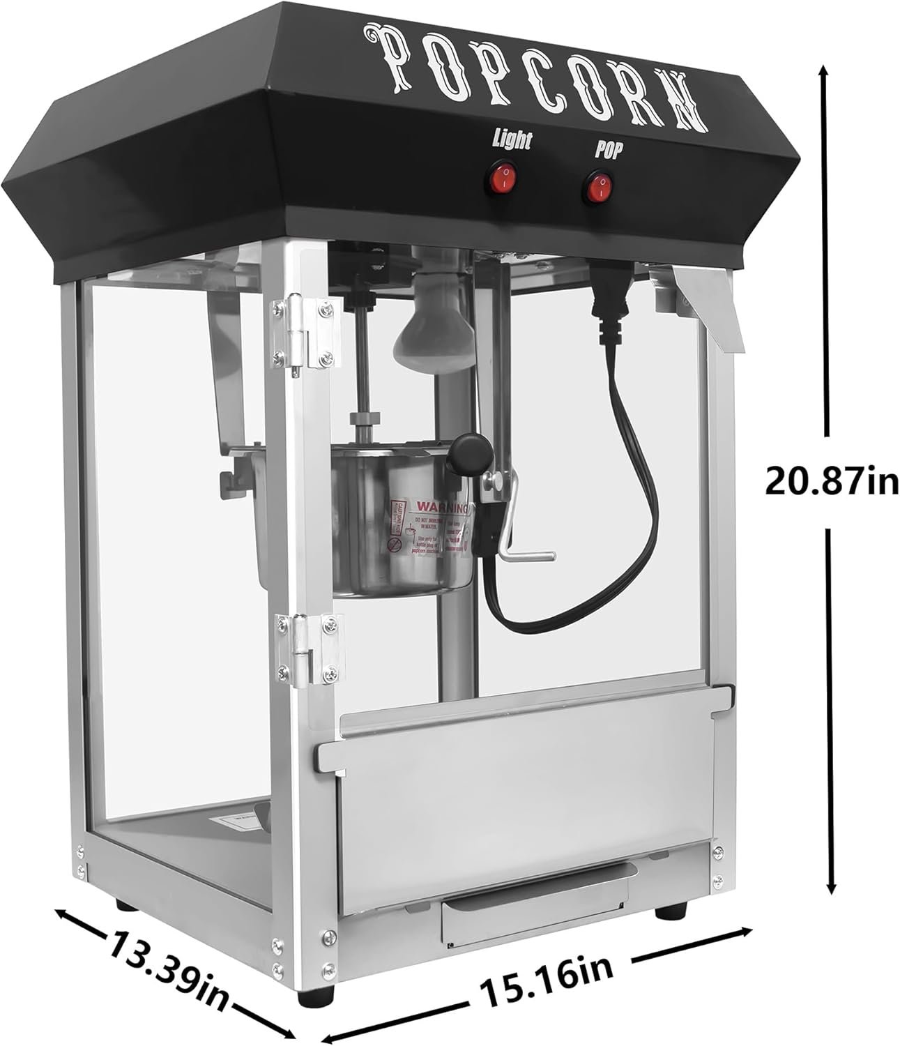 Bar Style Popcorn Machine, 6-Ounce Kettle Stainless Steel Popcorn Maker with Tempered Glass, 600W Electric Popper for Home Theater, Parties, and Events, Black