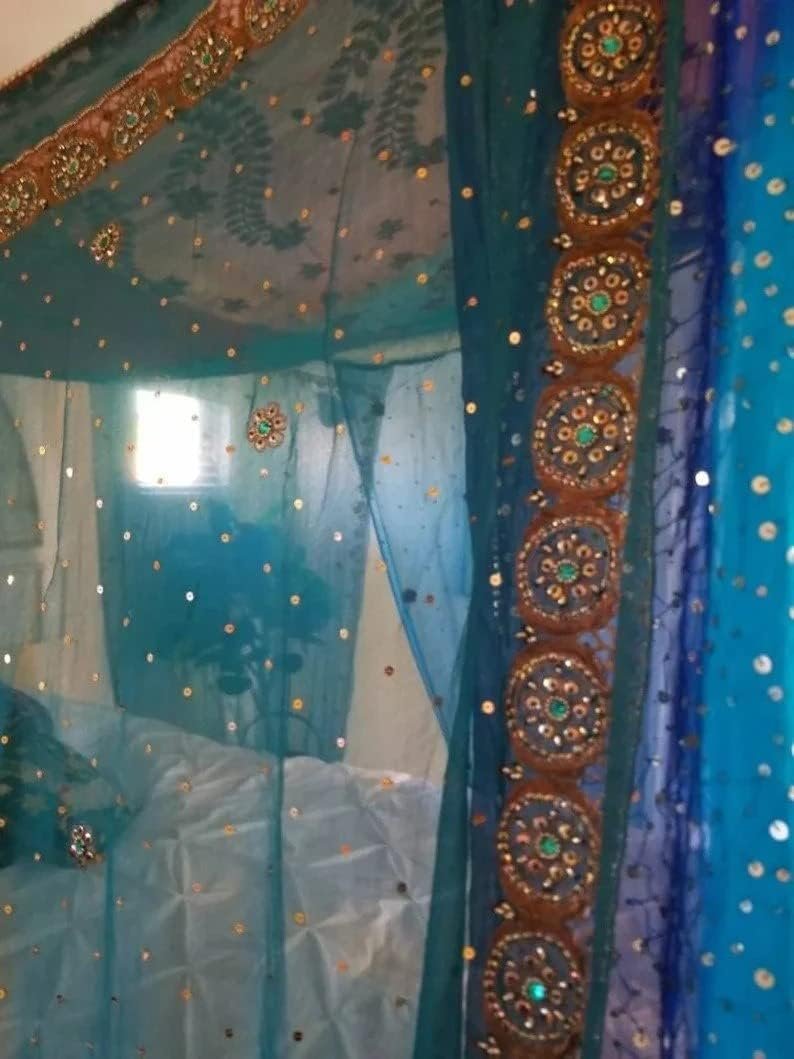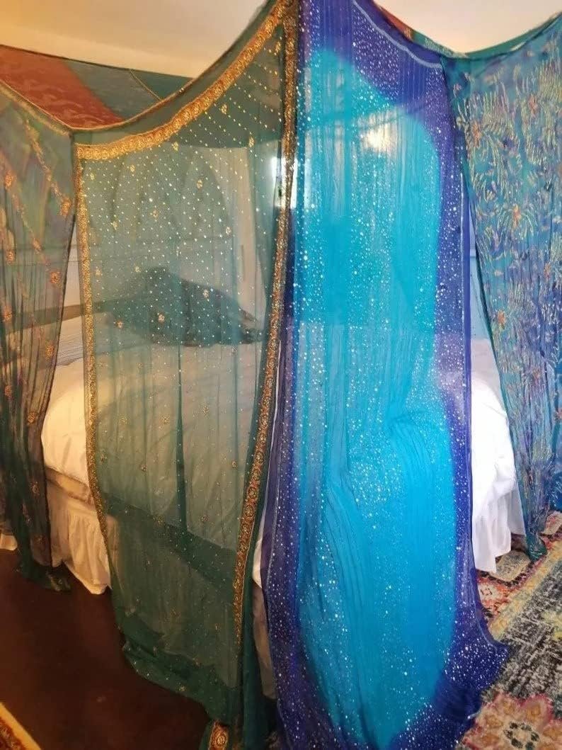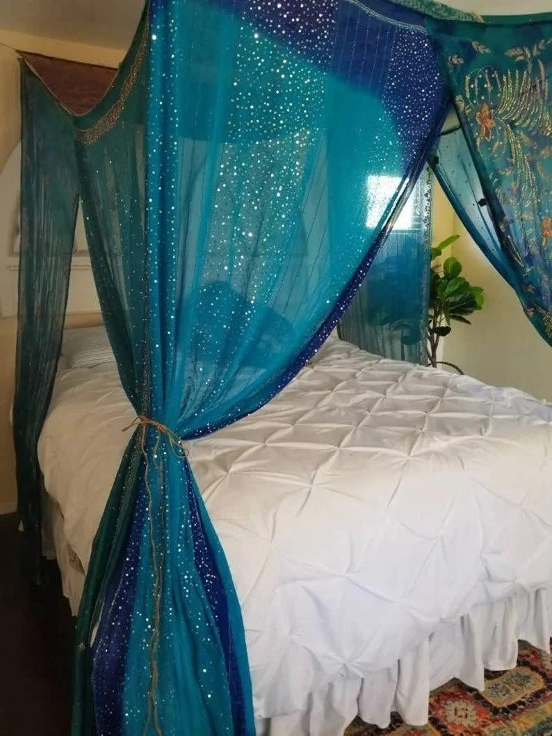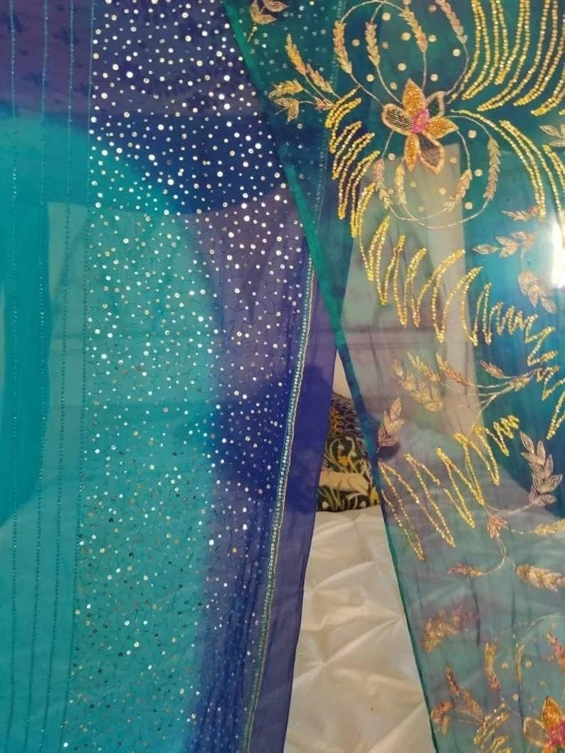 The Midnight Blue Galaxy Bed Canopy is a custom-made, queen-size canopy crafted from rare vintage ombre or tie-dyed scarves from India. Featuring intricate embroidery, beads, and sequins, each panel showcases unique patterns in shades of blue and maroon. It easily attaches to ceiling hooks and can be displayed in various settings. The scarves measure approximately 78″-88″ long, and the setup is simple. Ideal for a bohemian aesthetic, this canopy transforms any space with its stunning design. Please allow 2-3 weeks for the similar-made product.