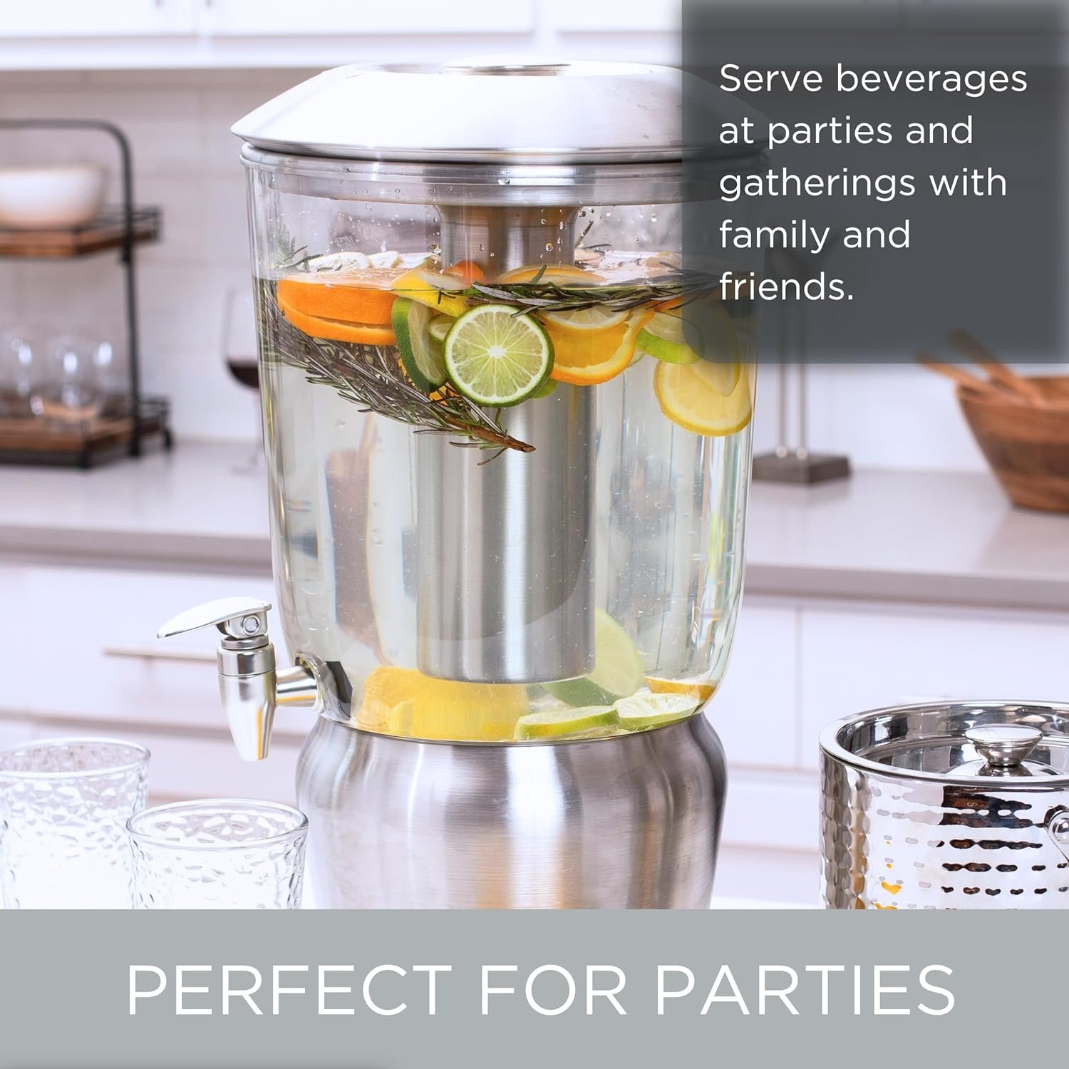 SPACIOUS 3-GALLON CAPACITY: Ideal for parties, this drink dispenser holds 3 gallons of your favorite beverages. DUAL ICE CHAMBERS: Keep drinks chilled without dilution. DURABLE CONSTRUCTION: Made from BPA-free acrylic and stainless steel for long-lasting use. EASY TO CLEAN.