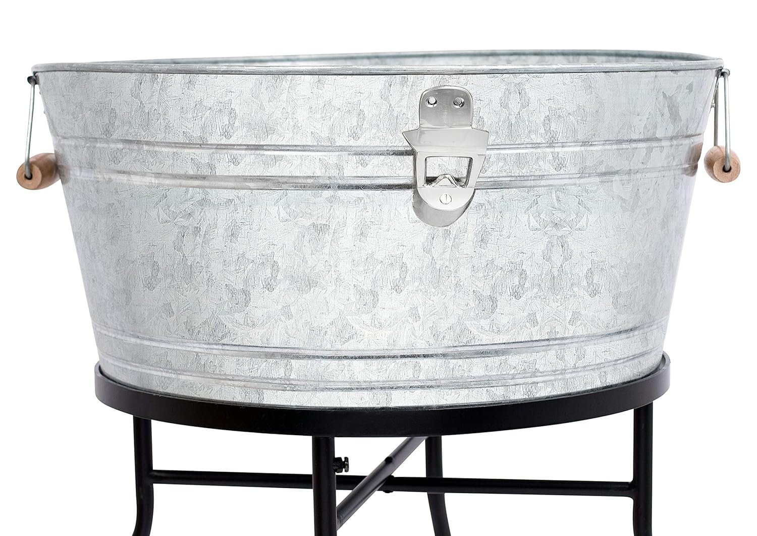 The BirdRock Home Galvanized Beverage Tub with Stand is an ideal solution for keeping drinks cold at parties. It features a sturdy metal stand for elevated display and includes an attached bottle opener. The tub can hold over 25 bottles of soda, beer, or water, and up to 10 wine or champagne bottles. It easily detaches from the stand for cleaning and has convenient wooden handles for transport. Measuring 21 inches in diameter and 12.8 inches in height, it combines functionality with style for gatherings. Rated 4.5 stars from 164 reviews, it proves to be a popular choice.