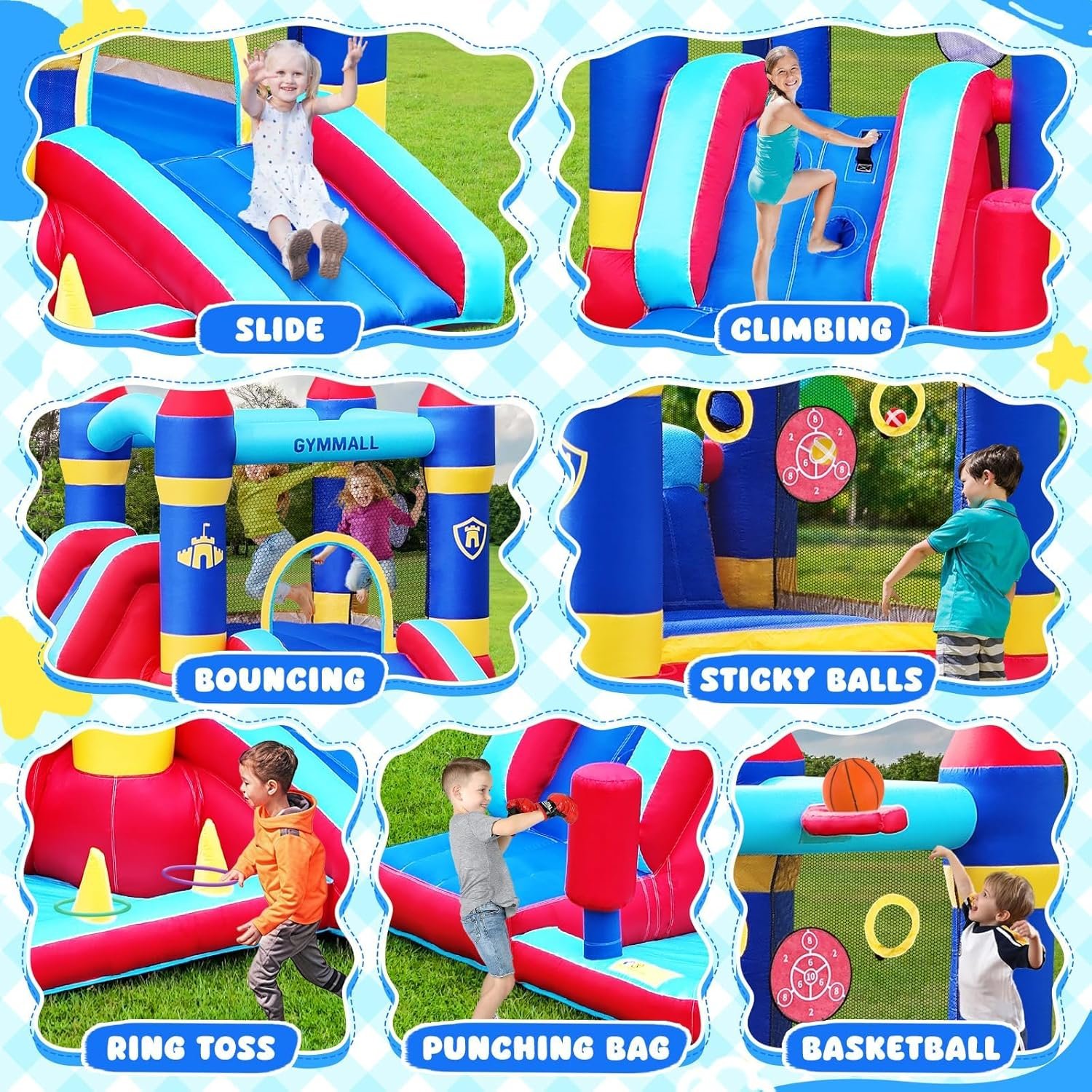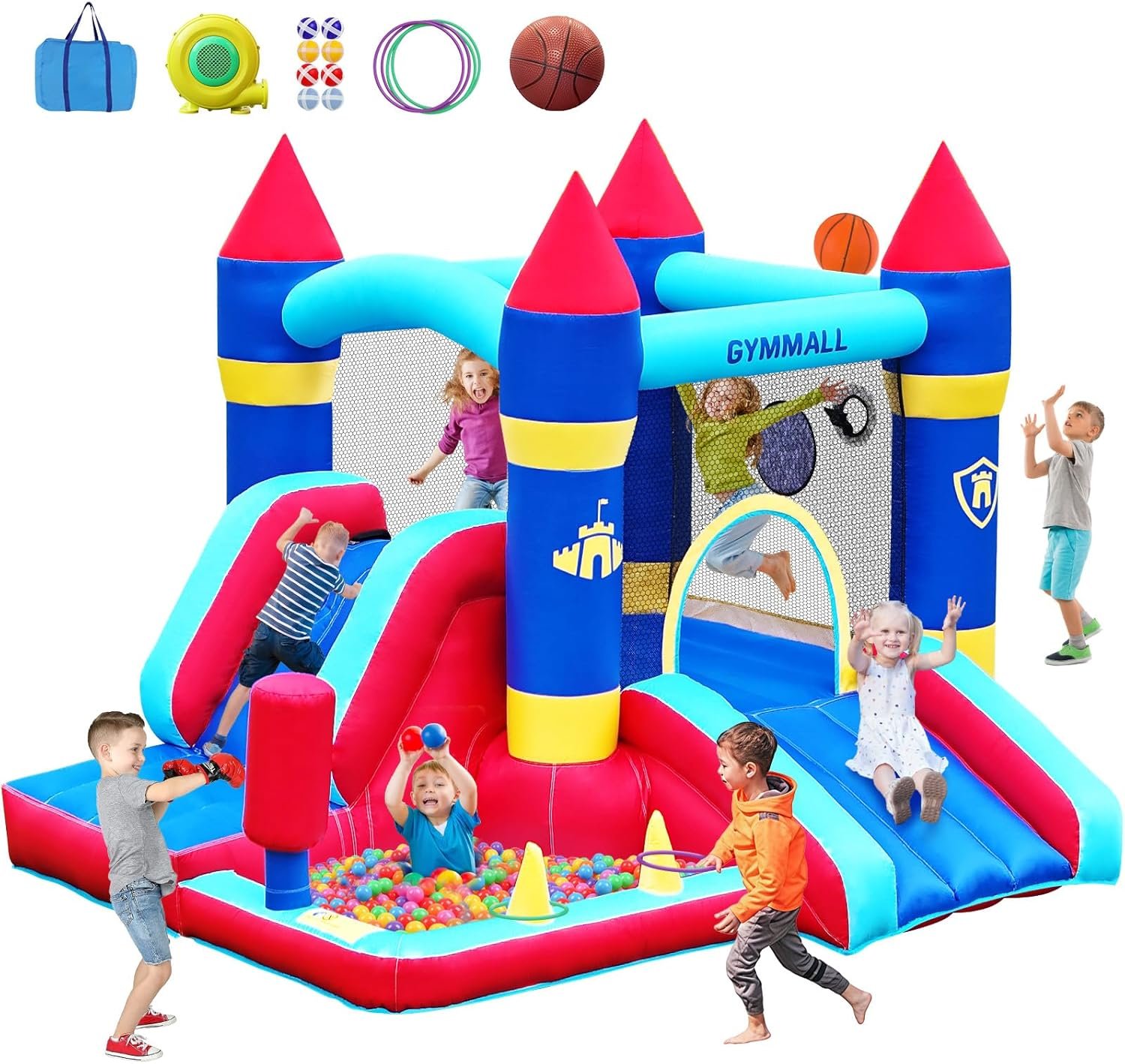 The All-in-One Bounce House measures 9×8.7×7 FT and features various play areas including a jumping space, slide, ball pit, climbing wall, and games like ring toss. Ideal for kids aged 3-10, it promotes exercise, social interaction, and is perfect for parties and events. The protective net ensures safety during play, and its durable 840D Oxford cloth construction makes it long-lasting. The bouncy castle comes with all necessary accessories, including an air blower, storage bags, and a repair kit. It can be used indoors or outdoors, offering versatility for family fun.