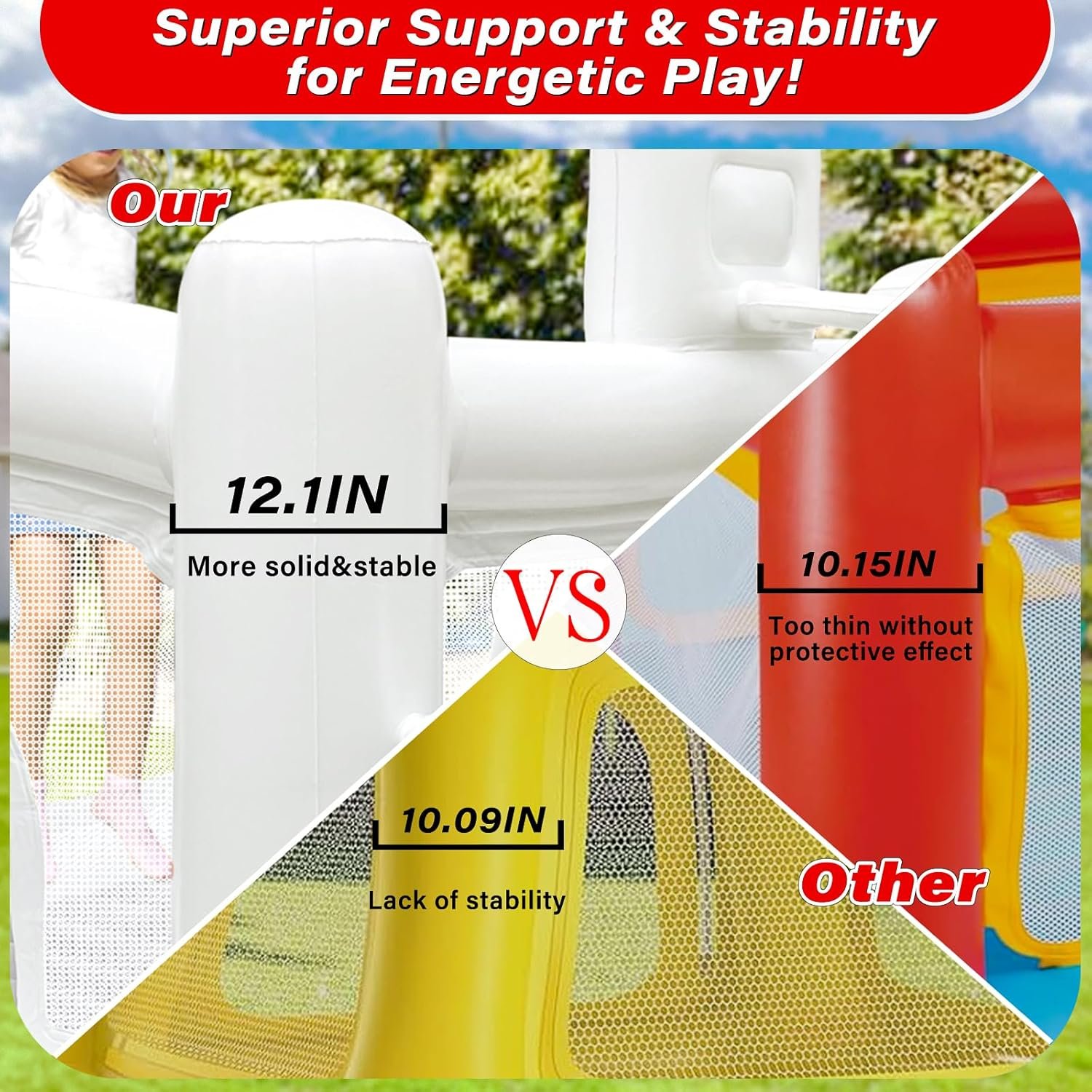 The premium bouncy castle is designed for safety and durability, featuring robust air columns and puncture resistance. Measuring 118.11 x 68.9 x 59 inches, it’s suitable for toddlers aged 3-6 and can accommodate three at once. Made from waterproof PVC, it can also serve as a water play area. Equipped with a high-power electric air pump for quick setup and takedown, it’s an ideal gift for various occasions. Important note: The maximum weight limit for two children is 120 lbs to prevent ruptures. Customer service is available for any inquiries.