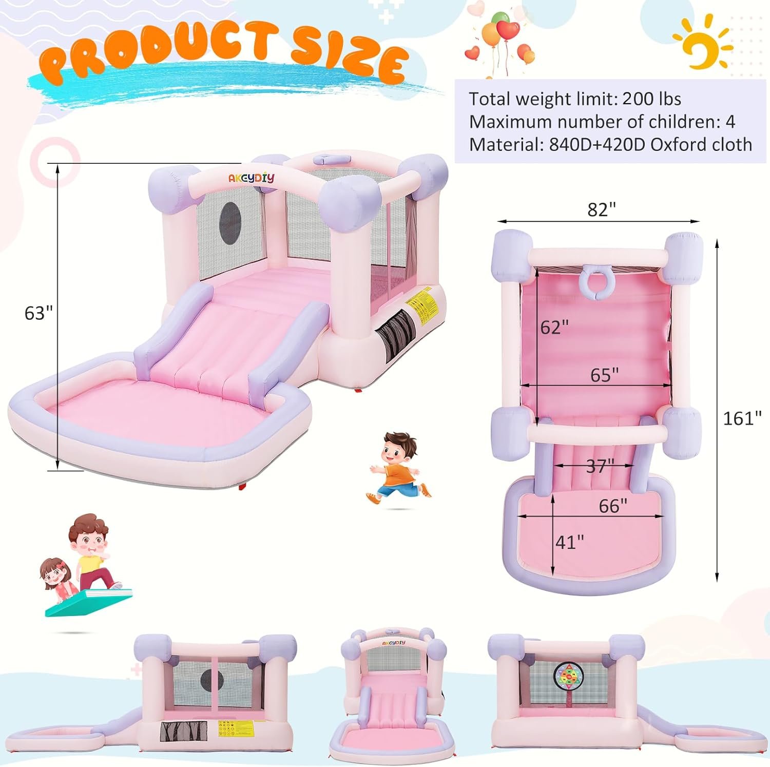 The Macaron Bounce House for Kids features a vibrant design with multiple play areas, including a slide, ball pit, dart target, and basketball hoop, ensuring endless fun. Measuring 161x82x63 inches and accommodating 2-4 children with a total weight limit of 200 pounds, it promotes active play. Constructed from heavy-duty, puncture-proof material with mesh walls for safety, it includes a blower for inflation and easy setup in under a minute. Ideal for parties, it transforms from a ball pit in winter to a water pool in summer, making it a versatile gift for kids.