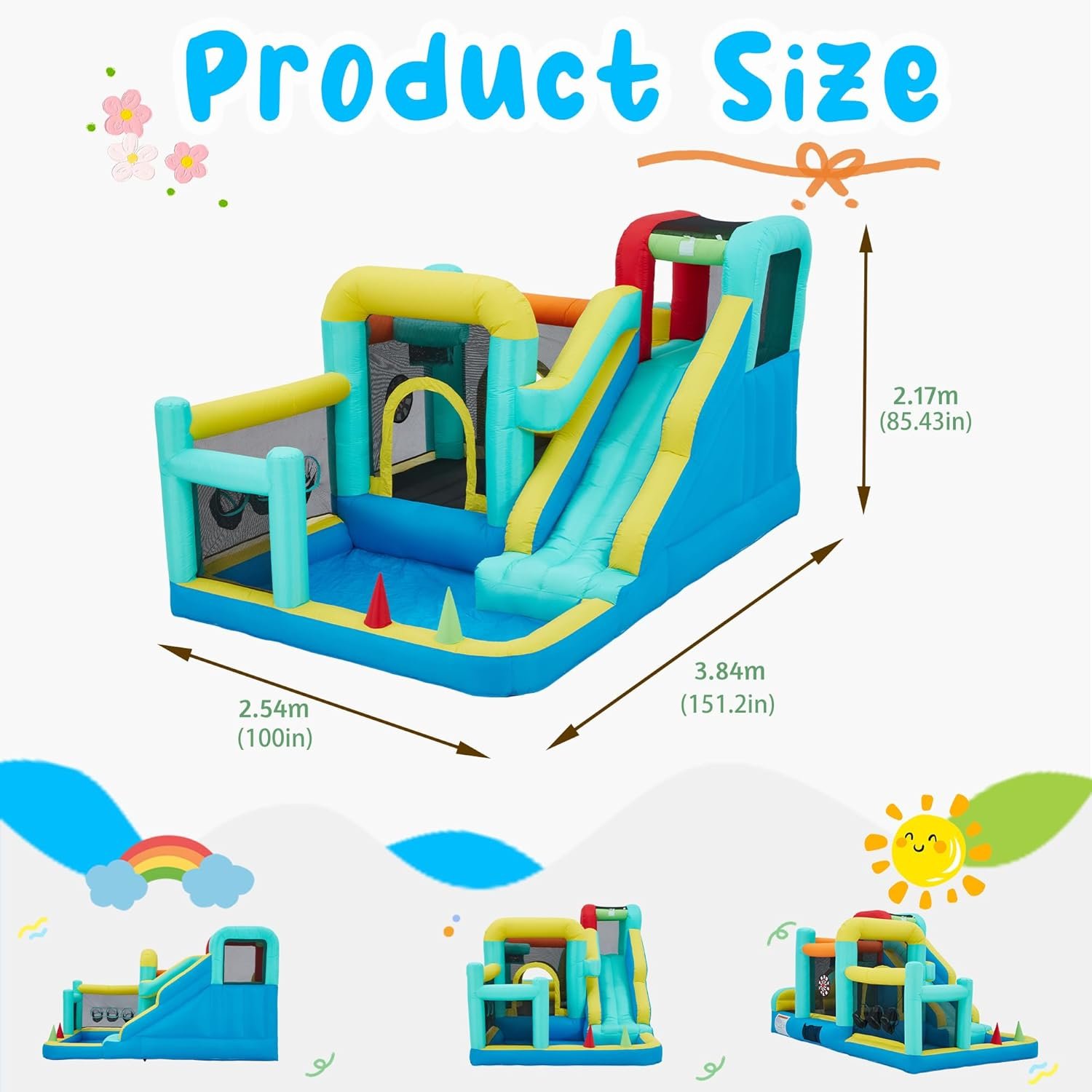 The children’s bounce house features exciting areas like mysterious obstacle poles, slides, trampolines, and basketball hoops, ensuring hours of fun. Quick inflation with a 550W blower and easy portability make it perfect for any setting, from backyards to parks!