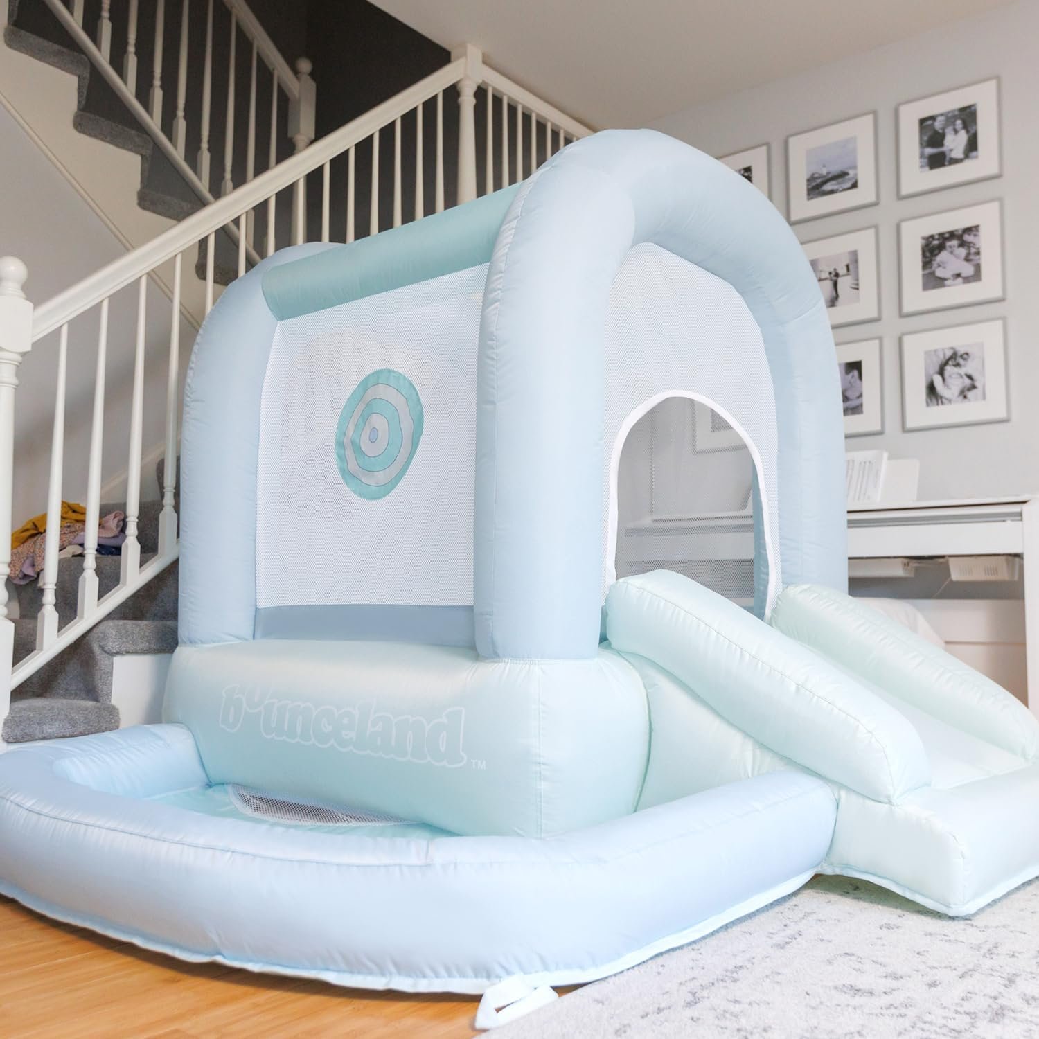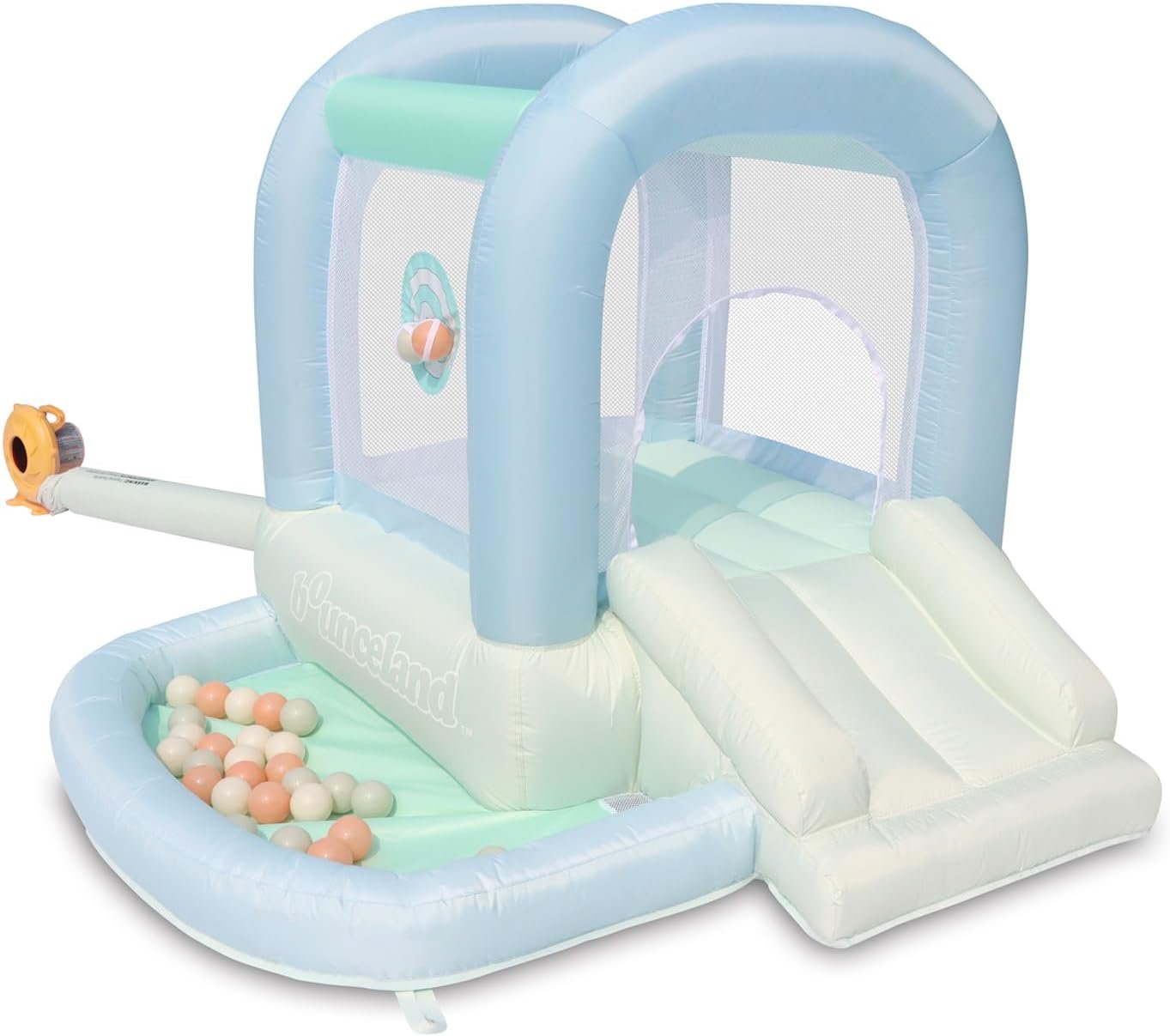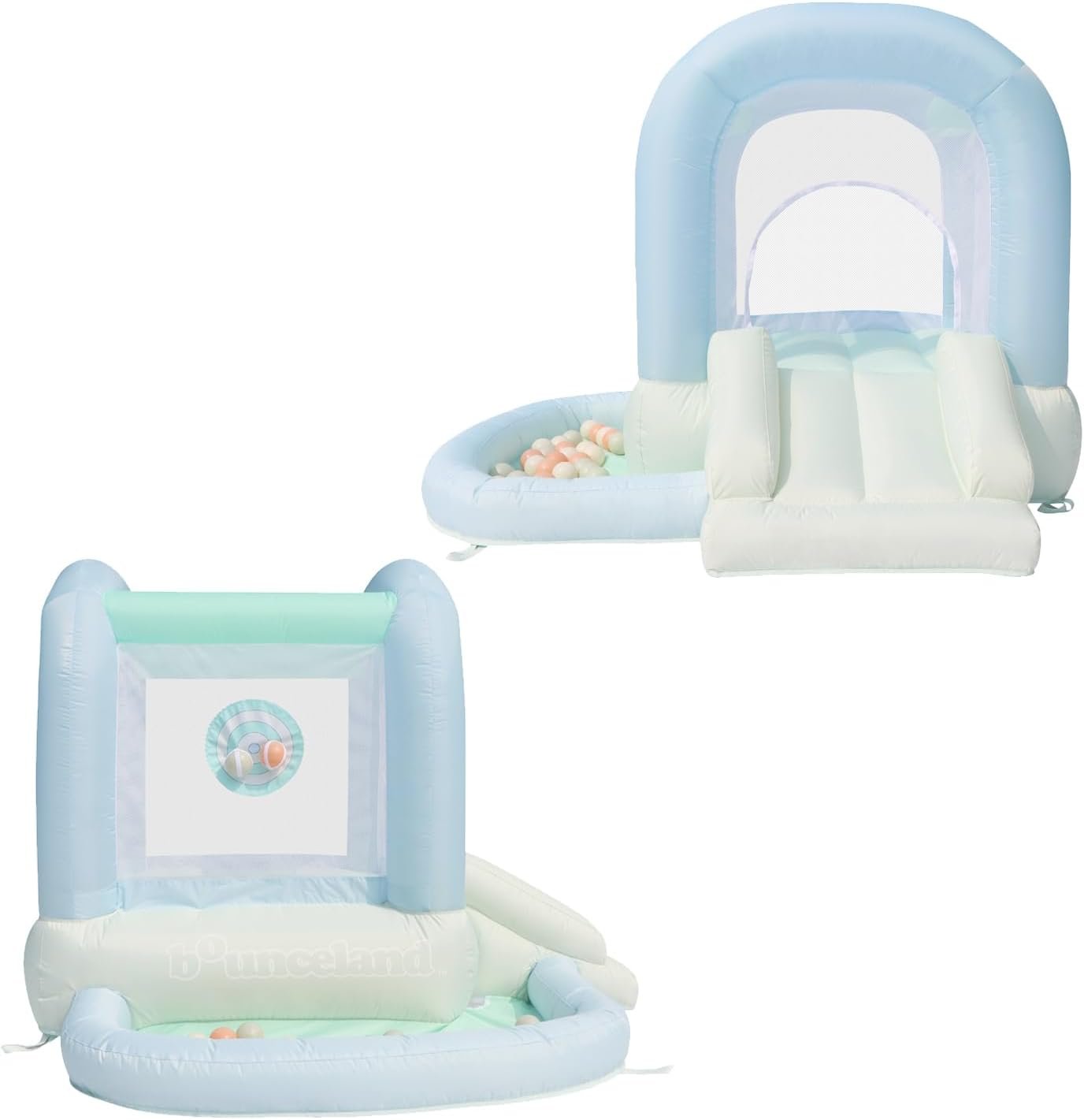 The Bounceland bounce house accommodates up to 2 players (maximum 90 lbs total) and is suitable for ages 1-6. Made from durable commercial-grade PVC and Laminated Oxford Terylene, it features a GFCI-protected blower and includes a basketball hoop, pastel balls, and ground stakes. Easy to set up, it inflates in under a minute and is ideal for indoor and outdoor use. Safety certified (ASTM and UL) and backed by a 90-day warranty, it promotes physical activity and social play. Prices range from $179 to $396.